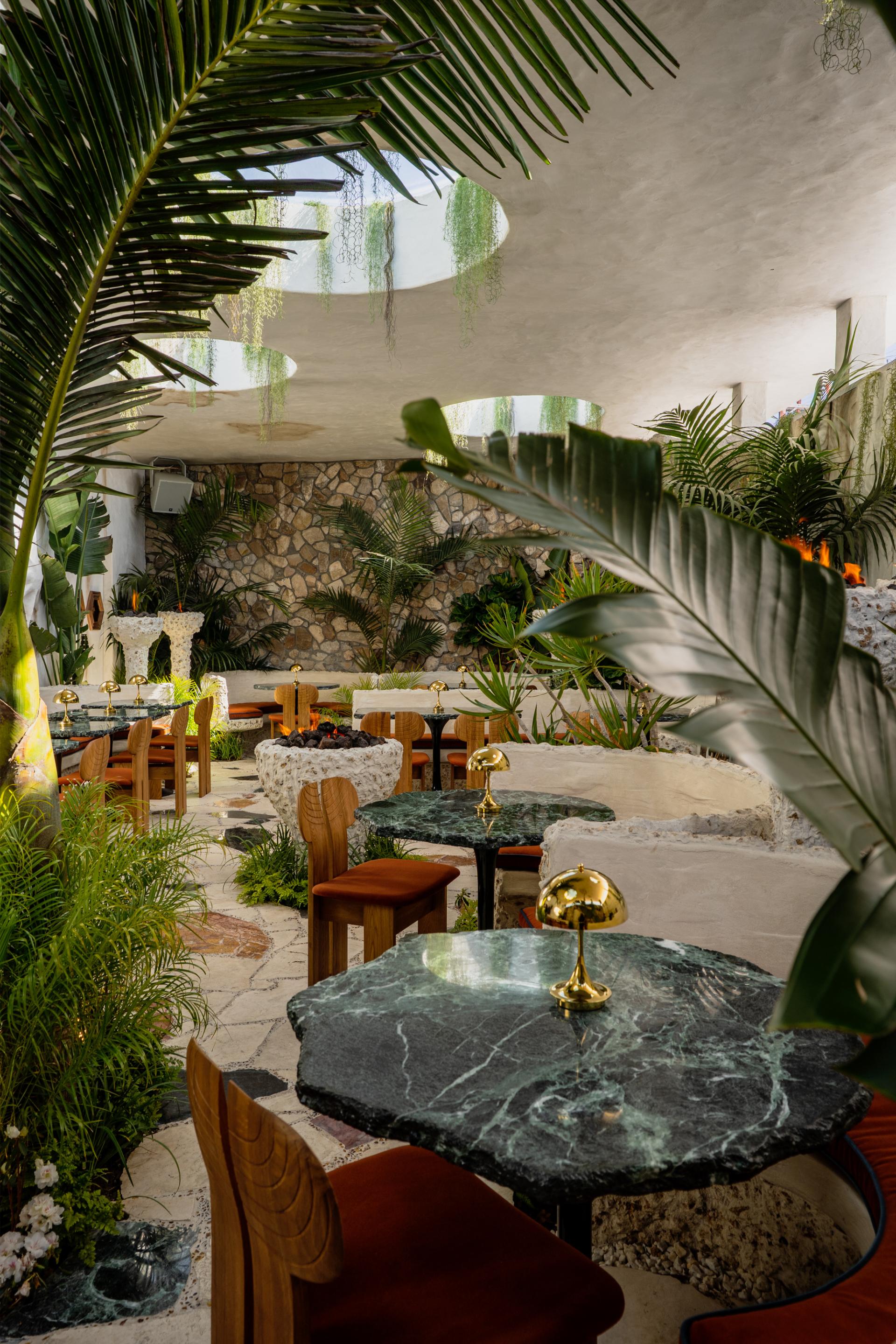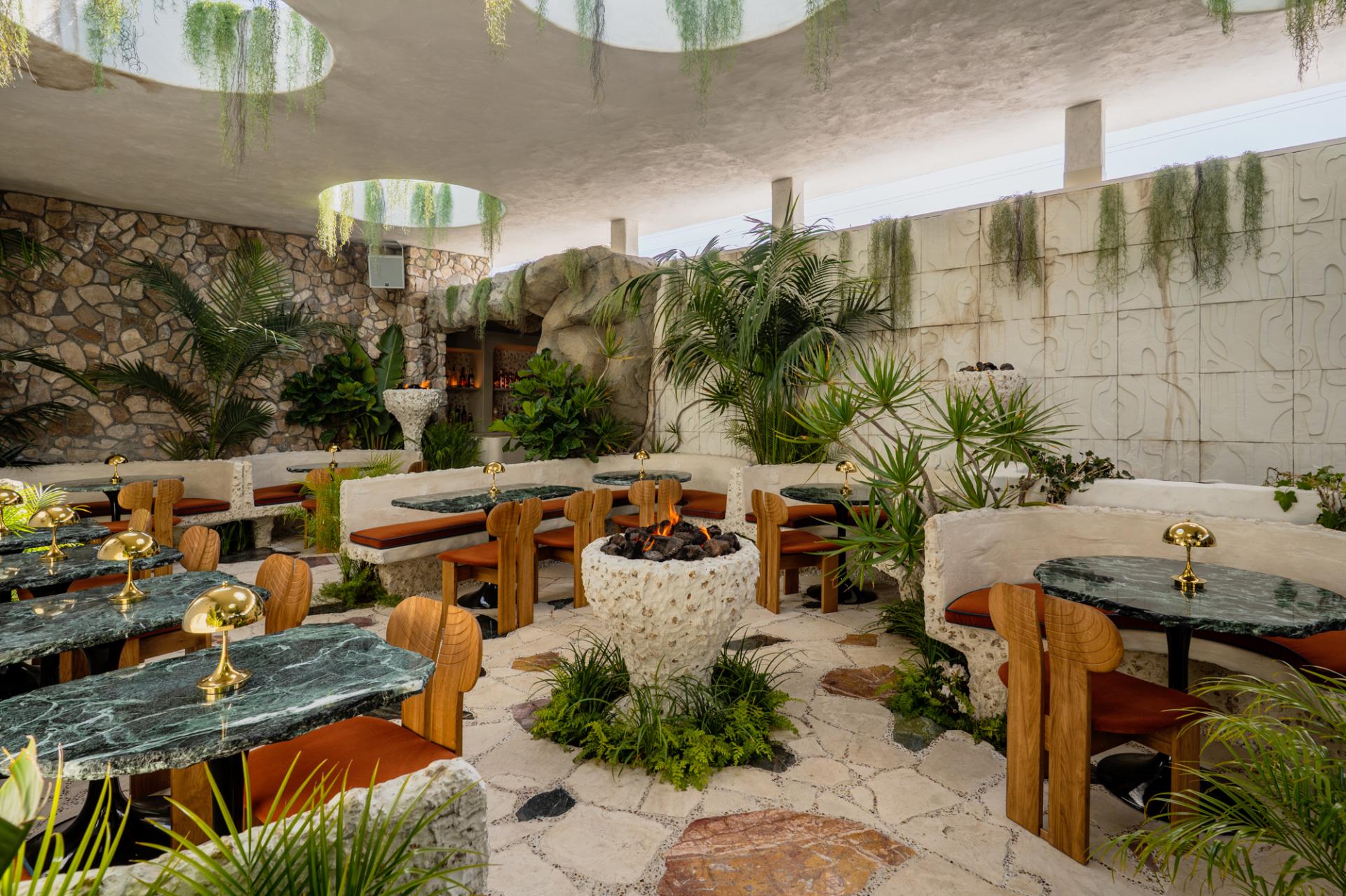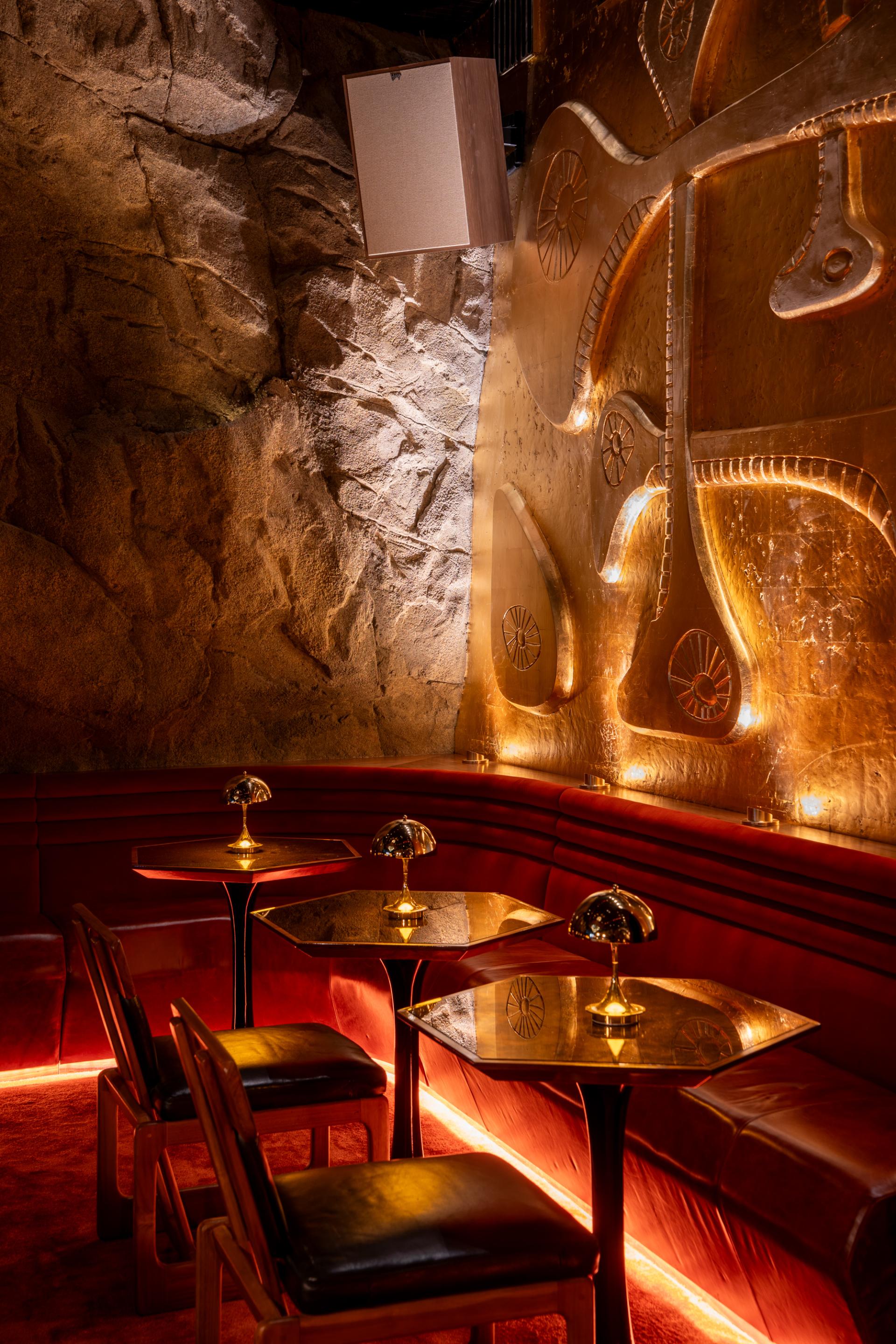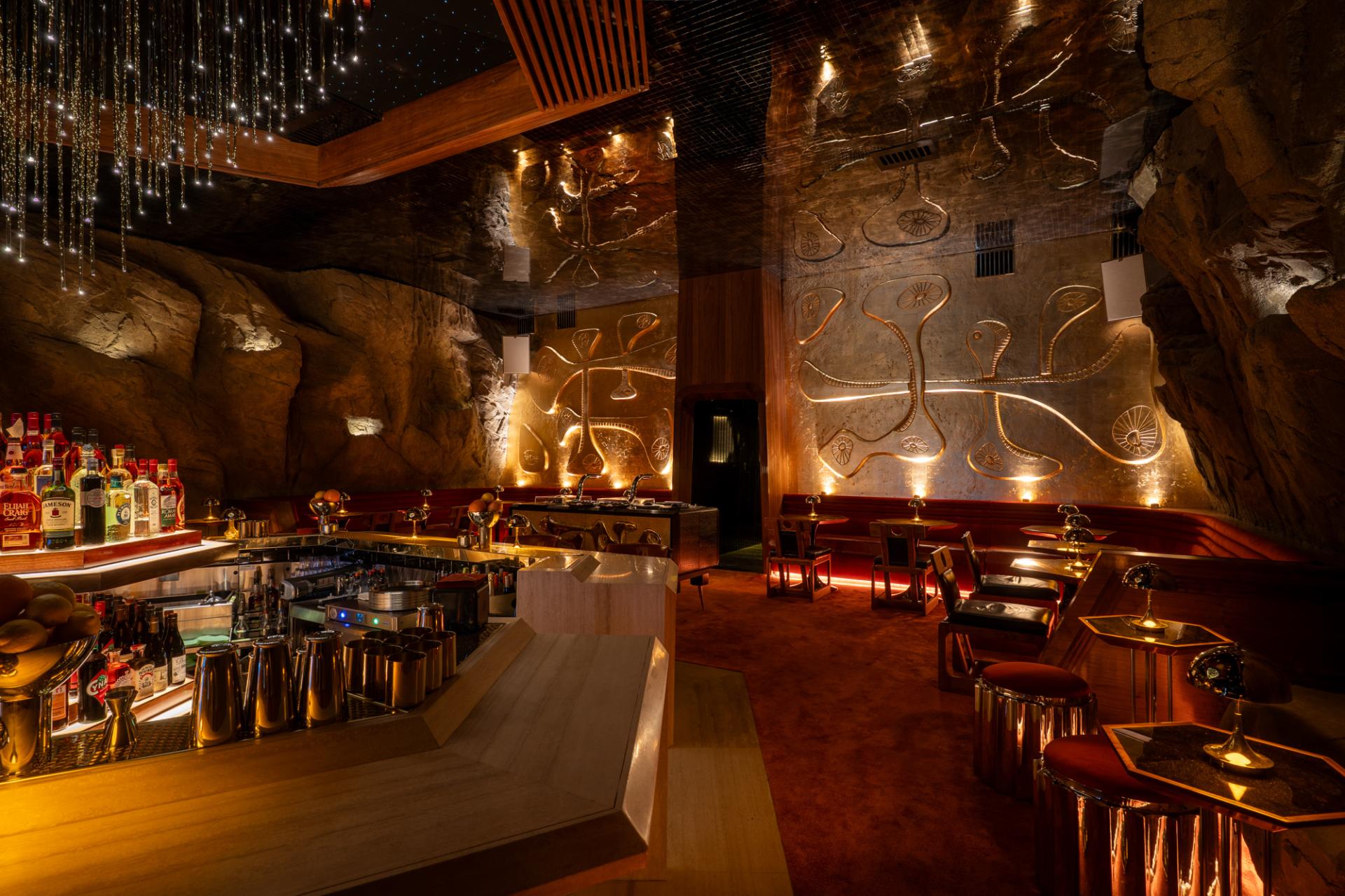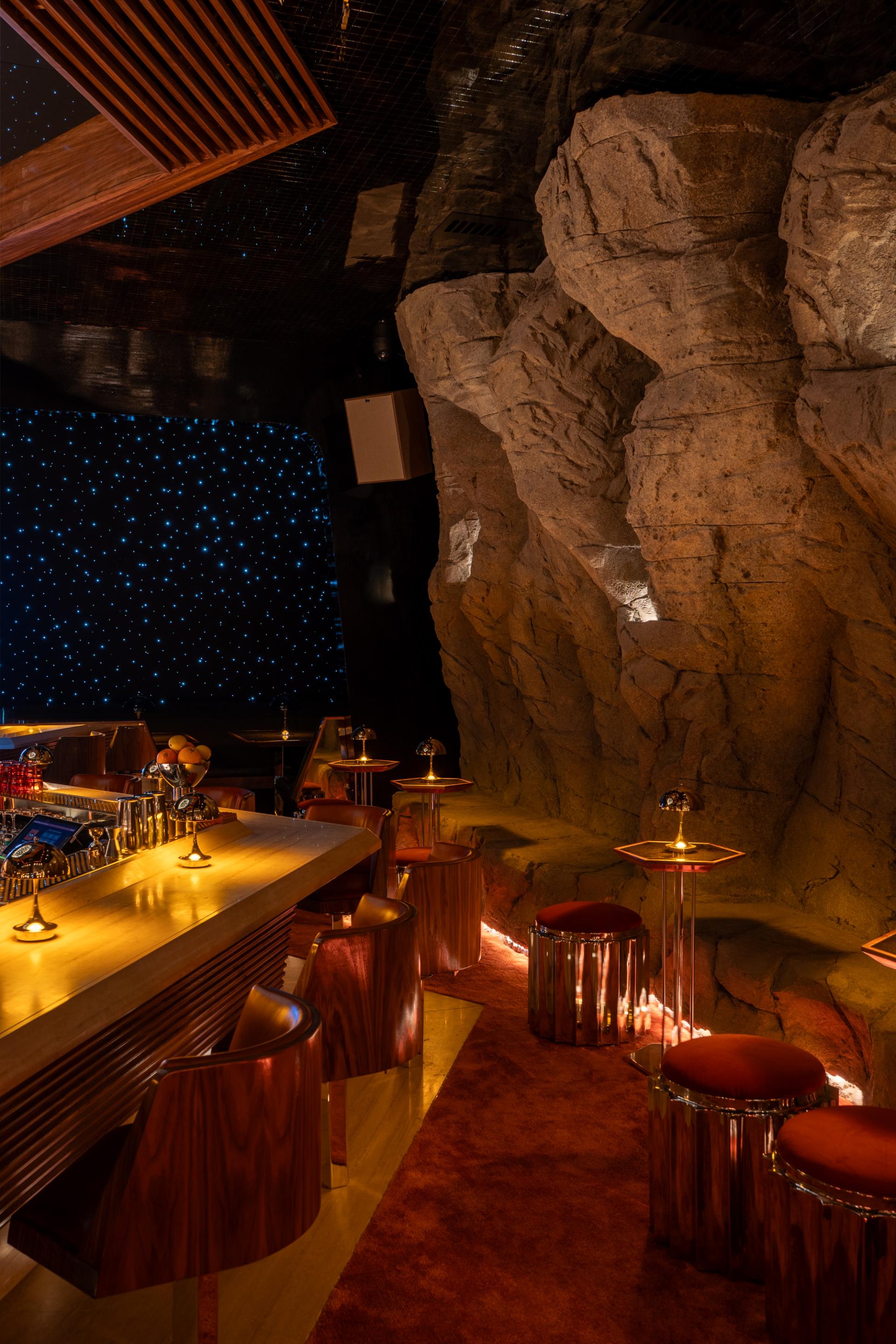The refreshed Starlite pairs raw, imposing rock walls with a softer, tactile palette of rich fabrics and custom furnishings, creating tension between ruggedness and luxury that amplifies the drama of the space. At its center, a sculptural hexagonal bar in travertine and wood anchors the room beneath a chandelier reminiscent of a starry constellation, nodding both to the bar’s name and its cinematic inspirations. Warm tones of copper, walnut, and velvet evoke grounded luxury, while a mirrored ceiling deepens the subterranean, cave-like ambiance and enhances the guest’s visual experience.
