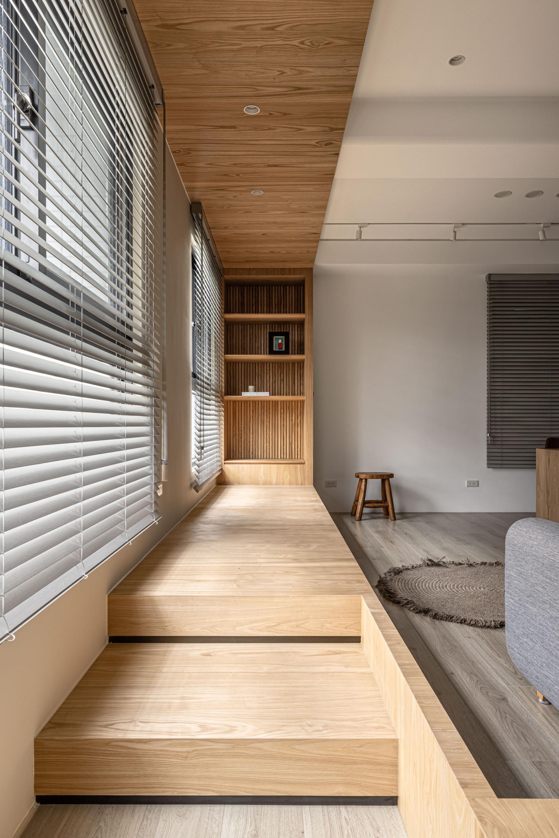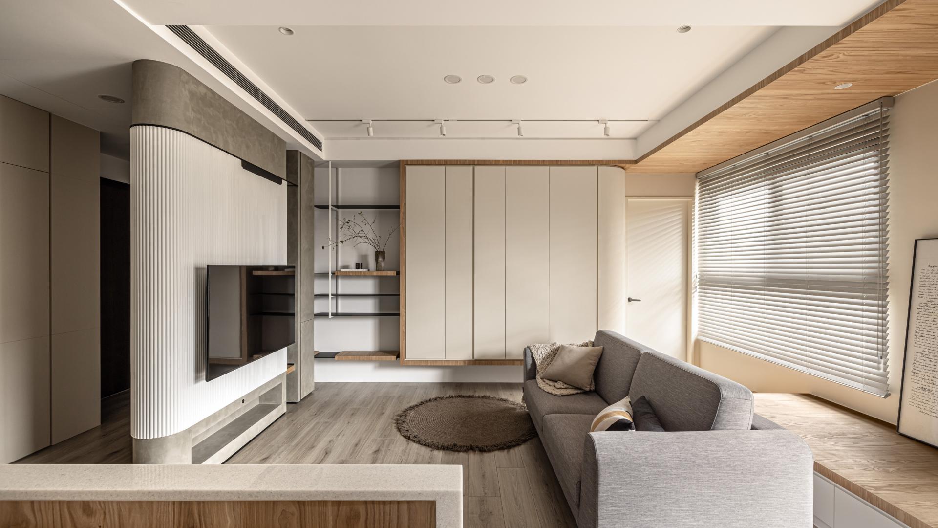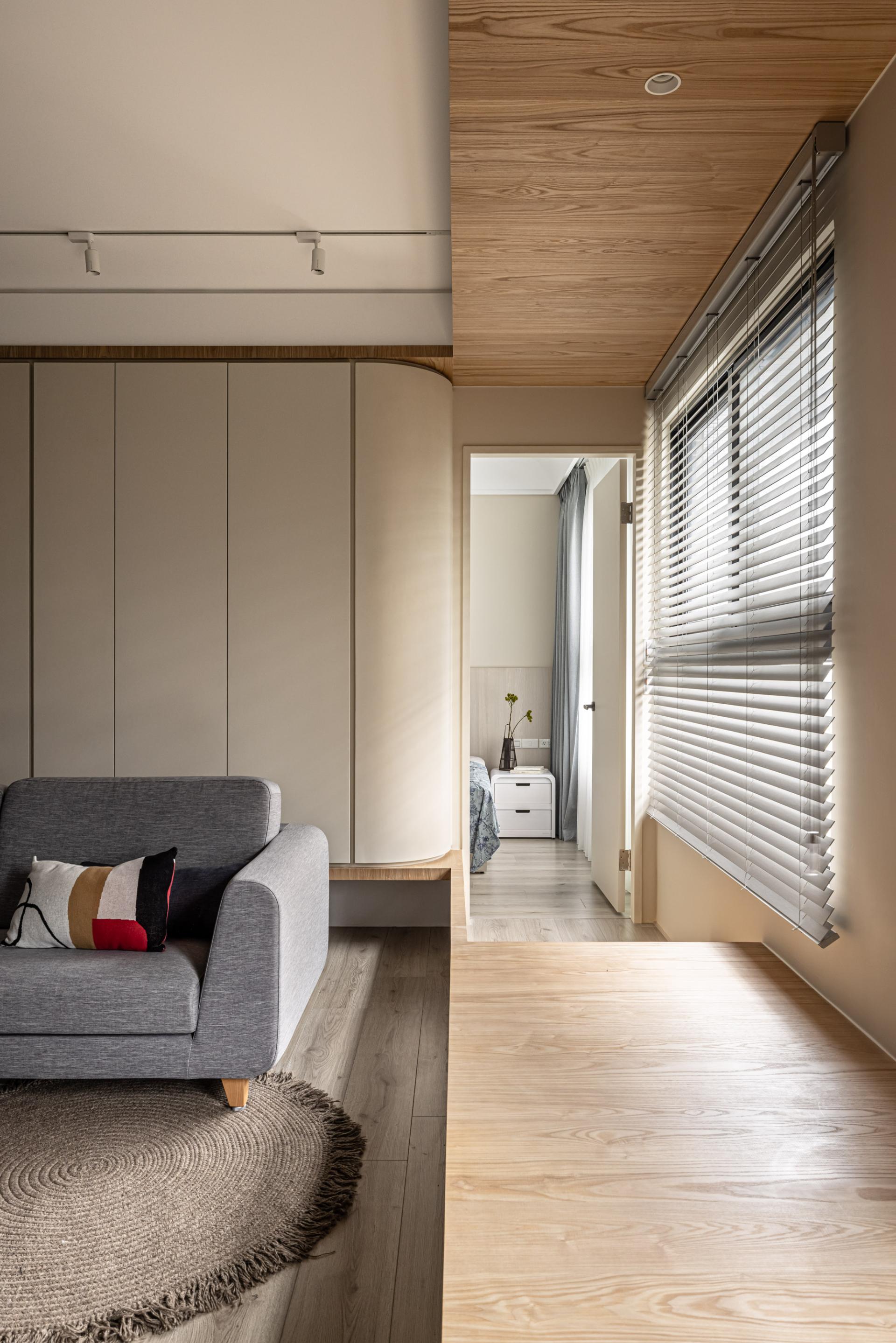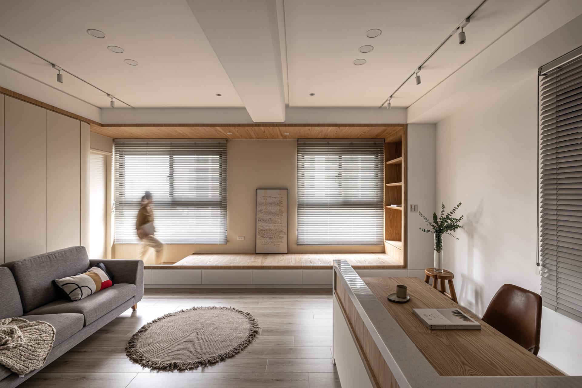 A T-shaped beam compresses the space and enhances visual comfort, guiding the focus to a scenic platform by the window. Two framed views are created by opening up the shared area, successfully resolving the single direction of the layout. The wall by the entrance is installed with the TV, then defines the foyer by extending through various living scenes. A raised platform near the window and bedroom door acts as an active circulation into the bedroom and a relaxation area, elongating the boundary between shared and private spaces, serving as a transition buffer in mental transition.