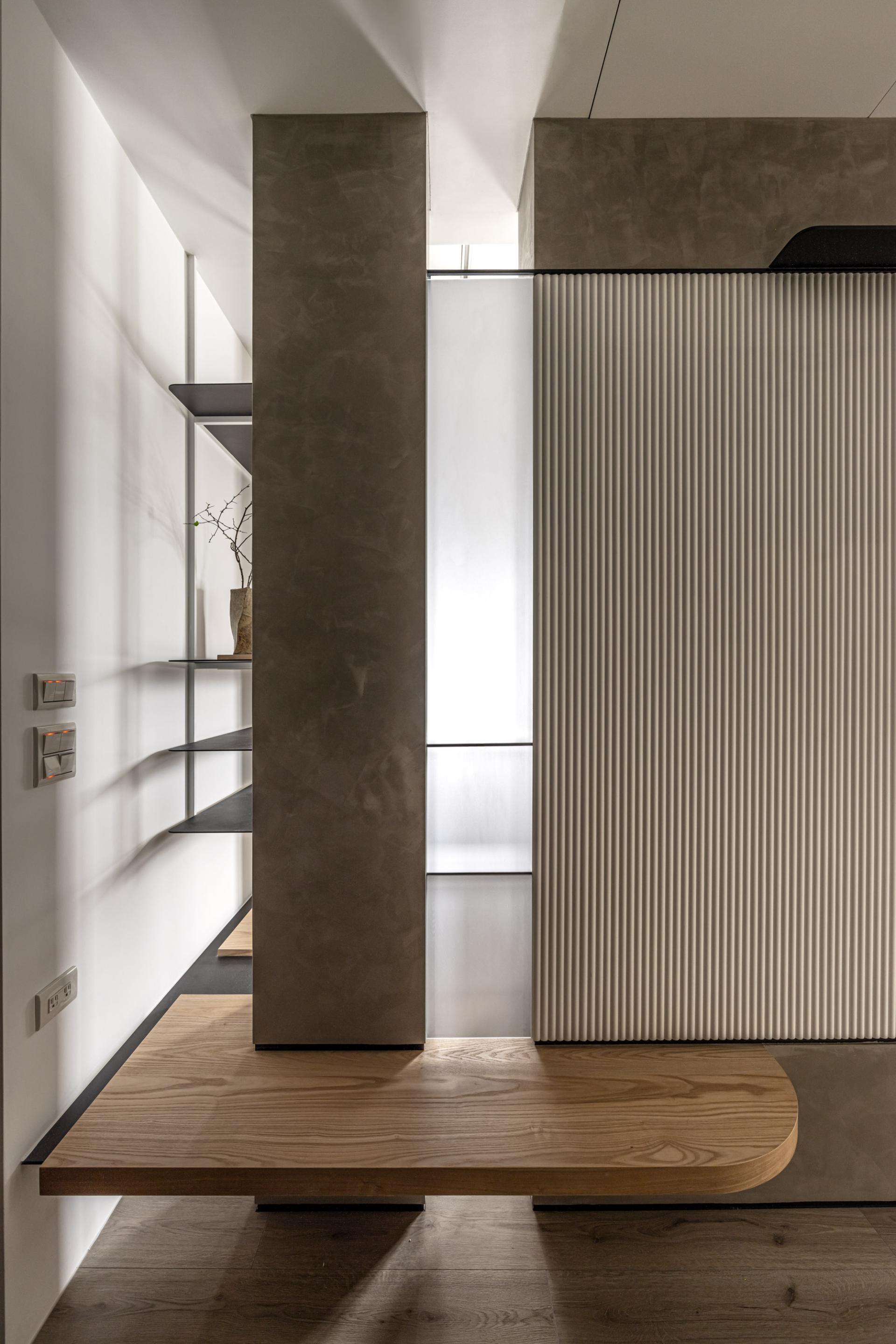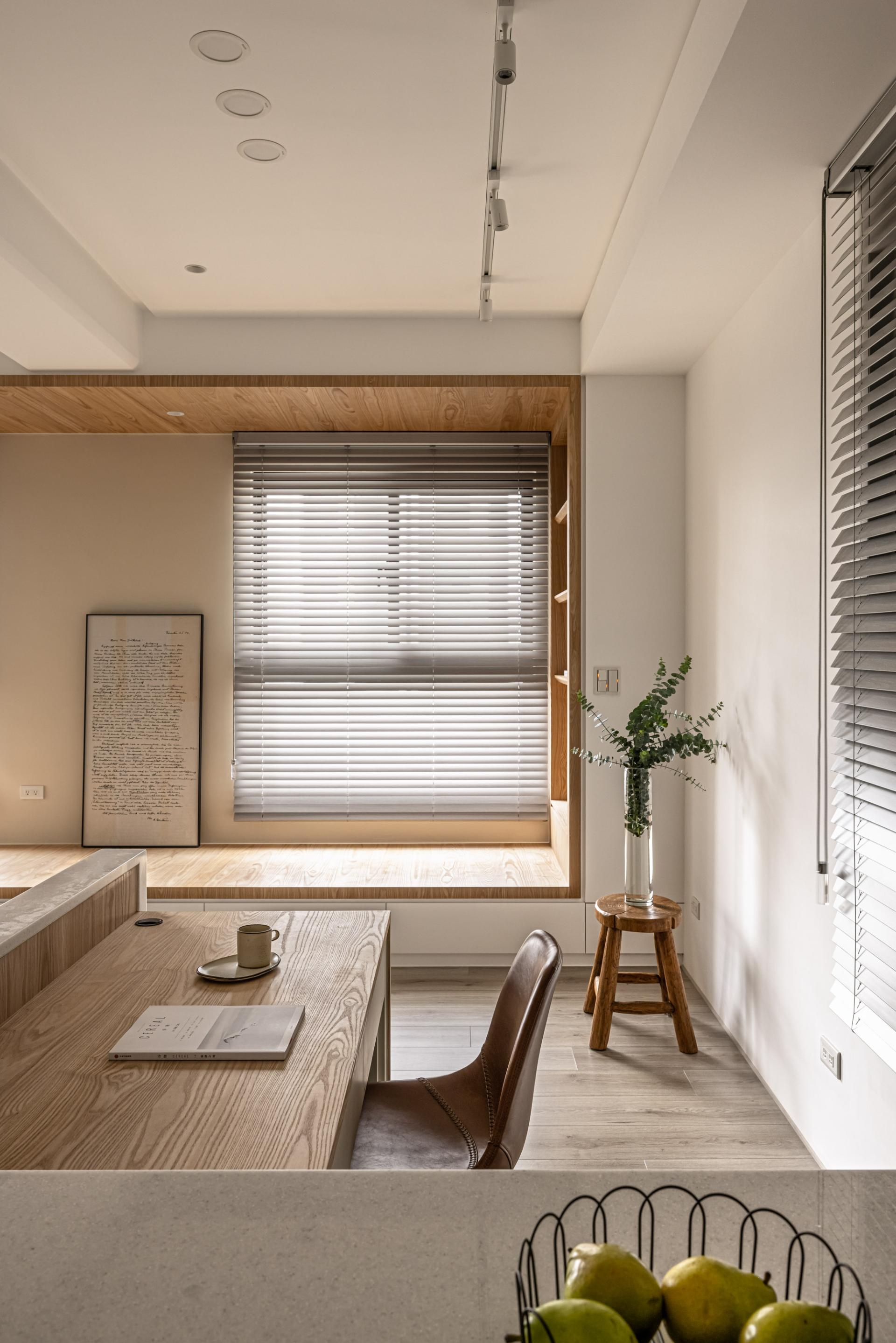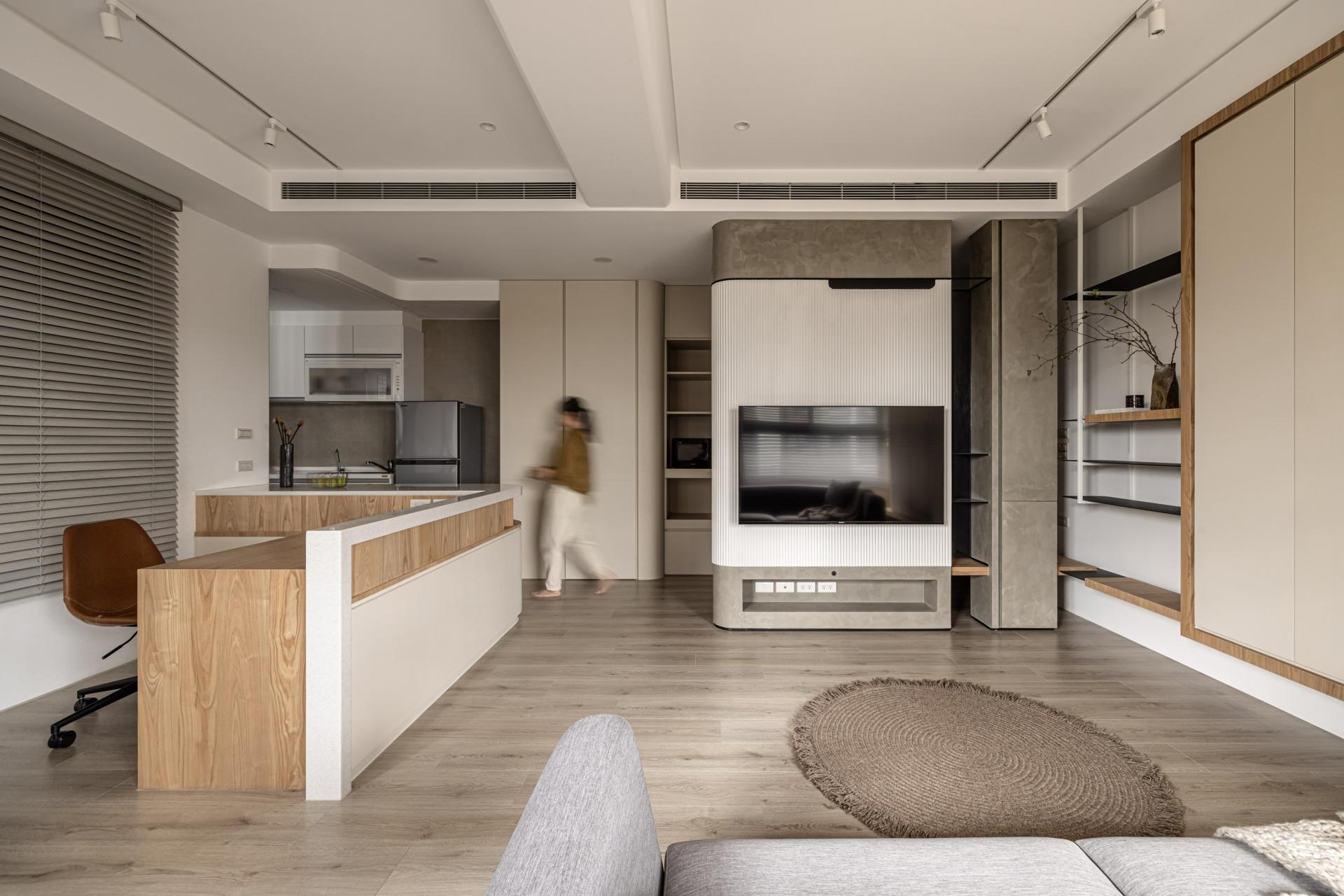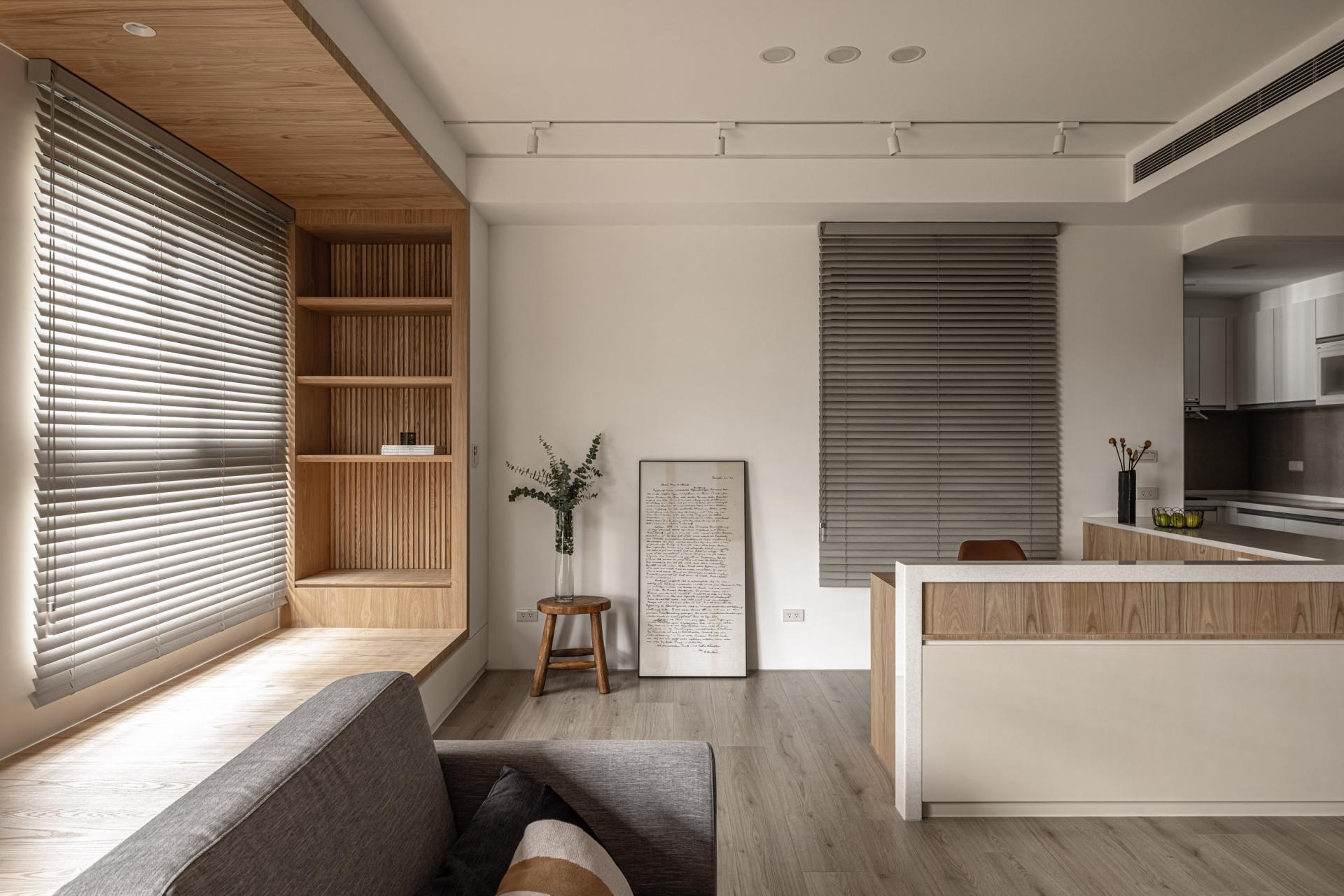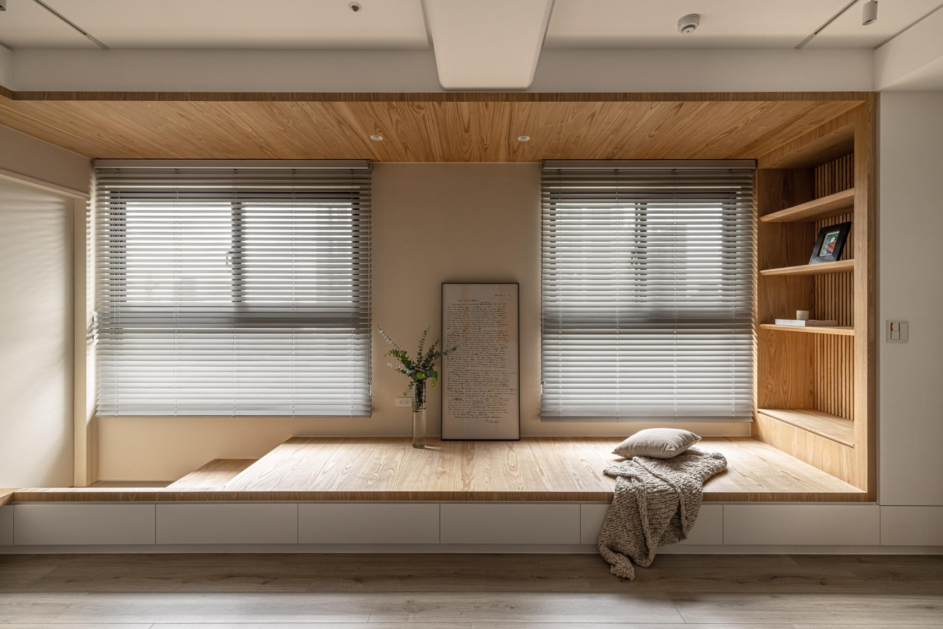 A T-shaped beam compresses the space and enhances visual comfort, guiding the focus to a scenic platform by the window. Two framed views are created by opening up the shared area, successfully resolving the single direction of the layout. The wall by the entrance is installed with the TV, then defines the foyer by extending through various living scenes. A raised platform near the window and bedroom door acts as an active circulation into the bedroom and a relaxation area, elongating the boundary between shared and private spaces, serving as a transition buffer in mental transition.