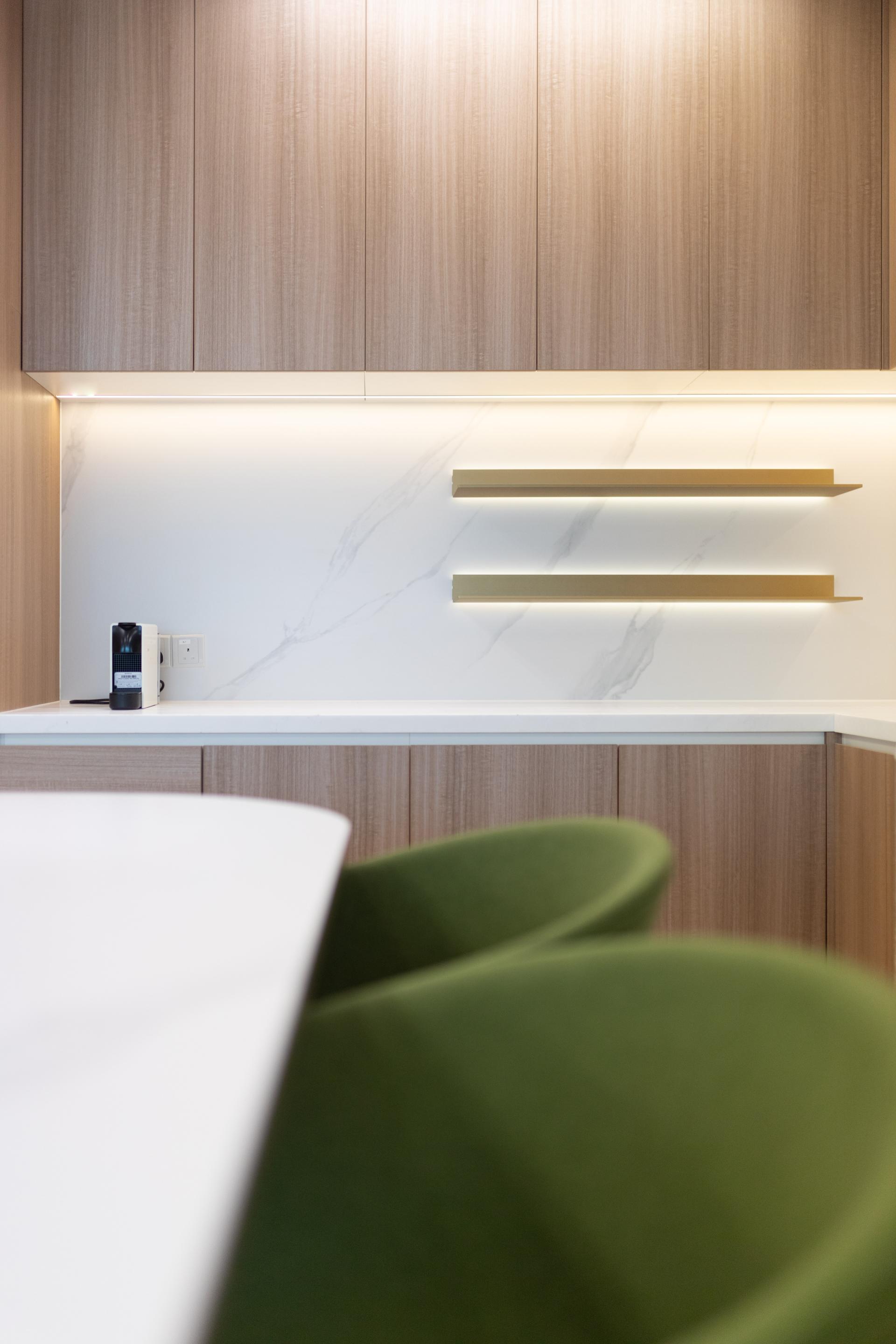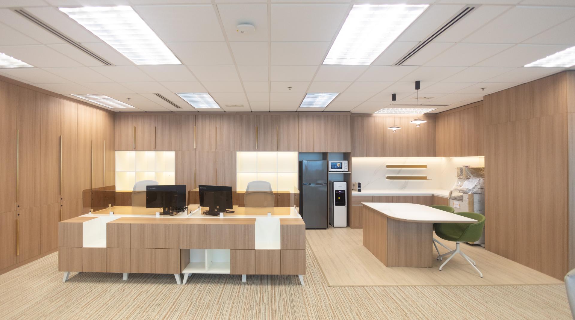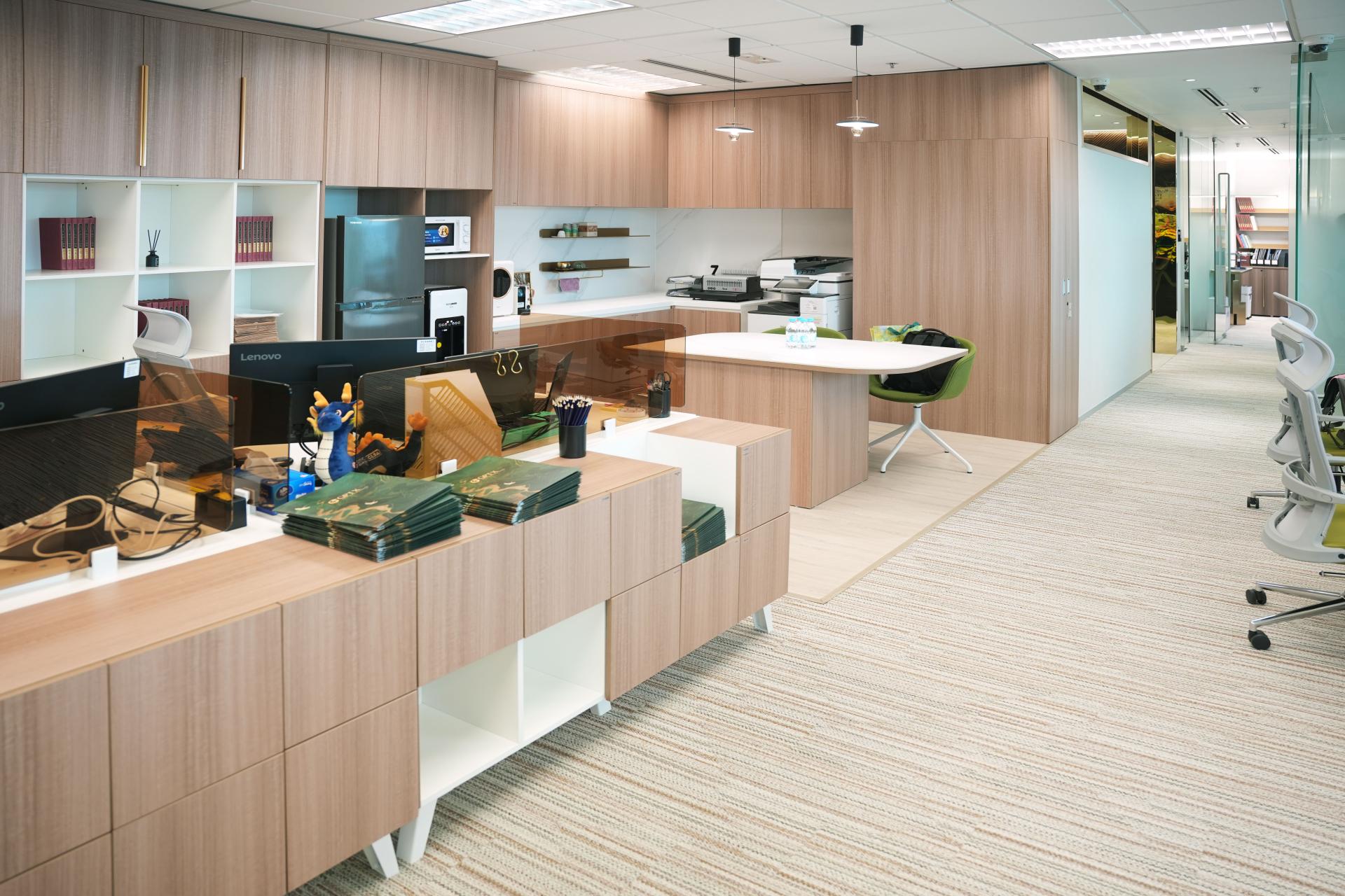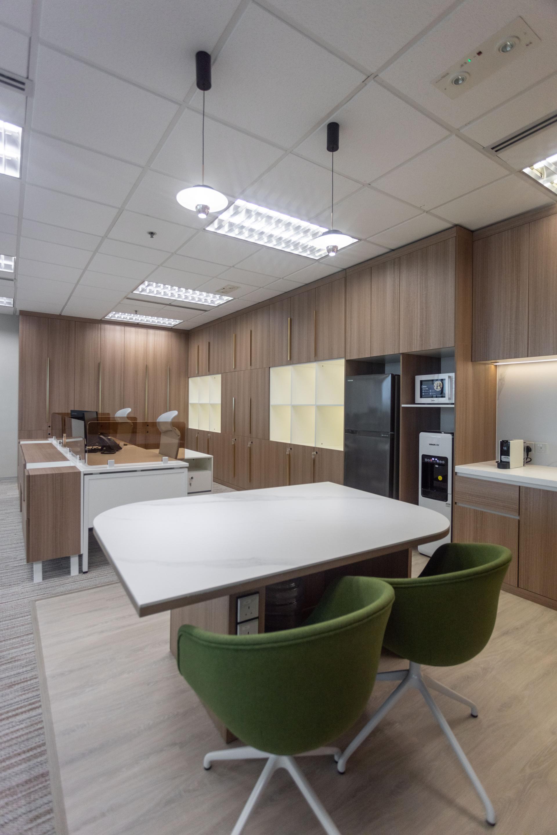 Instead of traditional enclosed and separated zones, I integrated server, plotter, pantry, and storage functions into a continuous wall based cabinet within the compact office, using detached units and damp proof layers to prevent interference. The core of this open zone is a floating marble island. This not only supports varied uses but also makes the workspace feel larger and adds a warm, residential backdrop. After over a year of use, the client feedbacked this island is the most favorite spot—used for client meetings, discussions, outsource staff working desk, organizing materials, shared lunch and coffee breaks. It quietly encourages interaction and collaboration, giving the office a home like sense of community.