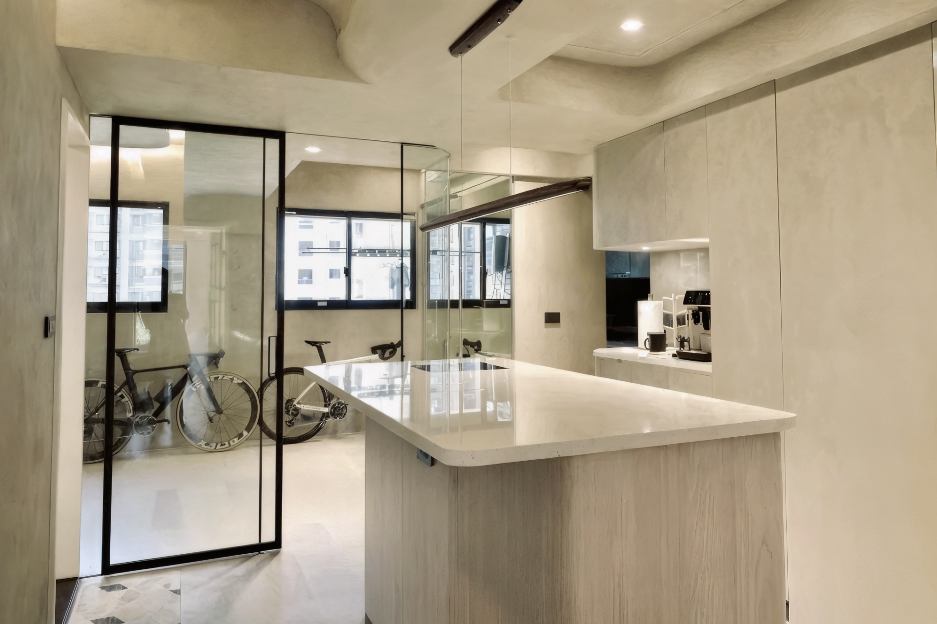 Infinite Micro tackles urban density via "Spatial Elasticity." Strategic mirrors and a pivot wall transform one zone into four: Fitness, Kitchen, Bar, and Living. Merging green coatings with Wabi-Sabi aesthetics, it creates a sustainable, soul-soothing sanctuary for the modern dweller.