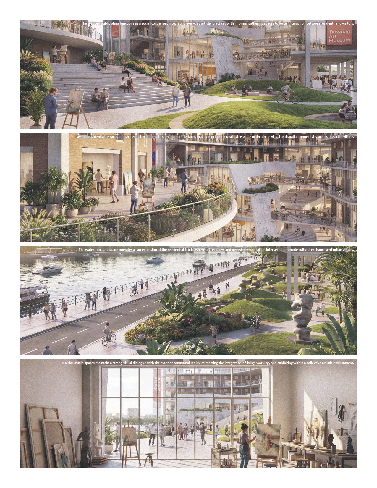 Rather than following closed prototypes of collective housing, the design adopts an inside-out strategy in which incubators and maker spaces become the generative core of the village. Ground floors host open studios, craft workshops, media labs, and vocational counseling operated in partnership with the Taoyuan Art Museum. Curators and professionals run training programs, residency exchanges, and exhibitions, allowing artistic practice to become an economic engine. Rent is partly subsidized by these micro-economies, so affordability emerges from cultural productivity instead of charity.