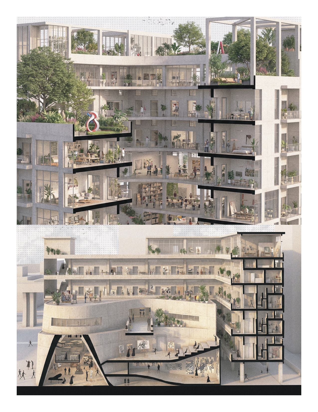 The complex is composed of two coordinated buildings linked by a pedestrian spine functioning as an outdoor gallery extending toward the museum plaza. Transitional rooms between floors—discussion salons, shared kitchens, rehearsal terraces—operate as bridges between museum and home, enabling residents to meet after sunset, debate projects, or teach children painting and migrant languages. Housing units employ a modular shell with Revit-based adaptable partitions, permitting artists to draw work into rooms or return space to quiet domestic rhythms.