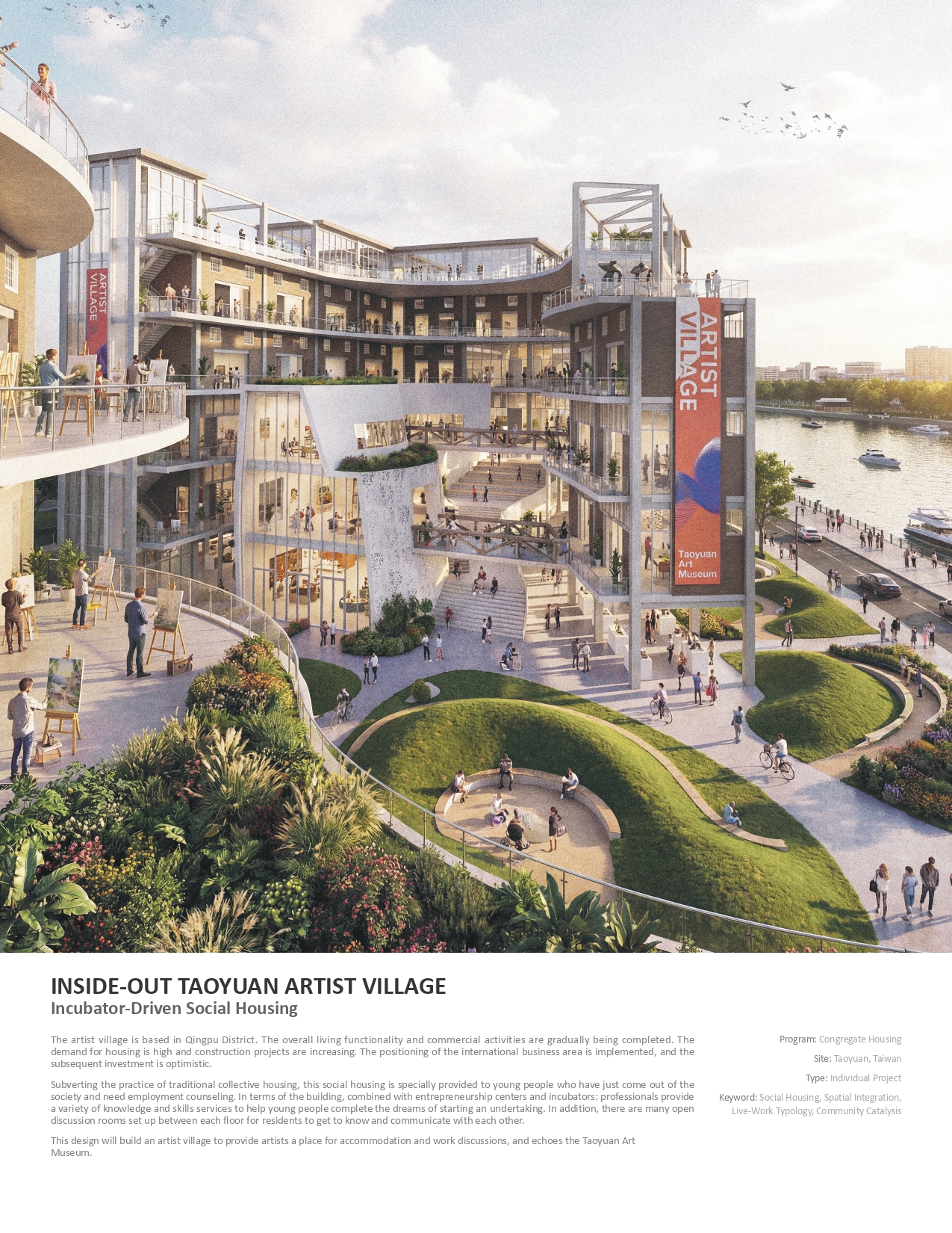 INSIDE-OUT ARTIST VILLAGE – Incubator-Driven Social Housing envisions Qingpu District as a landscape where dwelling grows from artistic imagination and everyday solidarity. The district is consolidating as an international business area; boulevards, metro lines, and commercial facilities are gradually reaching completion, while continuous investment fuels construction. Beneath this optimistic development, many young people entering society confront unstable employment and high rents. The project responds by redefining social housing as a living atelier—where the right to live is protected through the power to create.