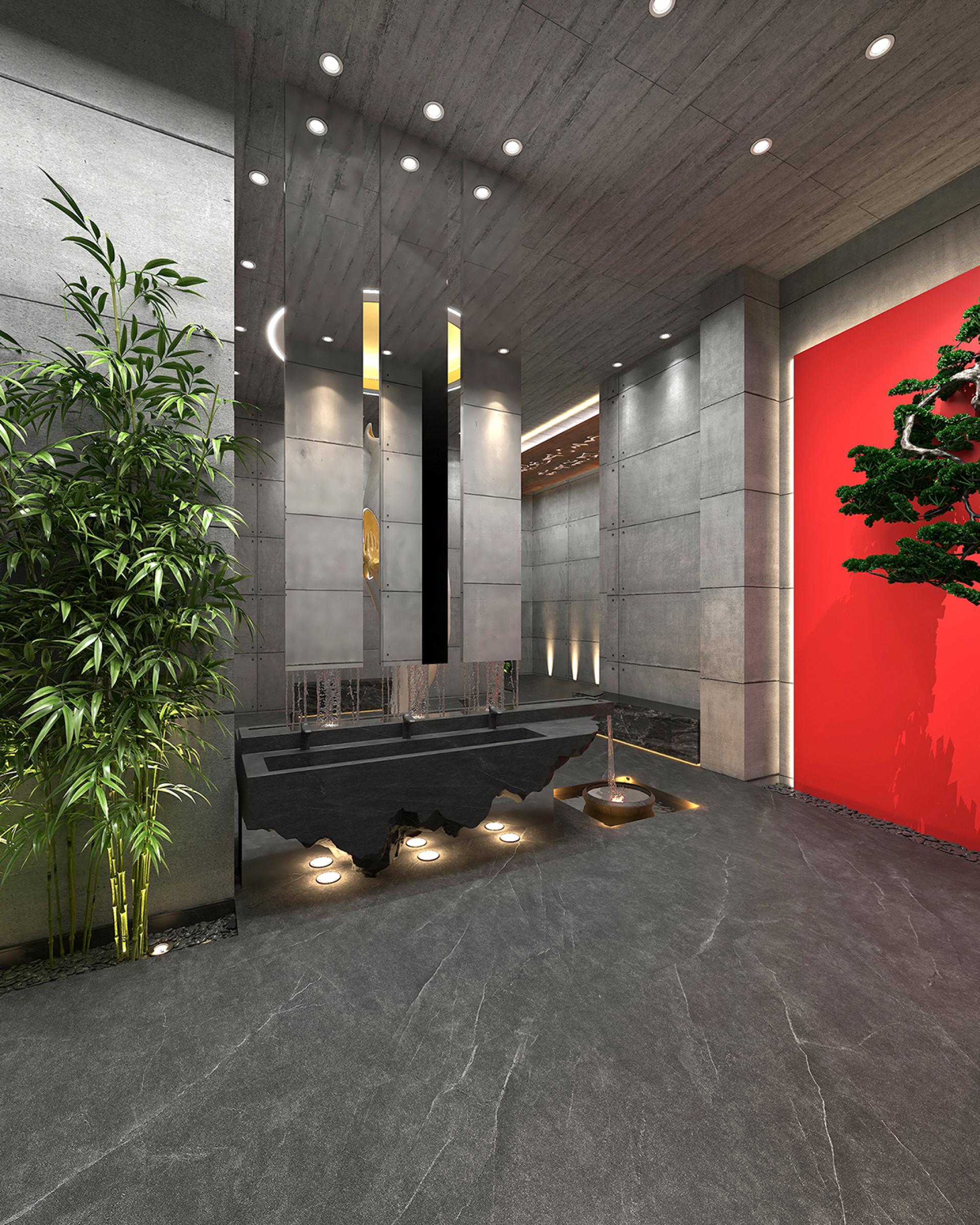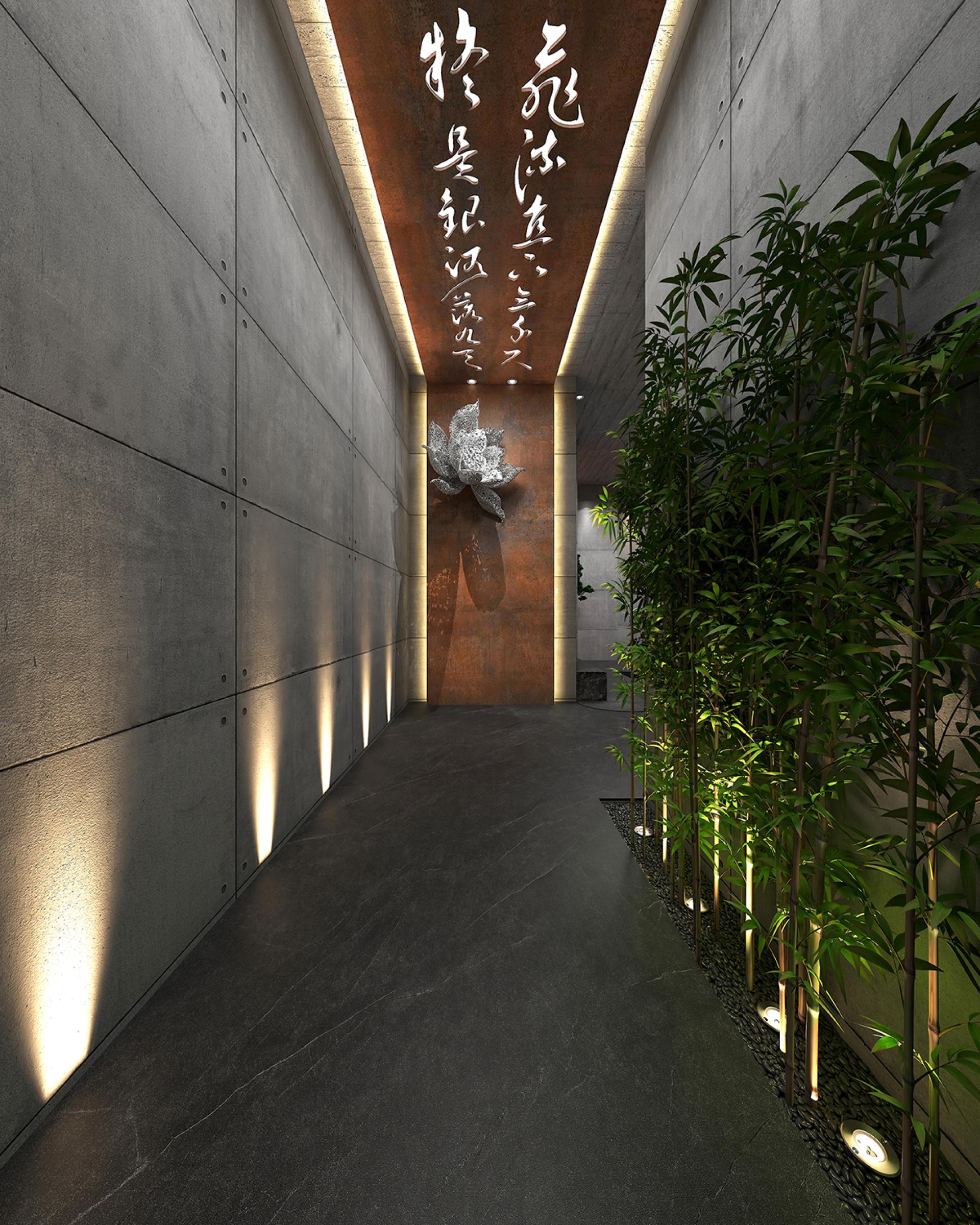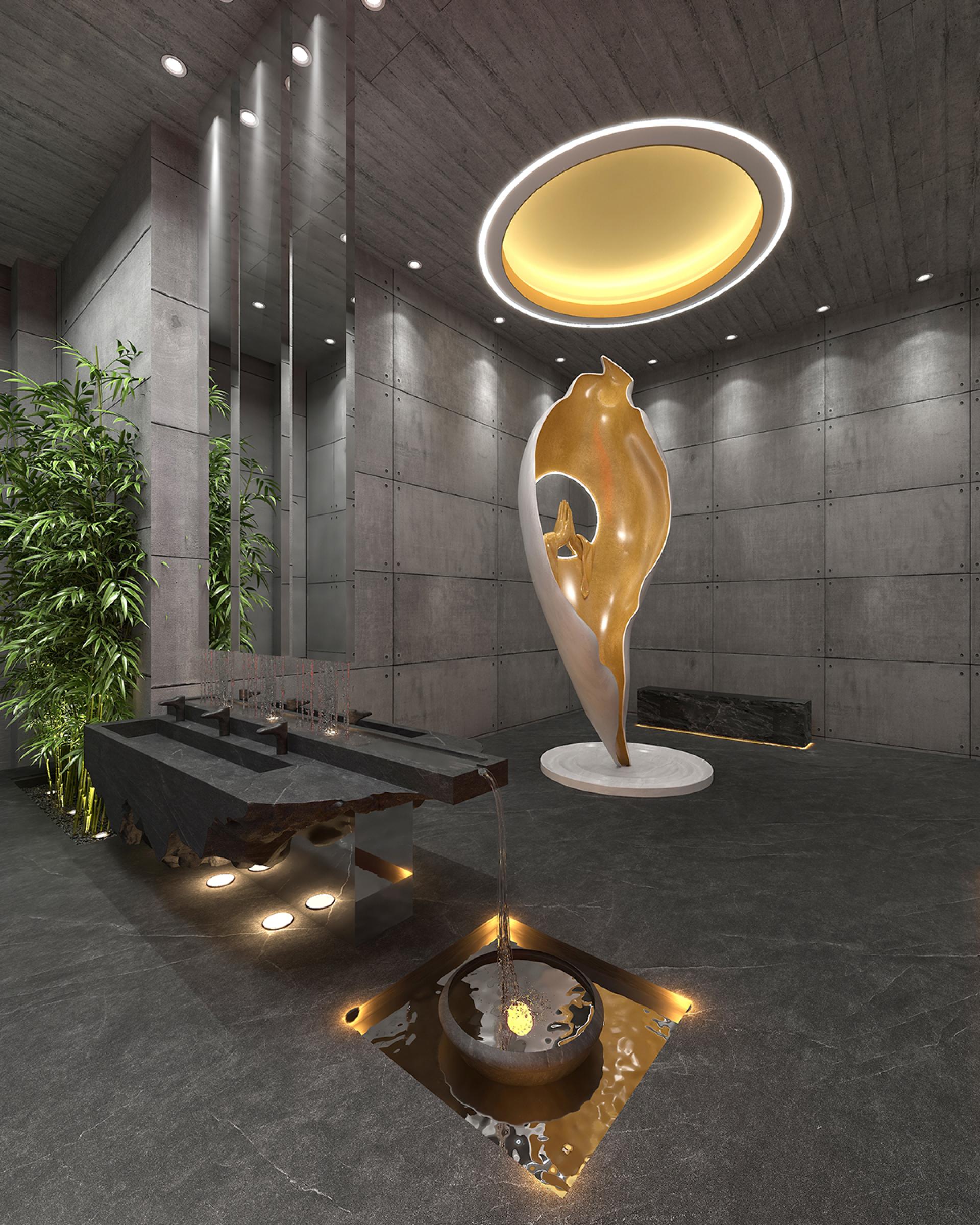 Rooted in temple culture and infused with modern Zen language, the space blends elegance, poetry, and inner comfort. The male area expresses strength through the raw texture of architectural concrete; the entrance cutout featuring Li Bai’s verse and lotus sculpture layers faith with light. The female area resembles a Jiangnan garden—golden lattices, reflections, and fragrance intertwine to evoke gentleness and grace.