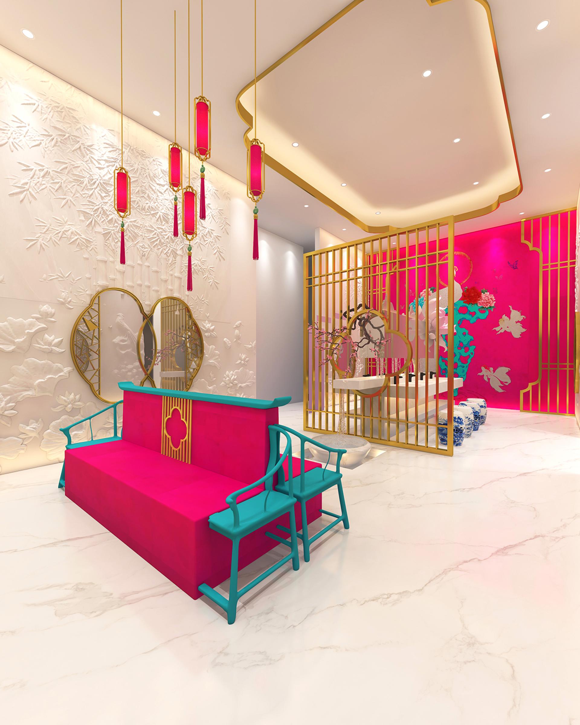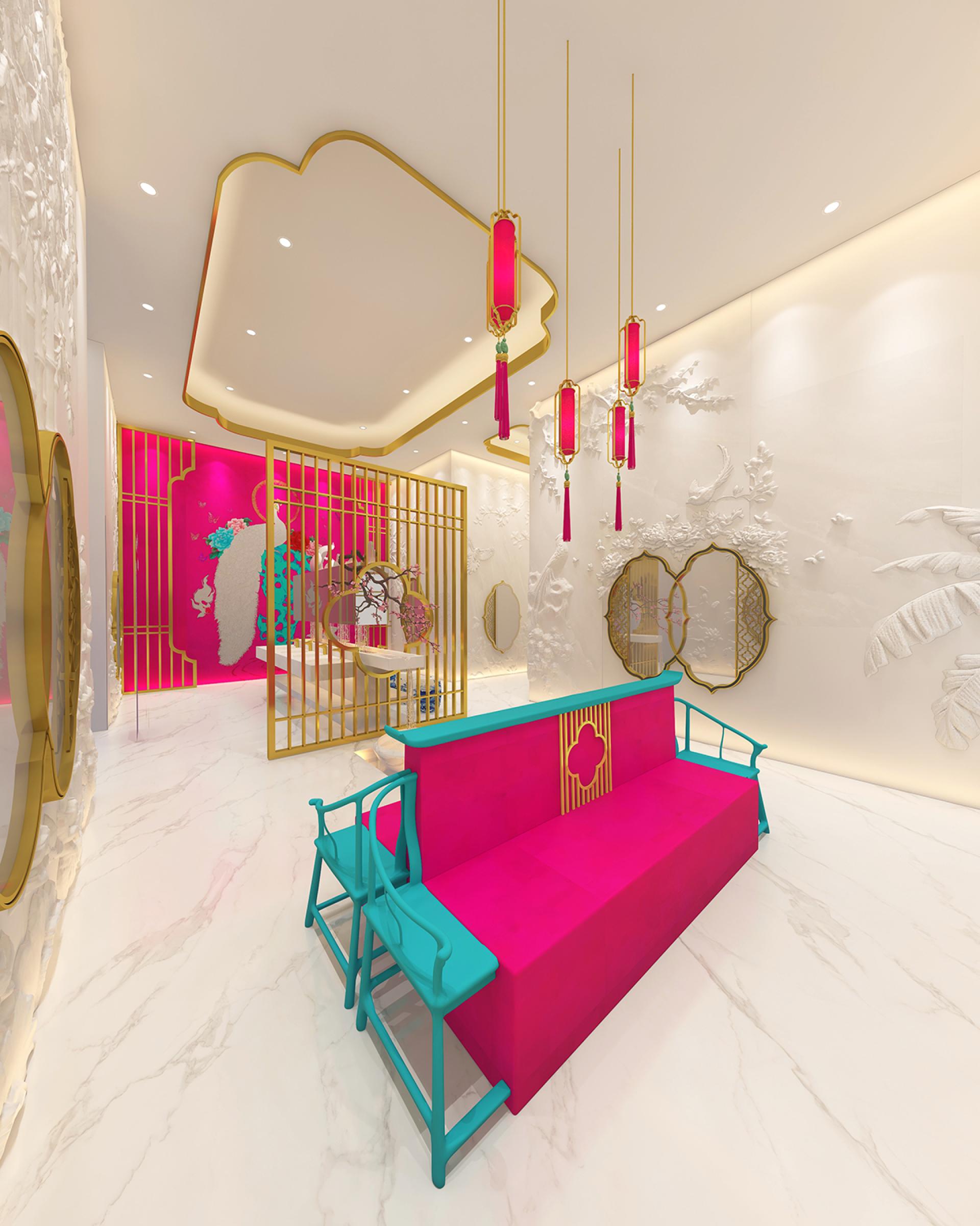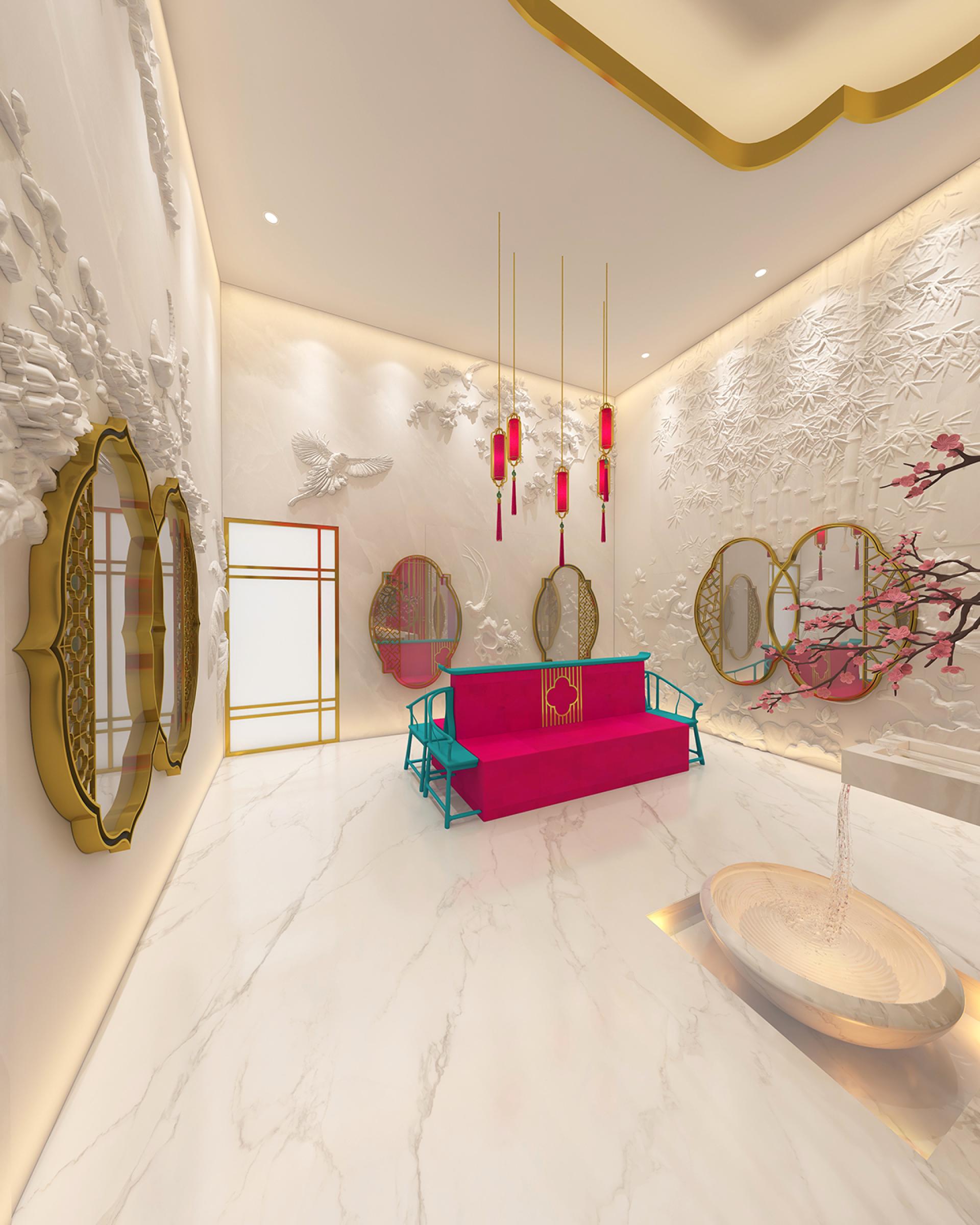 Rooted in temple culture and infused with modern Zen language, the space blends elegance, poetry, and inner comfort. The male area expresses strength through the raw texture of architectural concrete; the entrance cutout featuring Li Bai’s verse and lotus sculpture layers faith with light. The female area resembles a Jiangnan garden—golden lattices, reflections, and fragrance intertwine to evoke gentleness and grace.