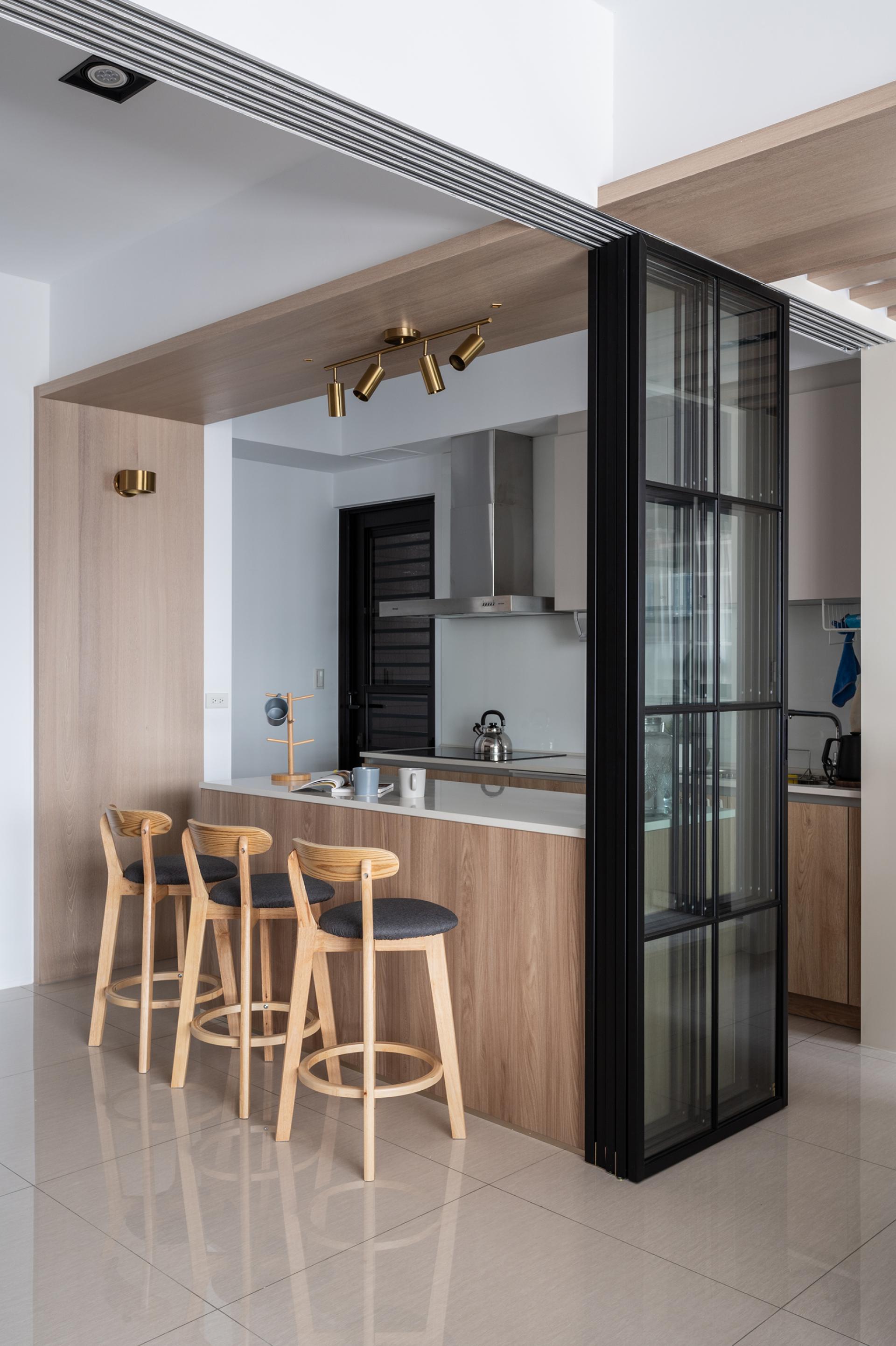 The social area follows an open layout so that the living room, dining kitchen, and open study share natural lighting along the long side of the plan. The window-side daybed becomes a quiet corner for reading and reflection. The dining kitchen includes an island table, while glass sliding doors provide flexible boundaries that maintain openness while controlling cooking fumes when necessary.