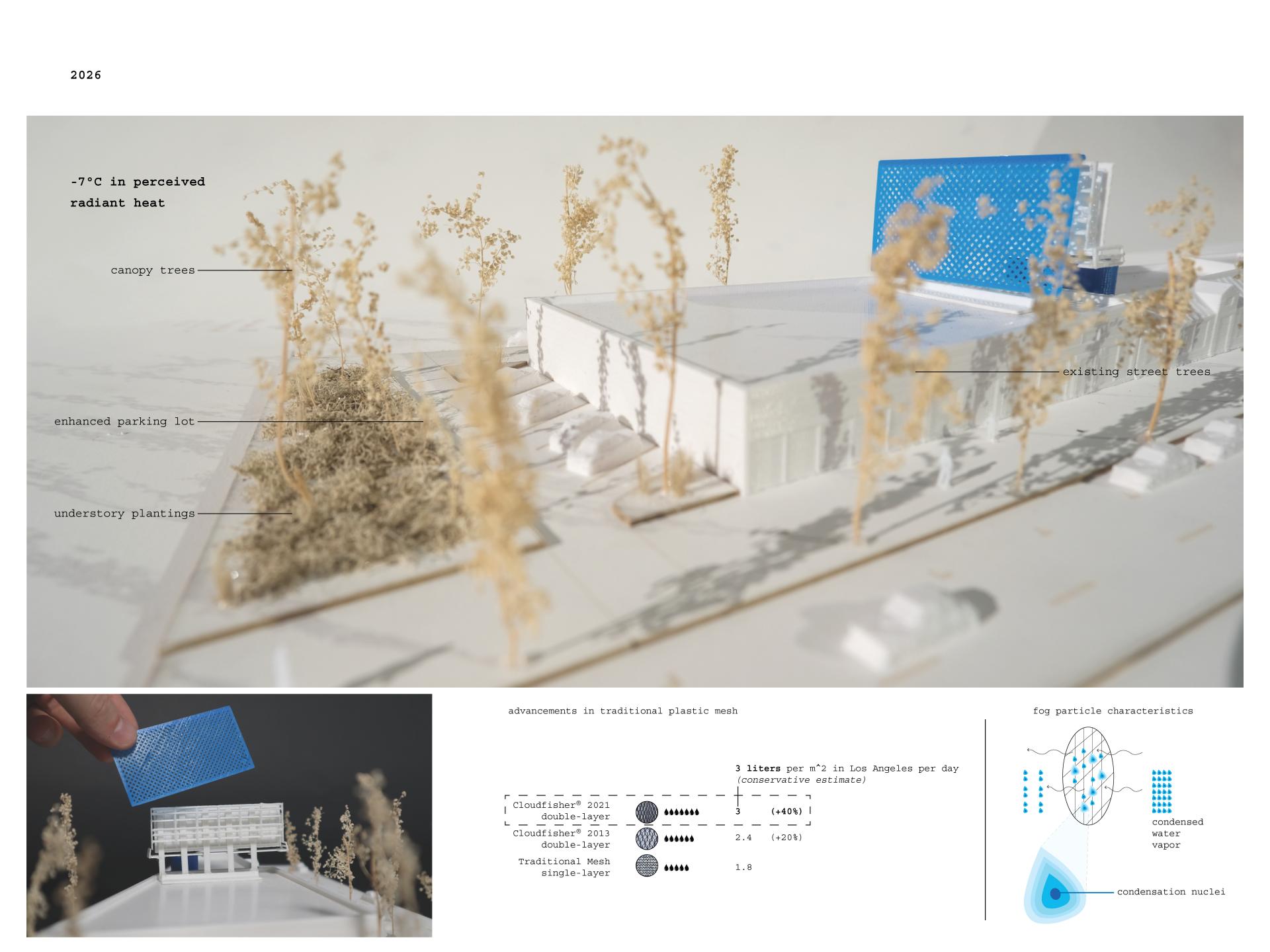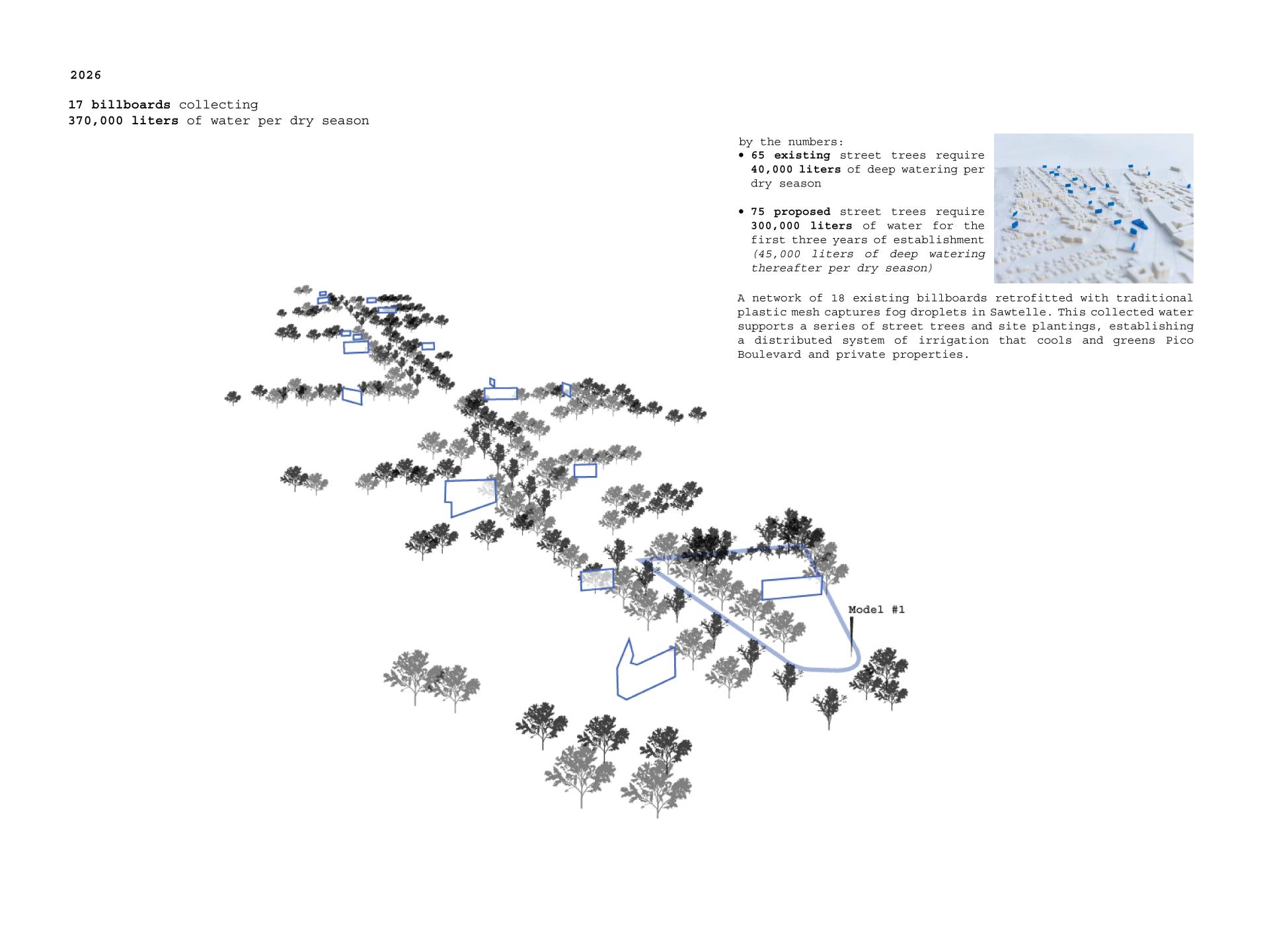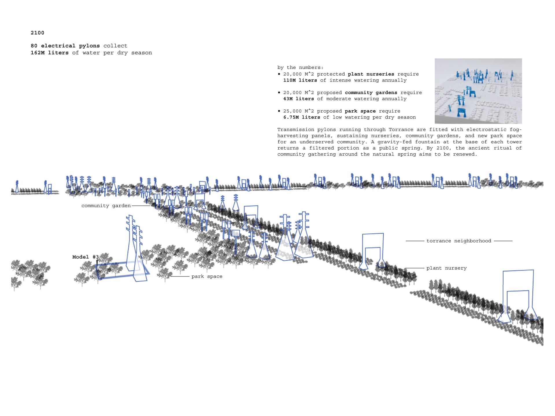 The project proposes a network of fog-harvesting interventions scaled to the urban fabric of Los Angeles, transforming overlooked infrastructure into seasonal water sources. Rather than imposing new structures onto the landscape, it works with what is already there. Existing billboards along the Sawtelle corridor are retrofitted with advanced double-layer mesh, capturing moisture from passing fog and directing it through gravity-fed systems to irrigate street trees below. Along the Santa Monica waterfront, a pair of high-efficiency harvesting towers integrated into a parking structure collect millions of liters per dry season, supplementing the irrigation demands of Tongva Park's established vegetation. At the largest scale, existing transmission pylons running through Torrance are retrofitted with electrostatic panels that sustain nurseries, community gardens, and new park space for an underserved community, while recharging the aquifer. A gravity-fed fountain at the base of each tower returns a filtered portion as a public spring, renewing the ancient ritual of community gathering.