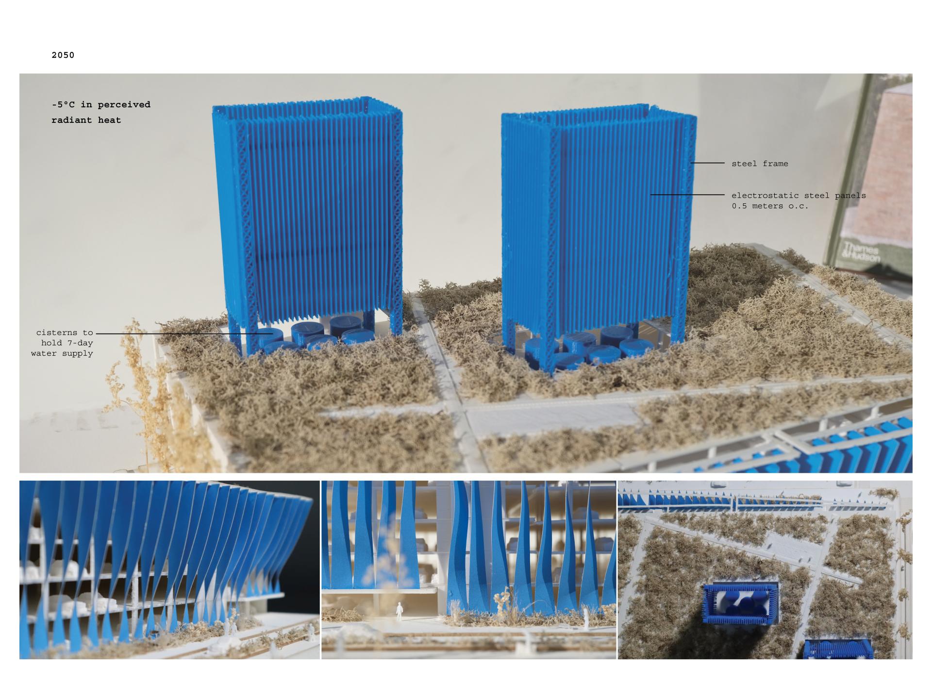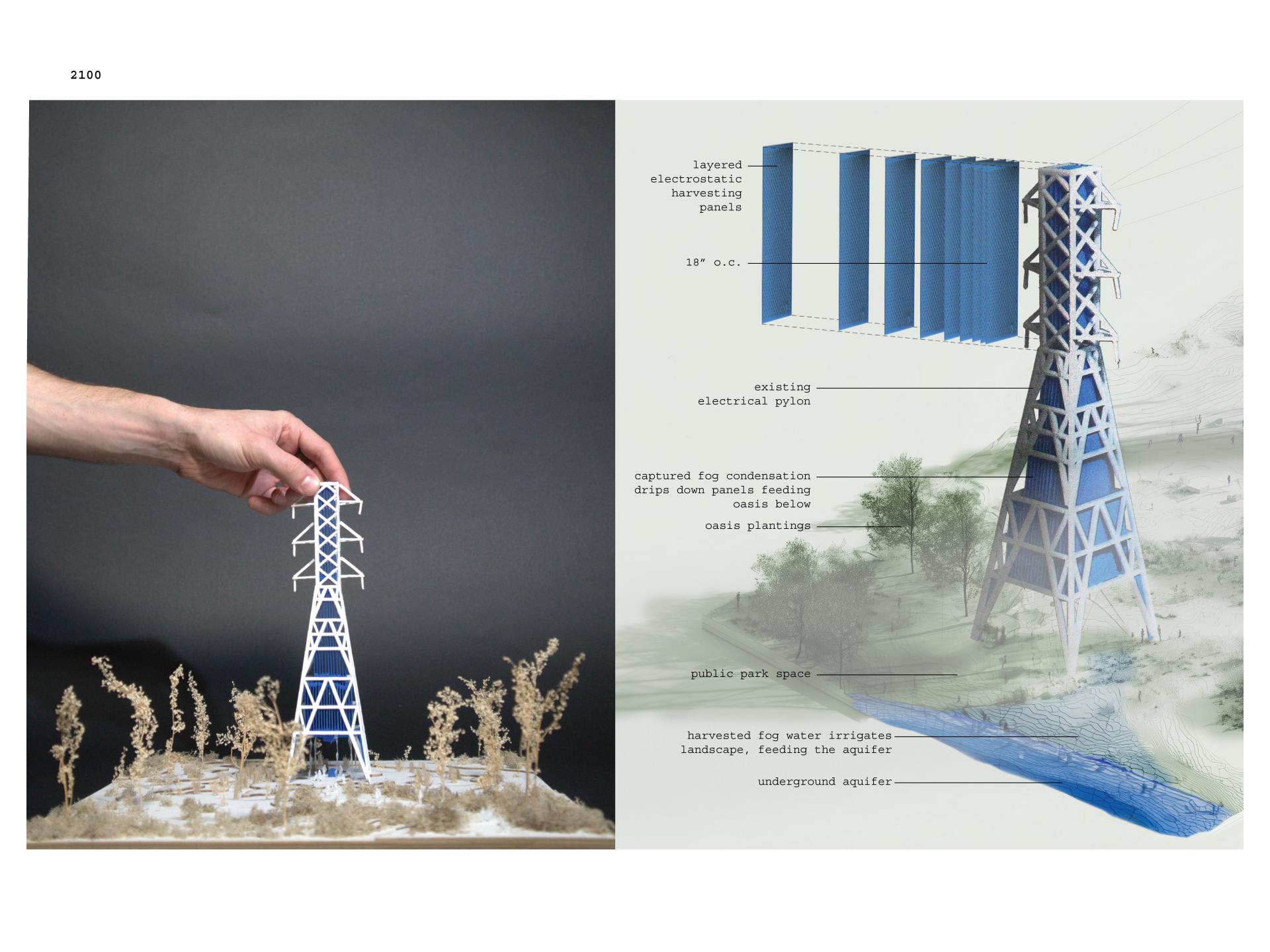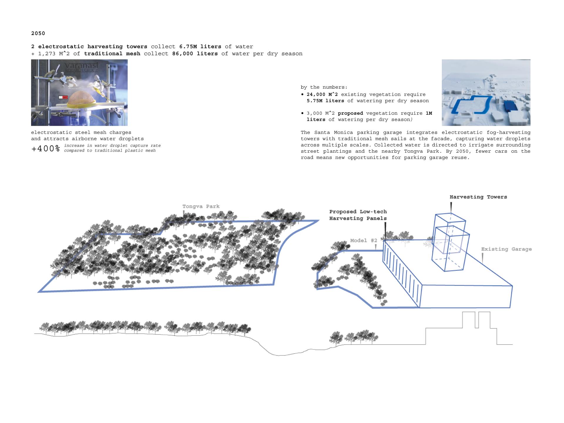 The project proposes a network of fog-harvesting interventions scaled to the urban fabric of Los Angeles, transforming overlooked infrastructure into seasonal water sources. Rather than imposing new structures onto the landscape, it works with what is already there. Existing billboards along the Sawtelle corridor are retrofitted with advanced double-layer mesh, capturing moisture from passing fog and directing it through gravity-fed systems to irrigate street trees below. Along the Santa Monica waterfront, a pair of high-efficiency harvesting towers integrated into a parking structure collect millions of liters per dry season, supplementing the irrigation demands of Tongva Park's established vegetation. At the largest scale, existing transmission pylons running through Torrance are retrofitted with electrostatic panels that sustain nurseries, community gardens, and new park space for an underserved community, while recharging the aquifer. A gravity-fed fountain at the base of each tower returns a filtered portion as a public spring, renewing the ancient ritual of community gathering.