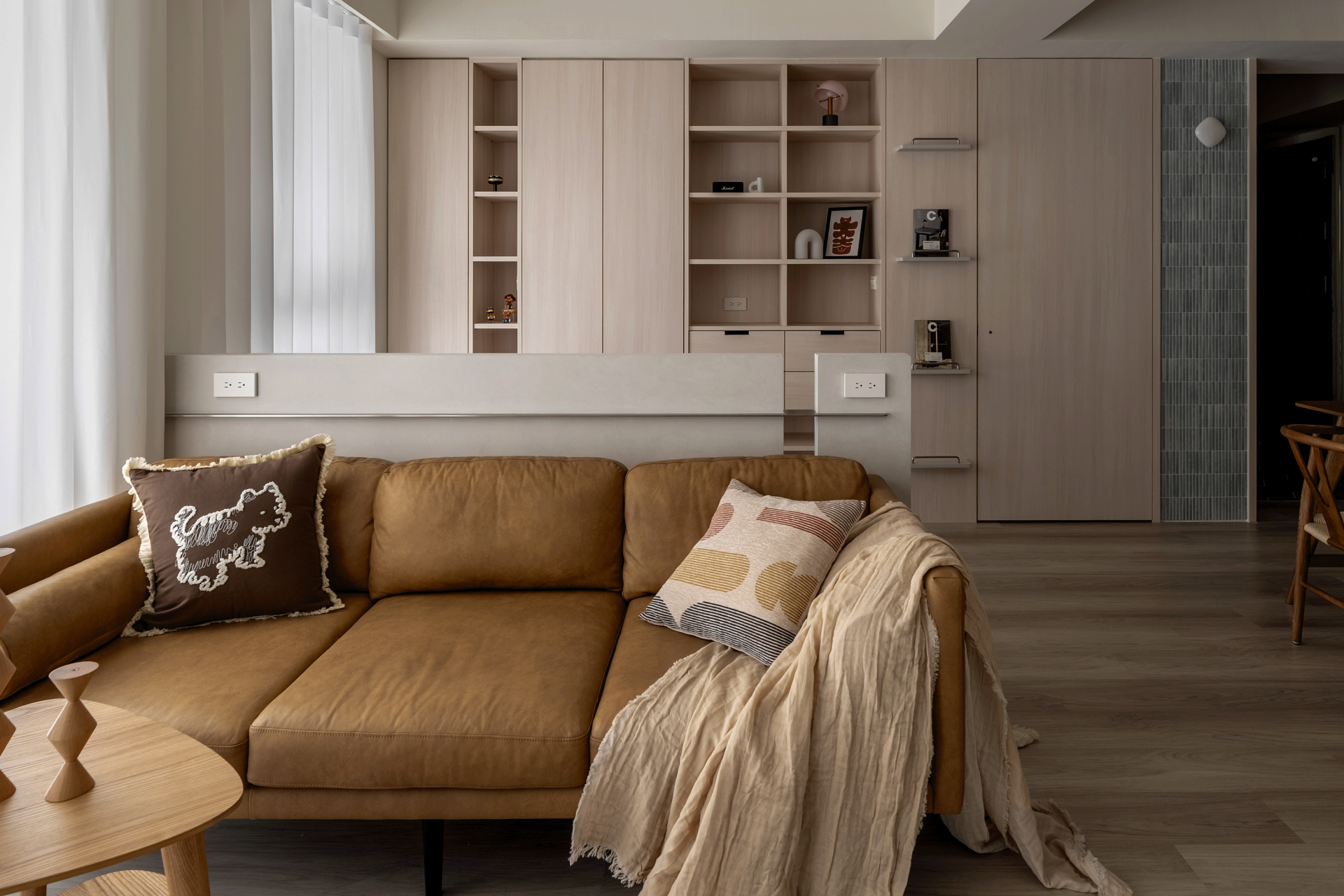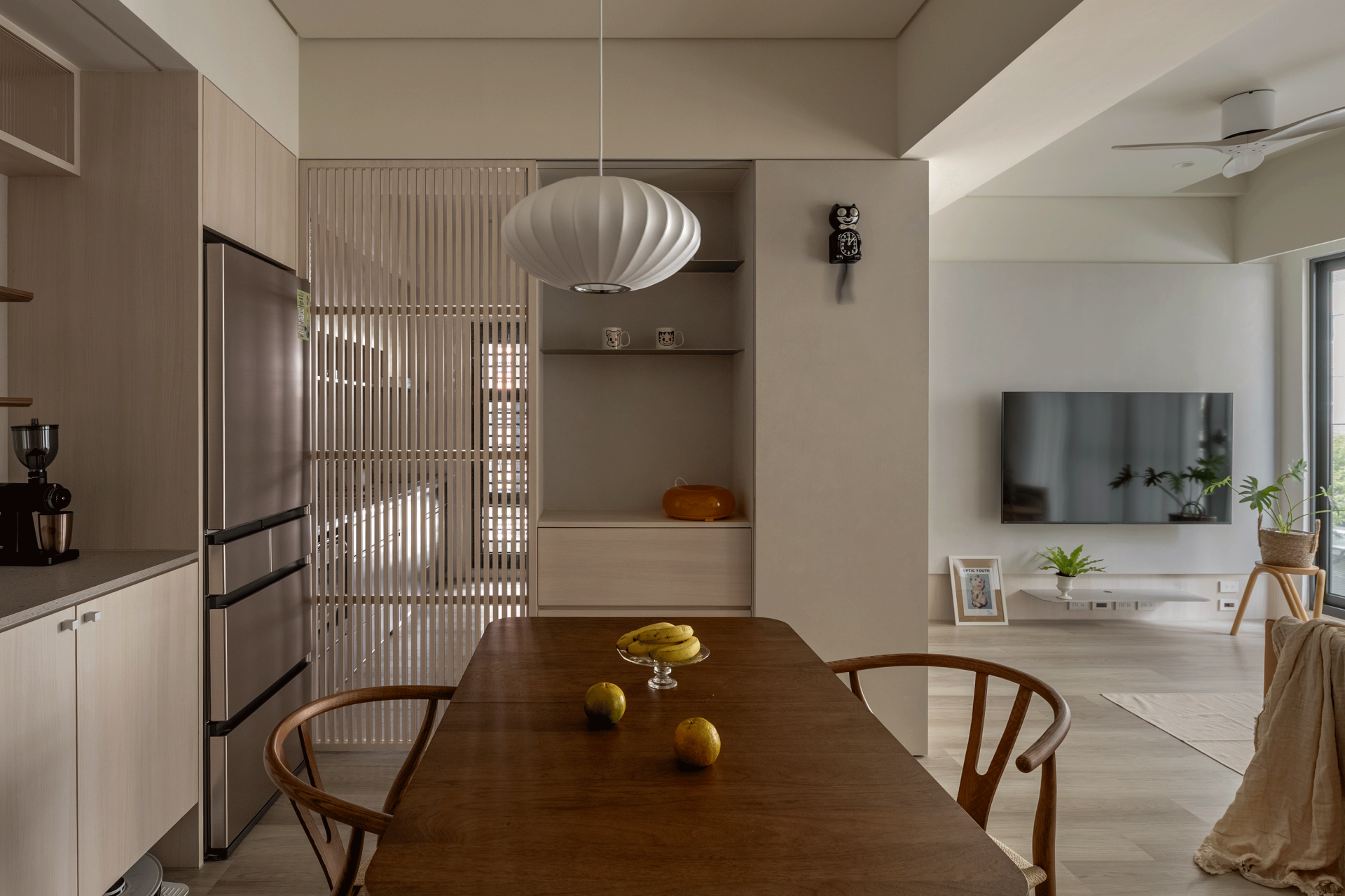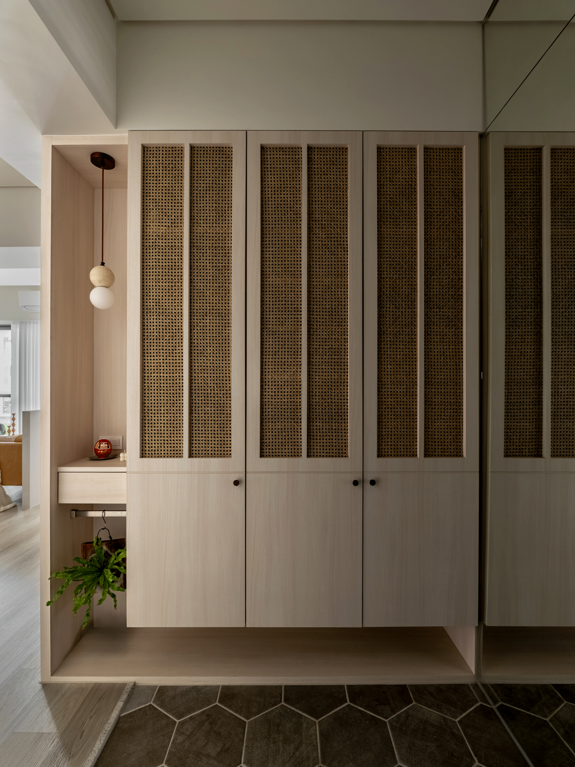 The highlights are concentrated in the integrated elevation design between the entryway and the living room. An extended cabinetry wall serves as the primary spatial axis, consolidating storage, concealed doors, and circulation definition into a single system. The cabinetry proportions are slender and restrained, while rattan cabinet doors introduce a breathable rhythmic façade, allowing large storage volumes to recede into the background rather than appear heavy.