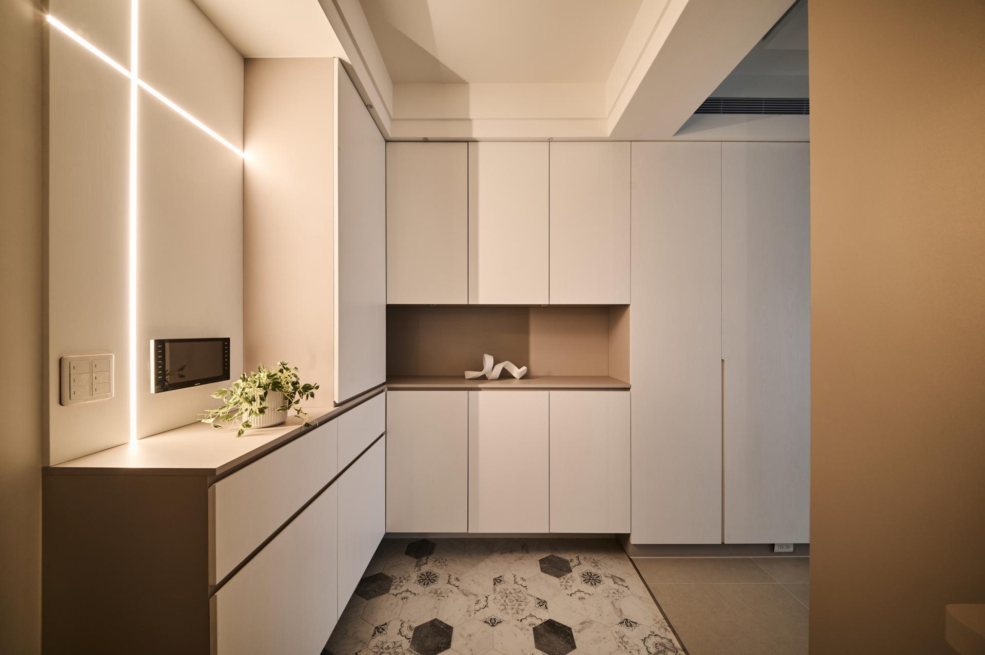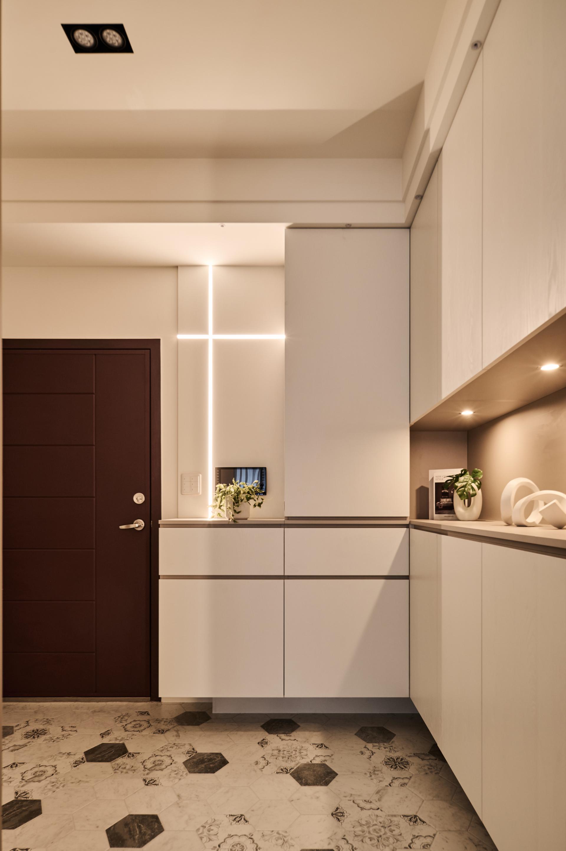 To address the challenges of an aging structure, we implemented a sophisticated palette of eco-friendly, low-formaldehyde materials, ensuring a healthy environment for the clients' young daughter. The living area features a grand-format marble-veined porcelain surface, providing the timeless elegance of natural stone without the weight and maintenance issues. Hexagonal tile transitions in the foyer create a functional "dust zone" that merges traditional European aesthetics with modern minimalist cabinetry, utilizing seamless handle-less technology for a streamlined visual flow.
