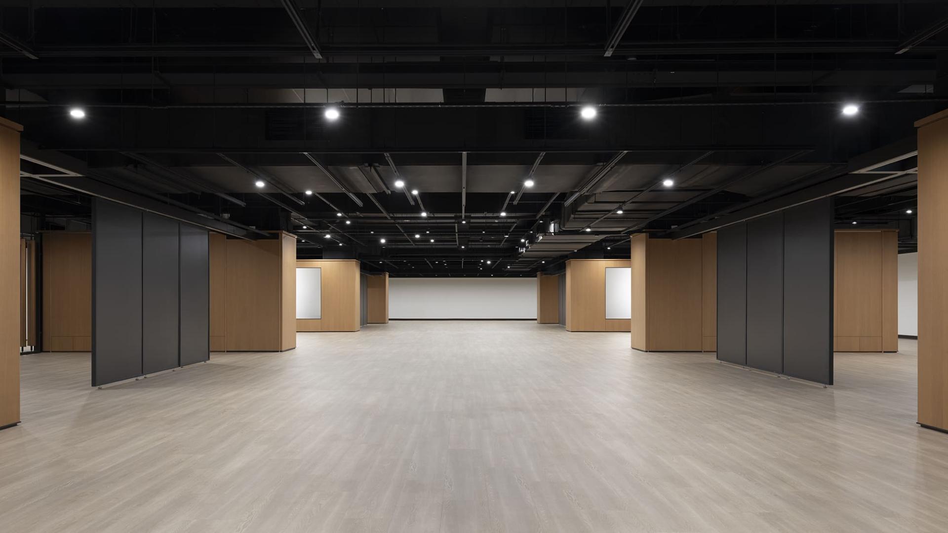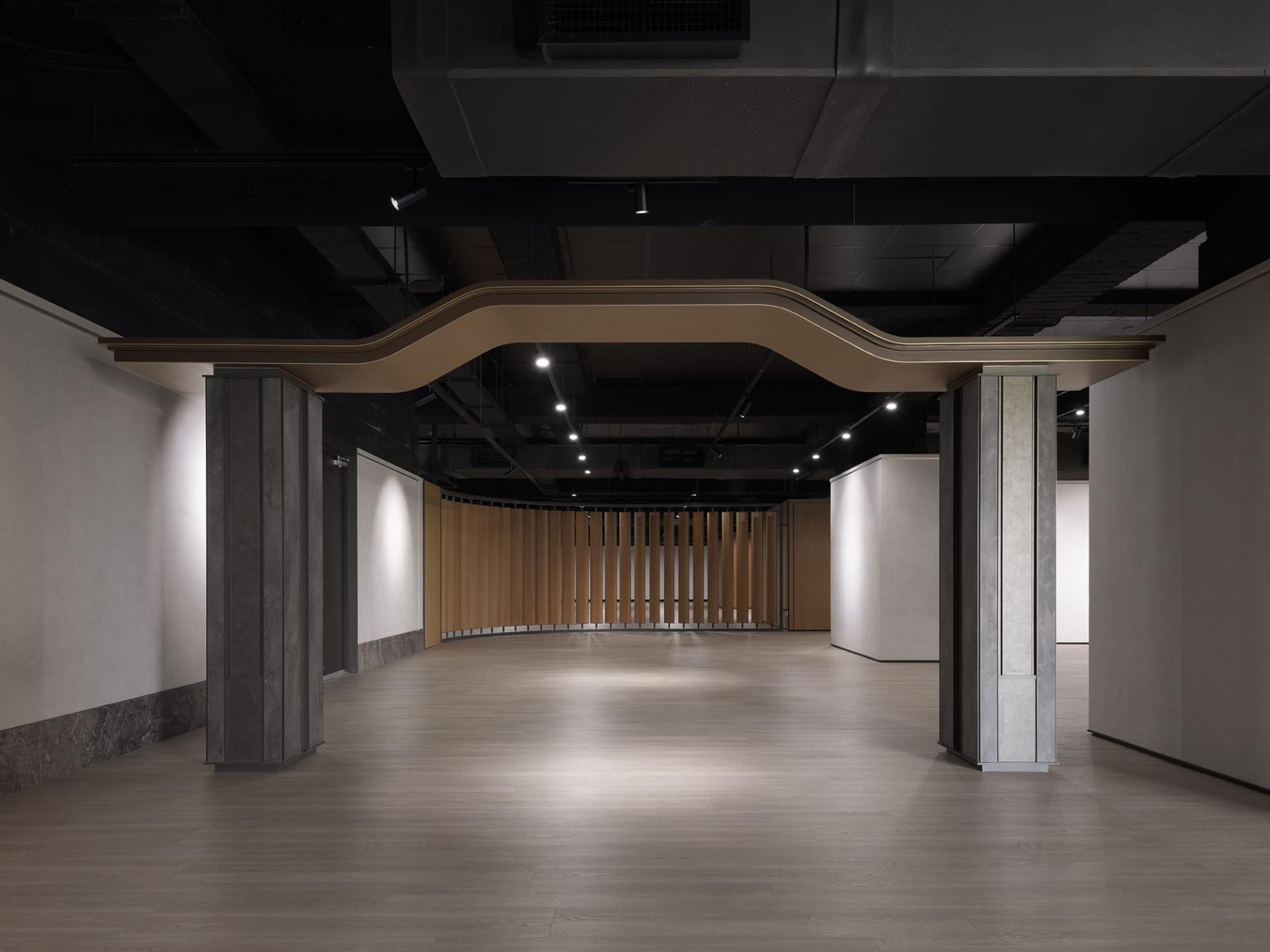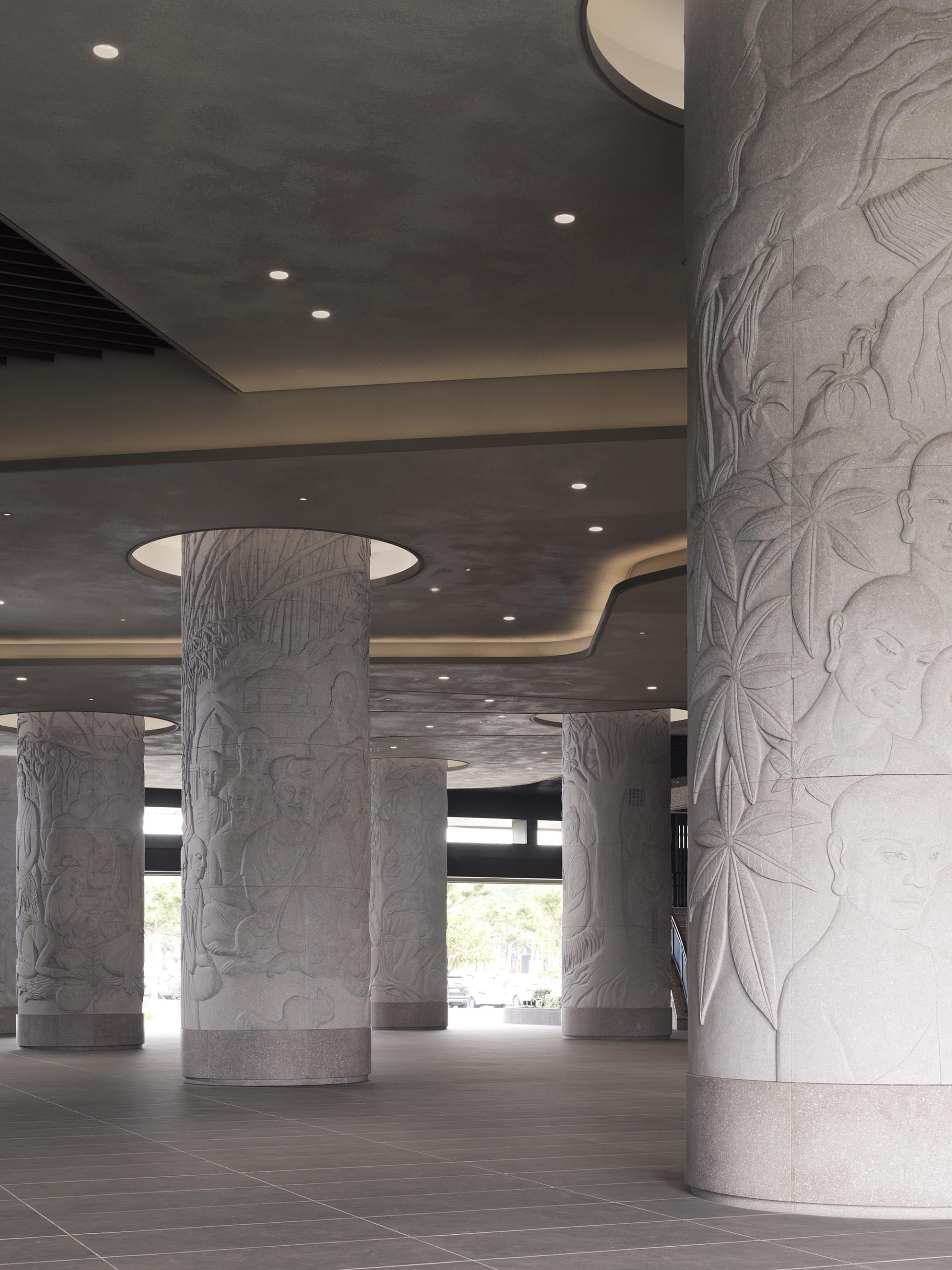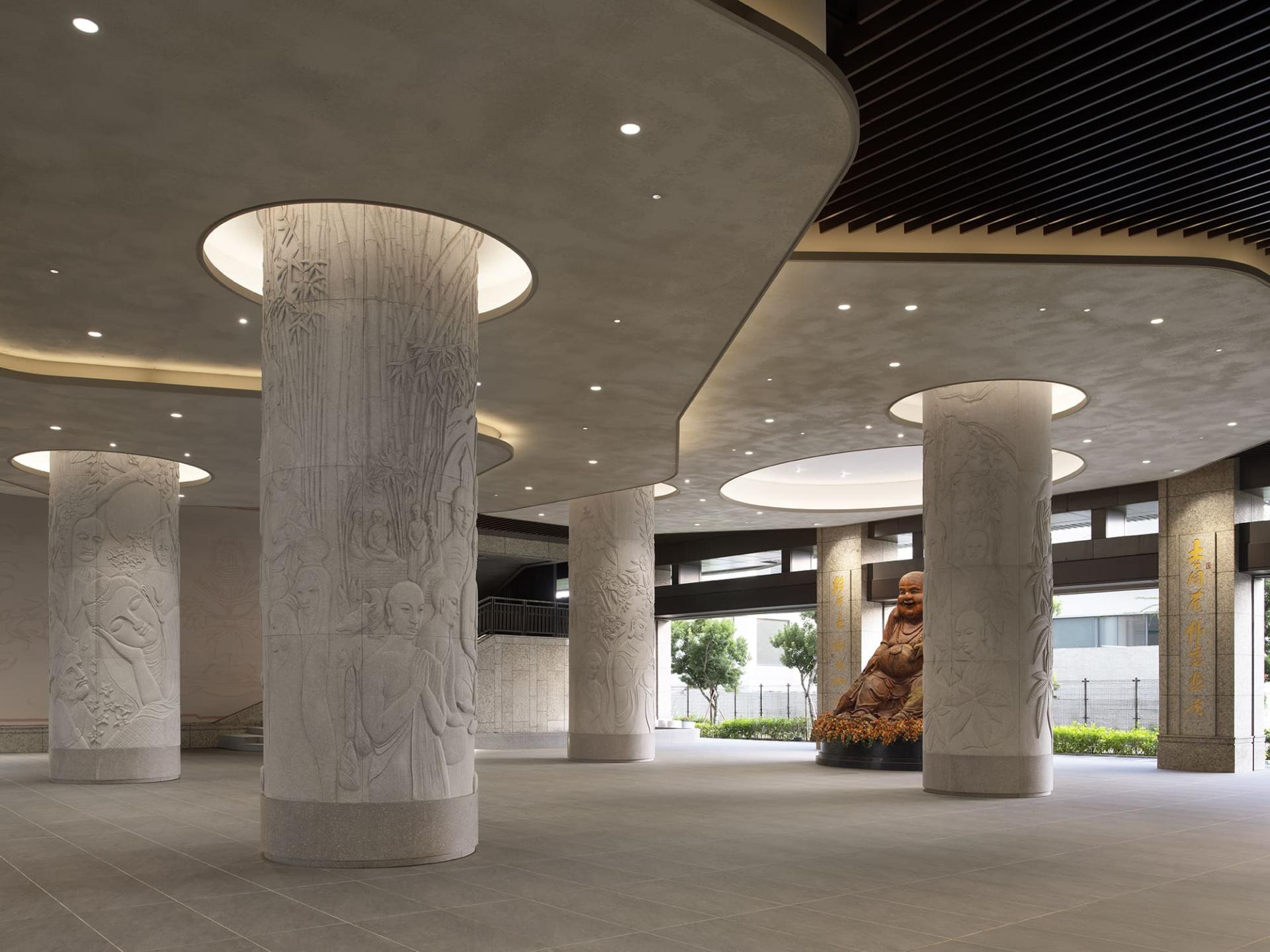 Nestled within this multifunctional sanctuary, the exhibition space emerges as a pivotal venue for the appreciation of art and culture. As visitors approach, they are greeted by a large horizontal plaque gracefully suspended at the entrance on the first floor. This, coupled with the soaring ceiling structure, establishes an atmosphere of solemnity that invites deeper reflection. Beneath their feet, the frosted stone slab flooring harmonizes beautifully with a continuous arrangement of intricately designed religious relief stone columns, weaving imagery into the very fabric of the architecture. Moreover, the curved ceilings, enhanced by concealed light strips, diffuse light evenly throughout the space, creating an inviting and serene environment. At the heart of the exhibit, a stunning collection of wooden Buddha sculptures serves as a striking visual anchor, forging a psychological transition from the bustling movement of the entrance to a more contemplative state.