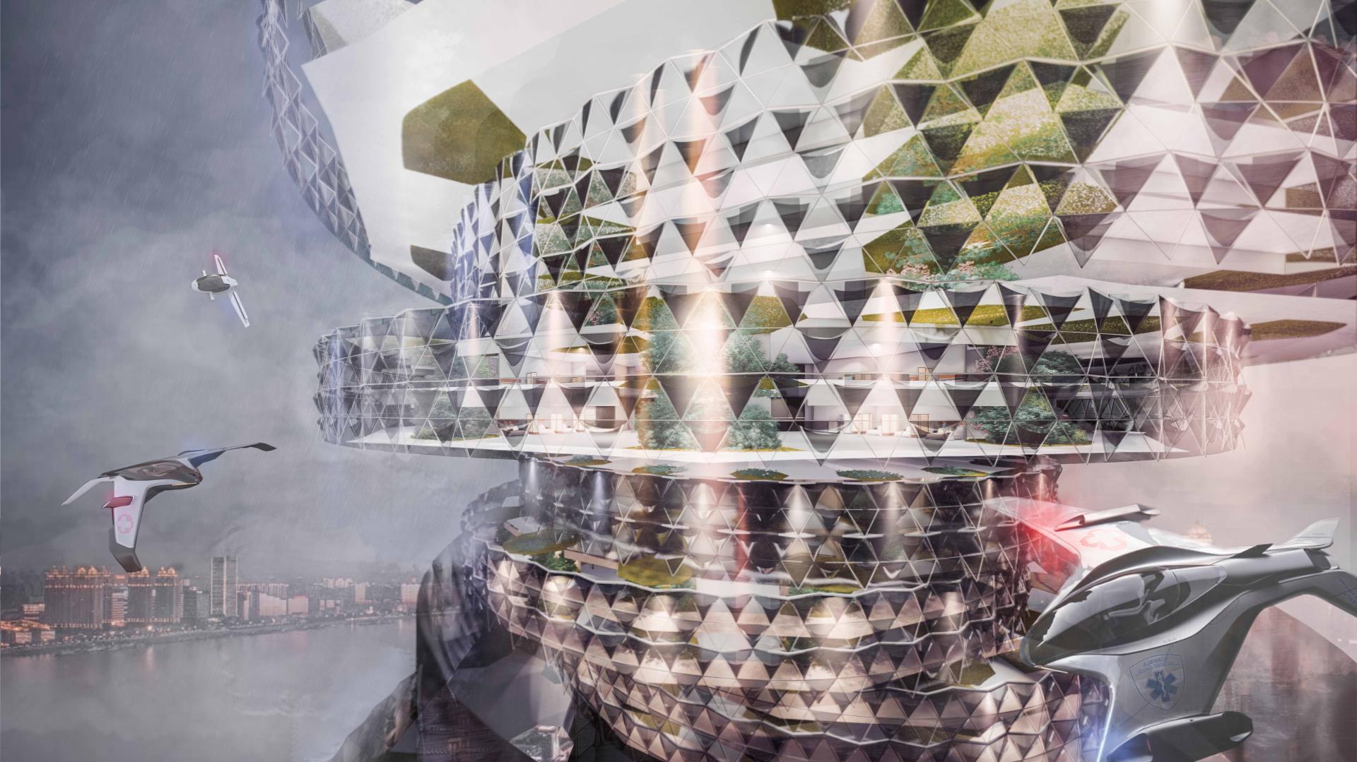 In non-epidemic periods, these units operate as community-based medical facilities that flexibly adapt to local demand. During epidemics, the units can be rapidly transported by helicopter to a central core, where they are reassembled into isolation and admission wards. A controlled circulation ring minimizes cross-infection while maintaining patient activity space.