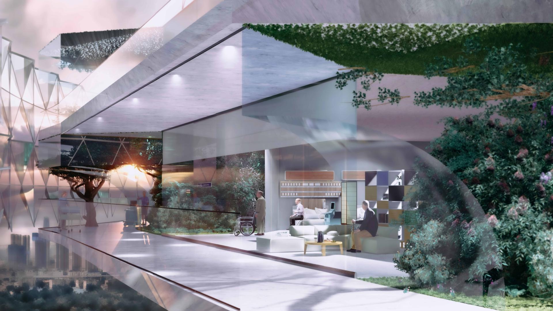 The system integrates rehabilitative landscapes and a sustainable building envelope incorporating solar energy, rainwater collection, and adaptive environmental systems to enhance resilience and long-term performance.