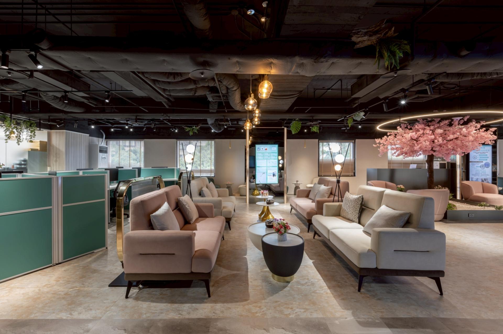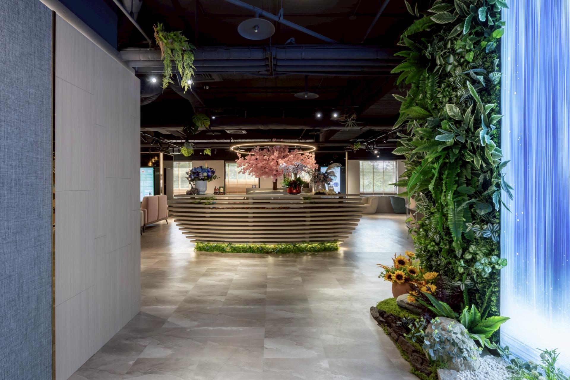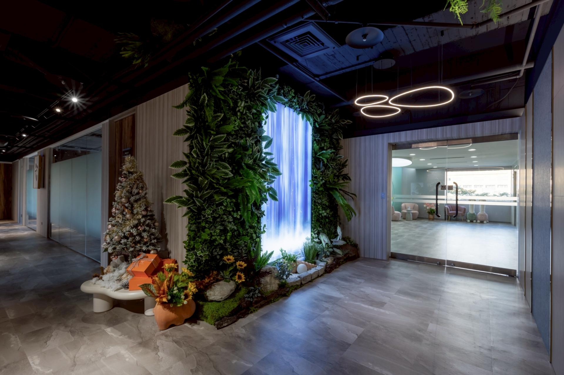 The circulation path gracefully unfolds from the stairwell lobby, where the design thoughtfully integrates the brand's color palette with softened brightness and saturation. This carefully considered approach not only serves as a psychological transition point but also reinforces brand recognition while alleviating sensory fatigue. As visitors enter the interior, they will be immediately captivated by a stunning waterfall seamlessly integrated with a living wall on the left side. This striking visual focal point symbolizes the cycle of life, offering a dynamic and refreshing atmosphere. To the right, a collage of mixed materials and wall coverings adds depth and texture, inviting exploration and engagement.