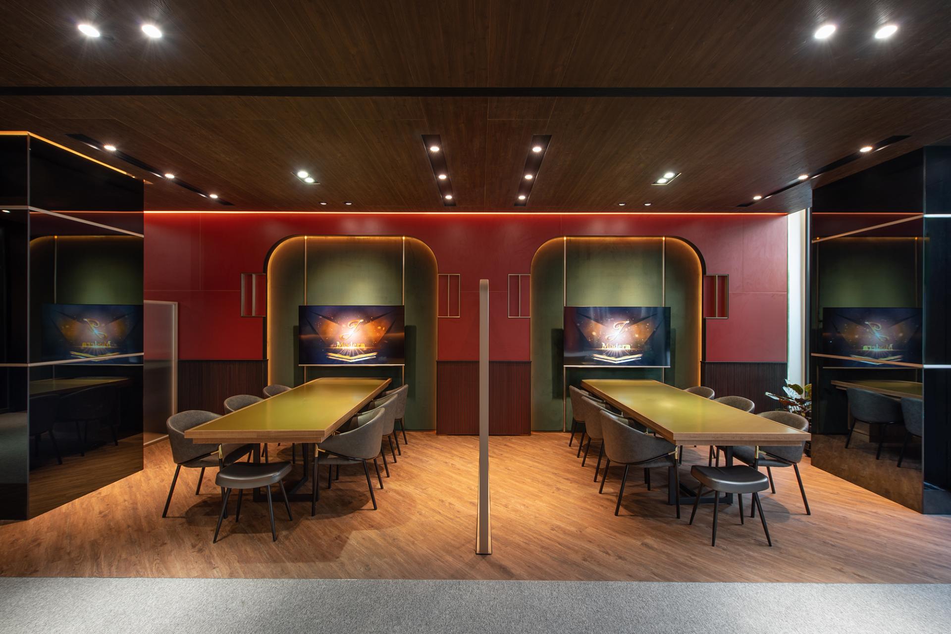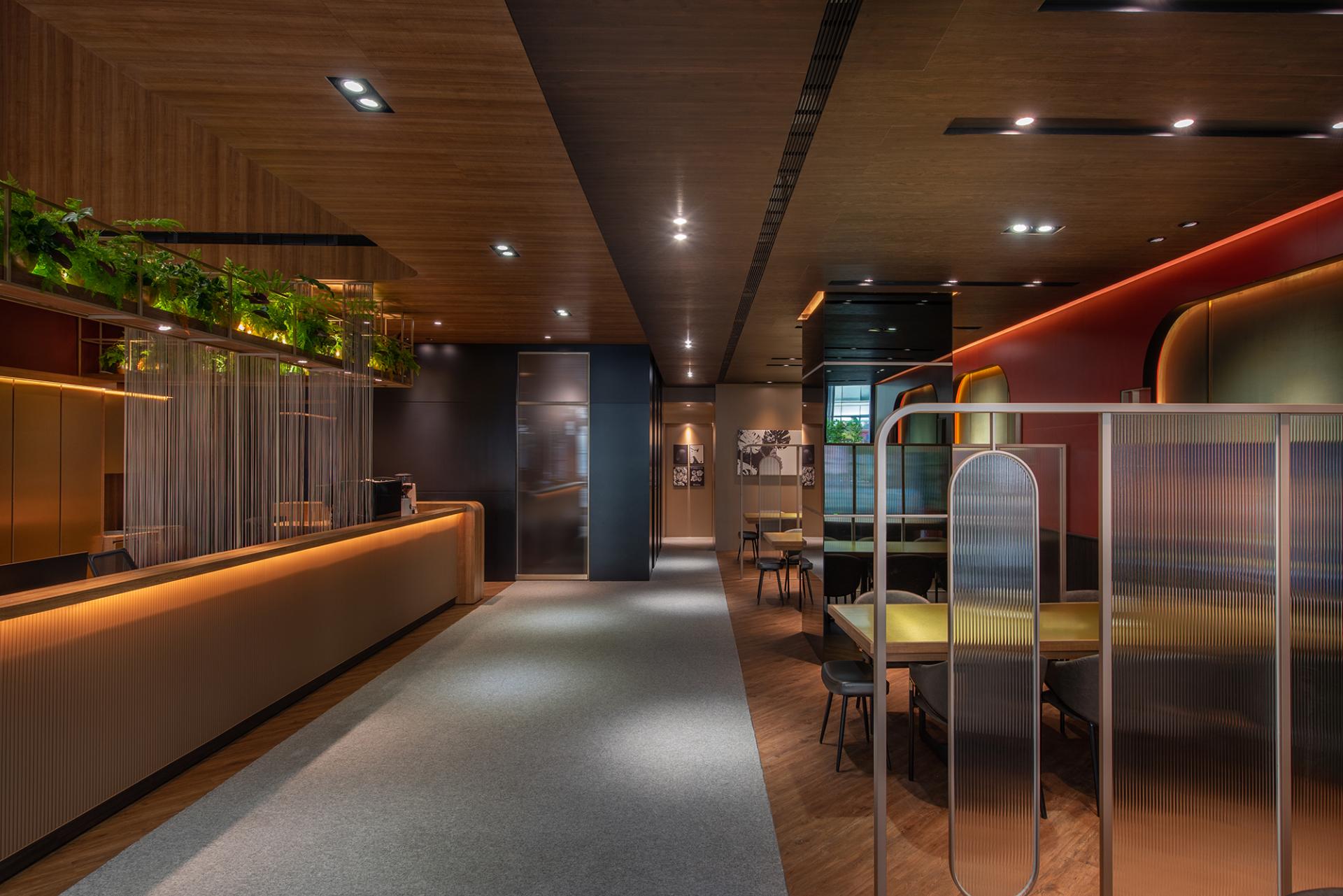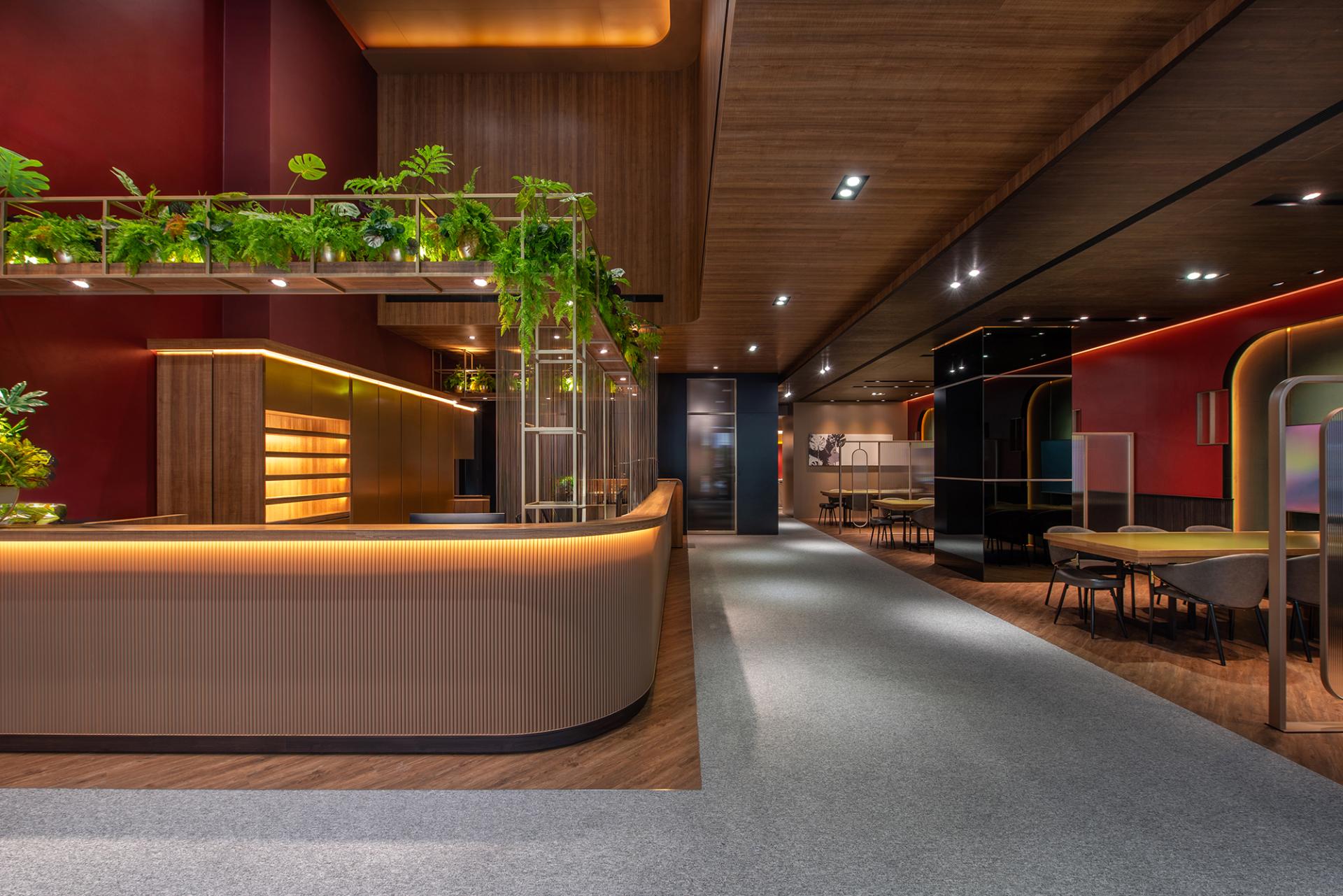 This hospitality space exudes a captivating “1920s Metropolitan Modern” theme, drawing inspiration from the iconic film The Great Gatsby. Rich deep red and dark green hues elegantly intertwine throughout the design, evoking the stylish essence of contemporary New York City. Moreover, the floor plan boasts an open circulation layout, skillfully complemented by semi-transparent partitions that not only ensure visual continuity but also provide a delicate balance between functional flexibility and conversational privacy. In addition, the meticulous integration of layered lighting and a harmonious material palette unifies the reception, waiting, and meeting (discussion) zones, allowing them to flow together seamlessly. This thoughtful design strategy not only reinforces the brand’s stable image but also enhances users’ sense of comfort and encourages them to linger and engage within the space.
