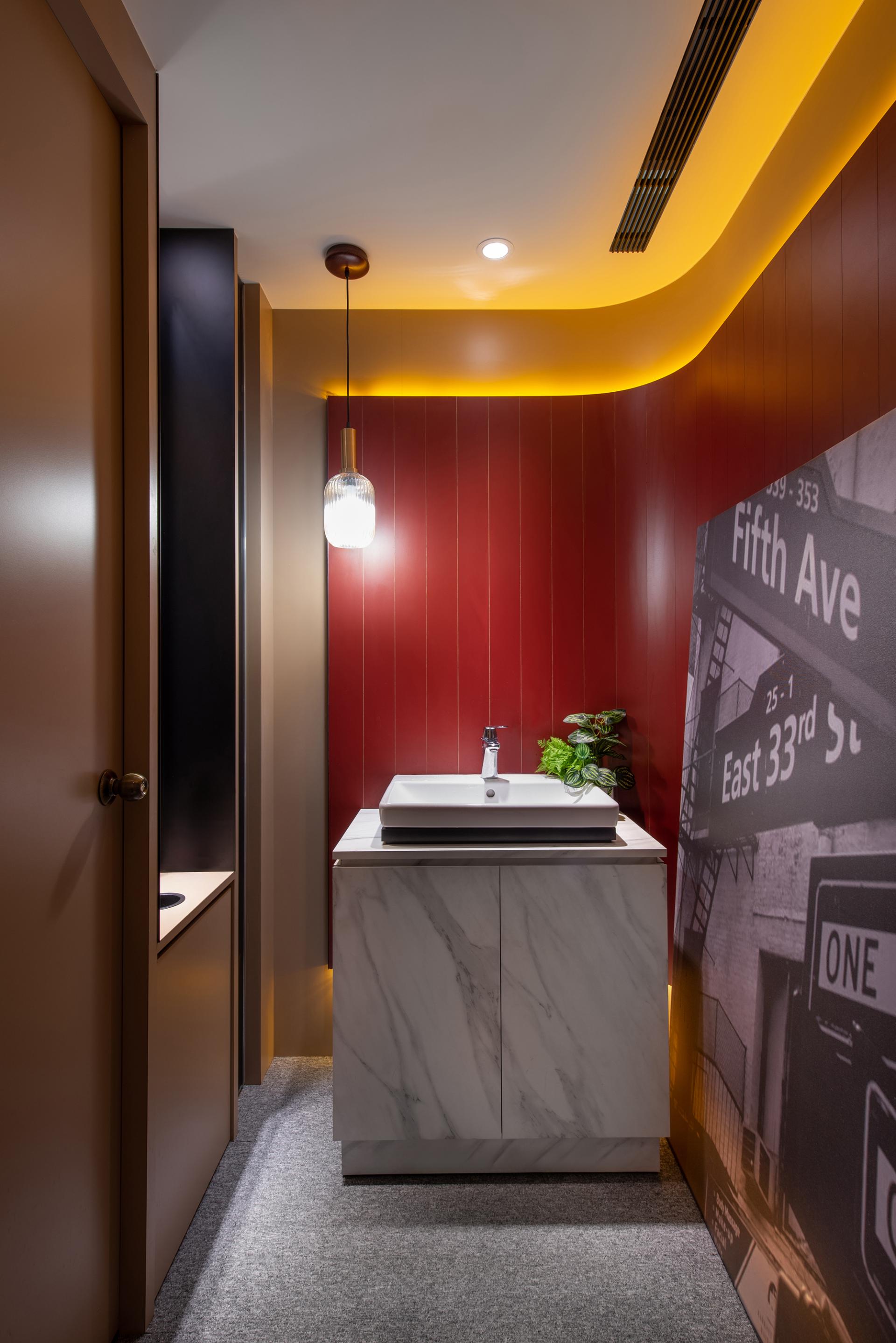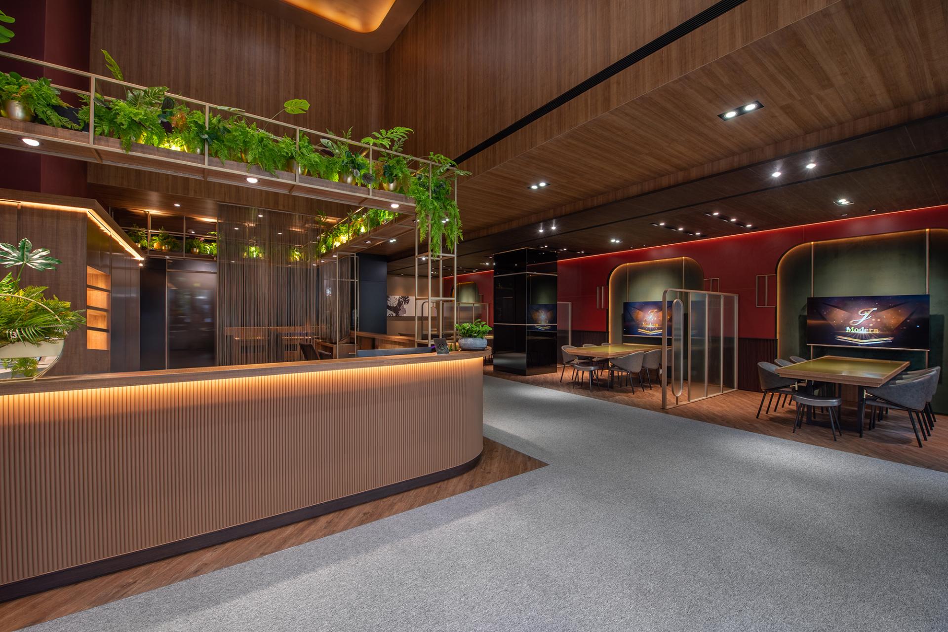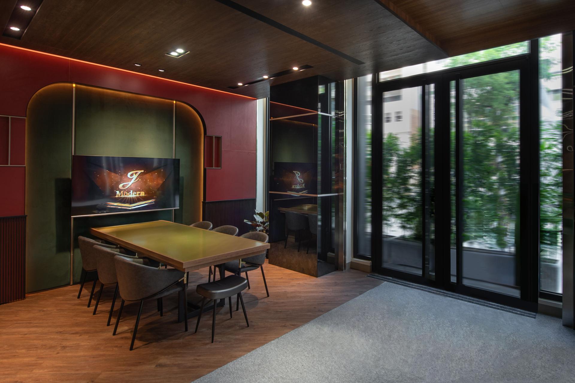 This hospitality space exudes a captivating “1920s Metropolitan Modern” theme, drawing inspiration from the iconic film The Great Gatsby. Rich deep red and dark green hues elegantly intertwine throughout the design, evoking the stylish essence of contemporary New York City. Moreover, the floor plan boasts an open circulation layout, skillfully complemented by semi-transparent partitions that not only ensure visual continuity but also provide a delicate balance between functional flexibility and conversational privacy. In addition, the meticulous integration of layered lighting and a harmonious material palette unifies the reception, waiting, and meeting (discussion) zones, allowing them to flow together seamlessly. This thoughtful design strategy not only reinforces the brand’s stable image but also enhances users’ sense of comfort and encourages them to linger and engage within the space.