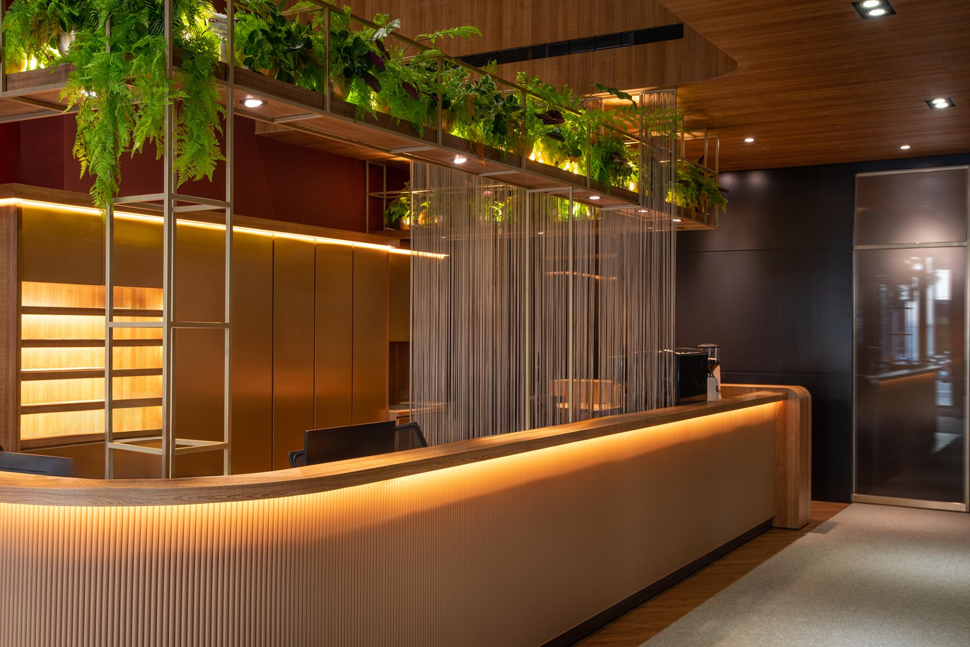 Layered indirect lighting, strategically placed, further elevates the vertical sense of space, casting a warm, inviting glow throughout the area. The counter itself boasts an intricate three-dimensional grid design that is both recessed and embedded with linear lighting, enhancing its modern sophistication. In addition, the geometric metal plant stand above introduces a touch of greenery, softening the business atmosphere with its refreshing presence and the captivating interplay of light and shadow. At the end of the counter, a high-backed bar seamlessly extends, artfully blurring the lines between the reception area and a more relaxed leisure space. This inviting setup encourages interaction, making the entire experience more engaging and welcoming for all who enter.
