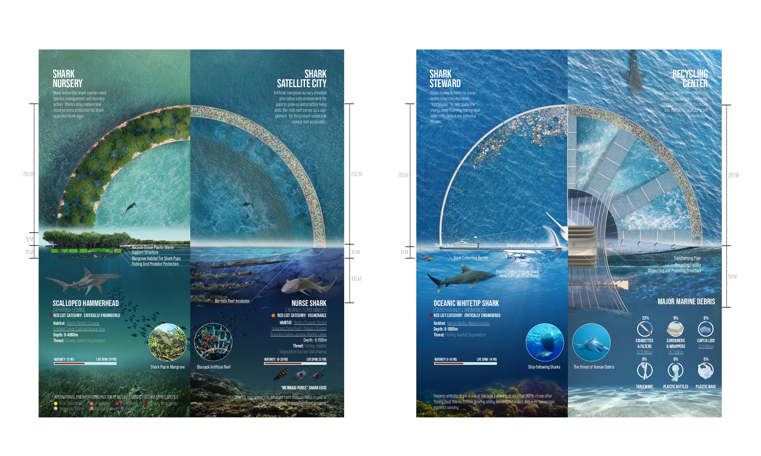 Four development nodes respond directly to the major threats facing sharks: nurseries for breeding and early-life protection, satellite cities for habitat recovery, stewards for surveillance and debris collection, and recycling centers for transforming ocean waste into protective infrastructure. Together, they imagine a cleaner, safer blue planet where endangered species such as the scalloped hammerhead, nurse shark, whale shark, and oceanic whitetip can thrive.