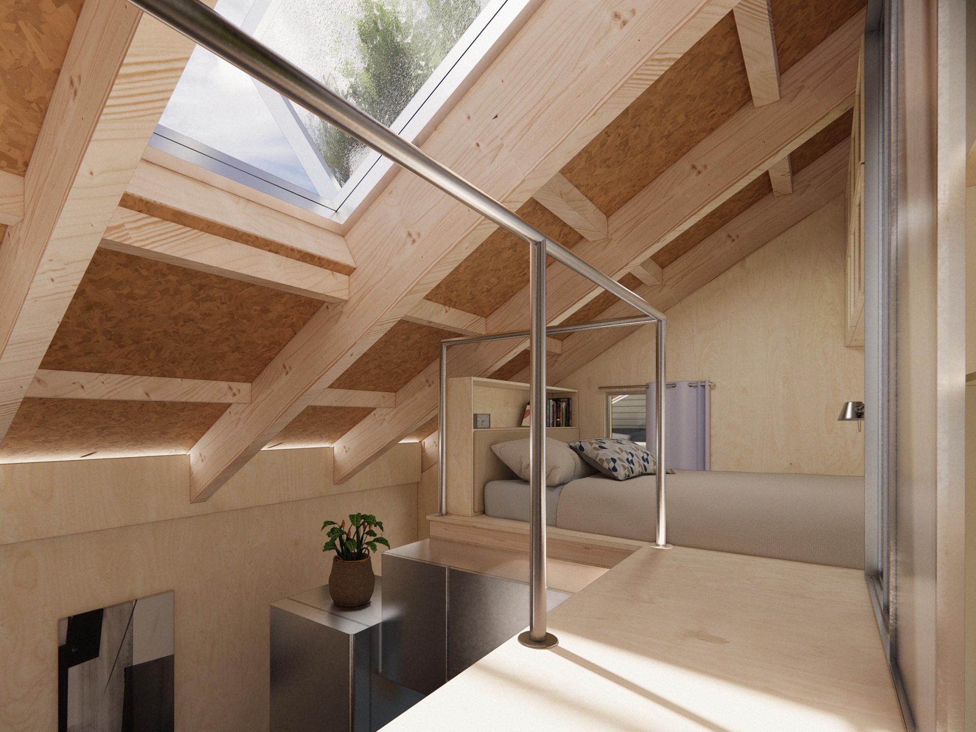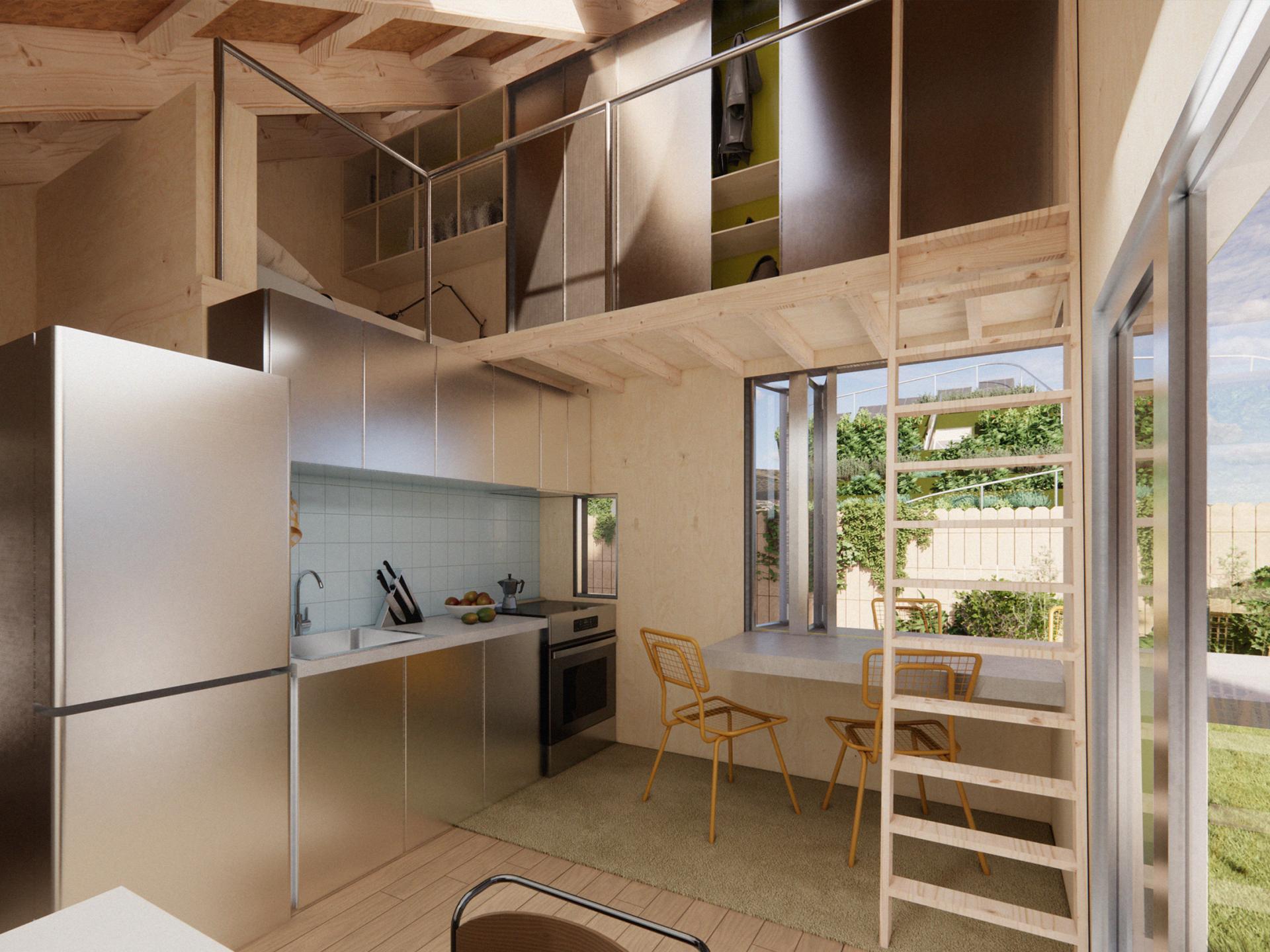 At the heart of the design is the transformation of the backyard ground plane. The landscape rises to form an elevated roof garden, which serves as a productive agricultural surface while shading the living spaces beneath. This dual function minimizes disruption to the backyard’s footprint, turning private yards into shared, community-oriented spaces. Positioned along the alley rather than the front street, the microhome activates overlooked service corridors with food cultivation and social interaction, fostering a more intimate neighborhood scale.