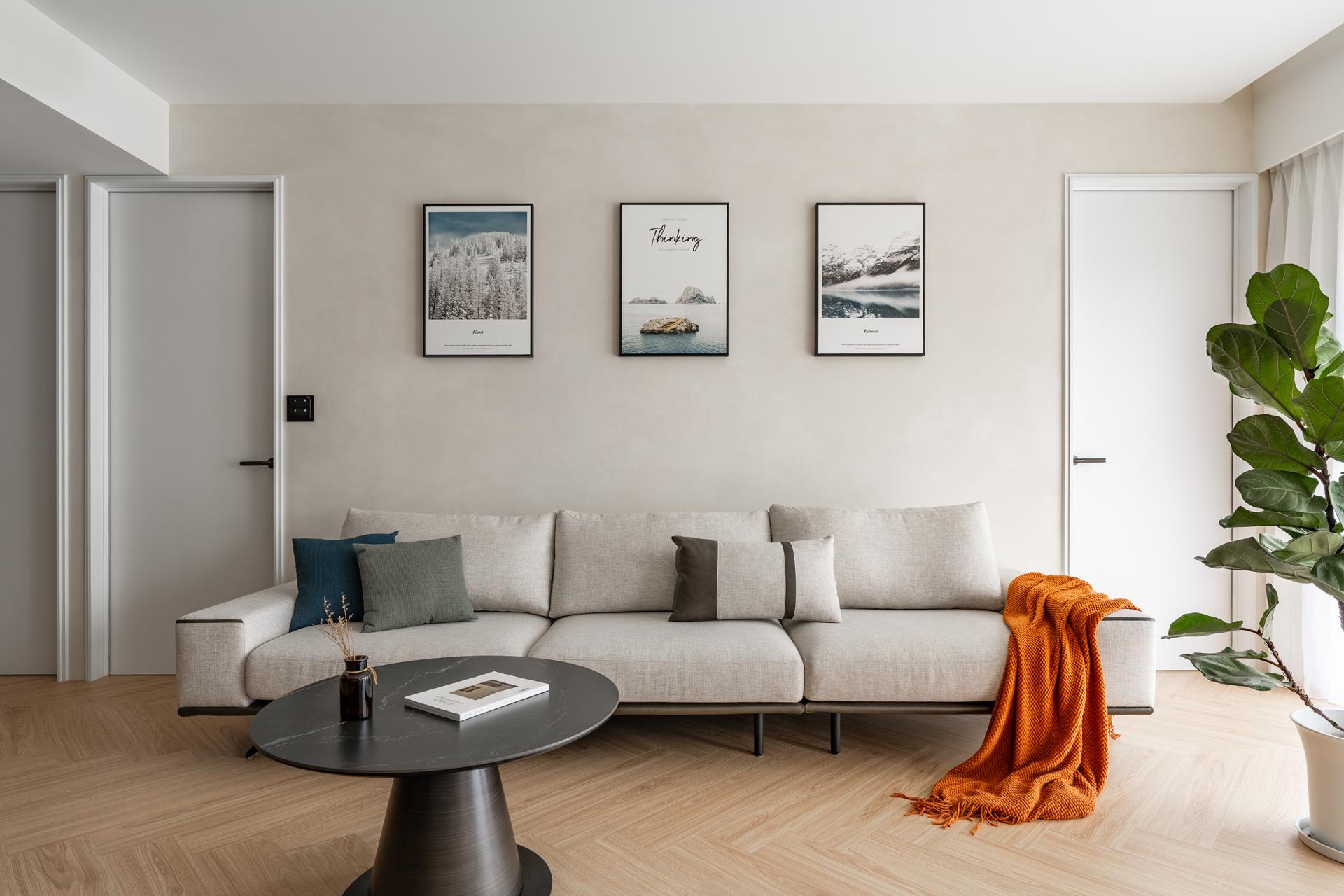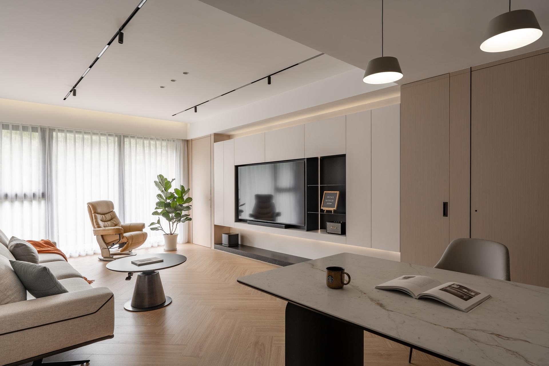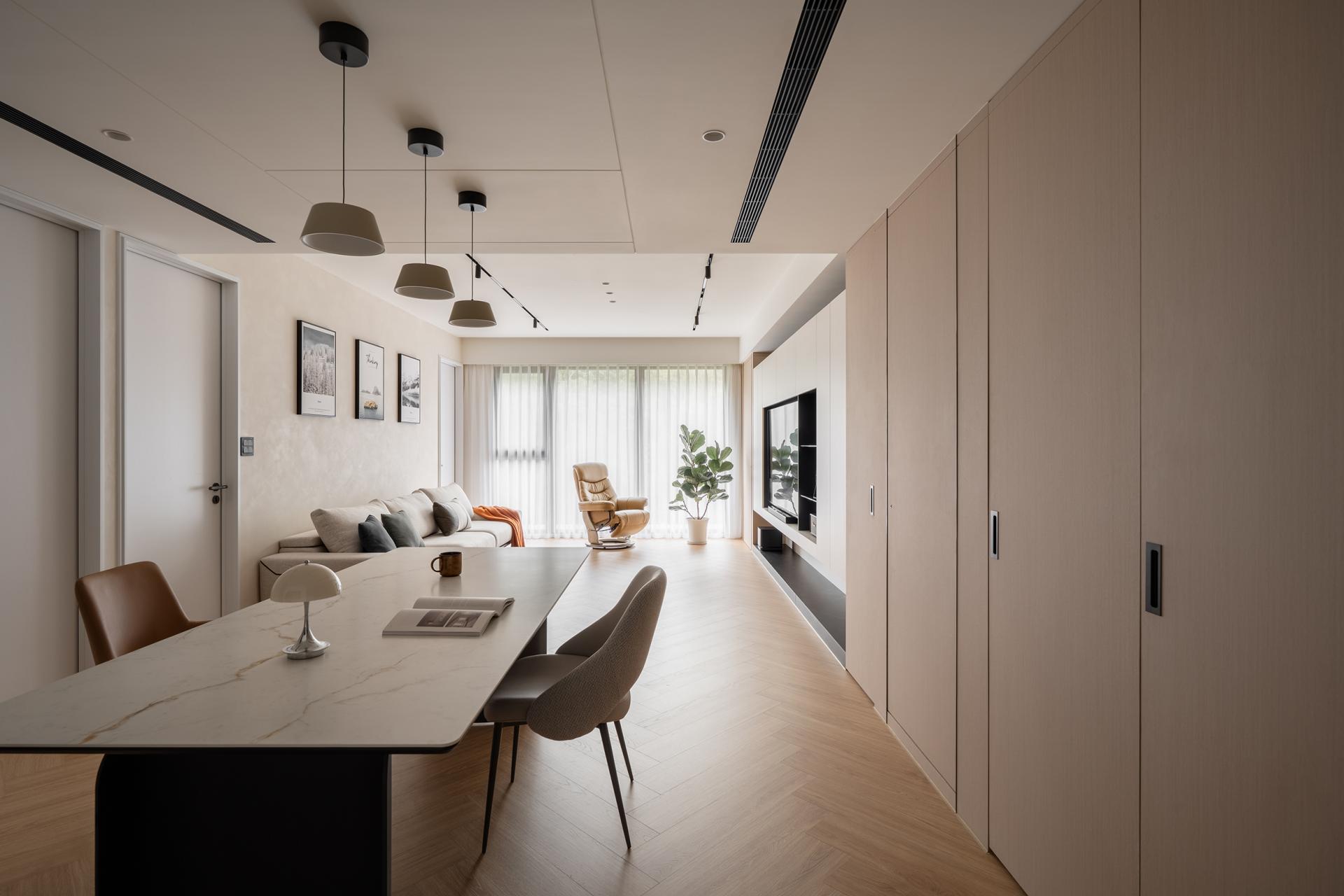 The social area is unified through gentle hues, enabling the greenery outside the windows to take center stage. As sunlight glides from the hillside into the living room, each wood grain resembles a fine stroke of time. The herringbone-patterned flooring extends along the line of sight, visually widening the room.