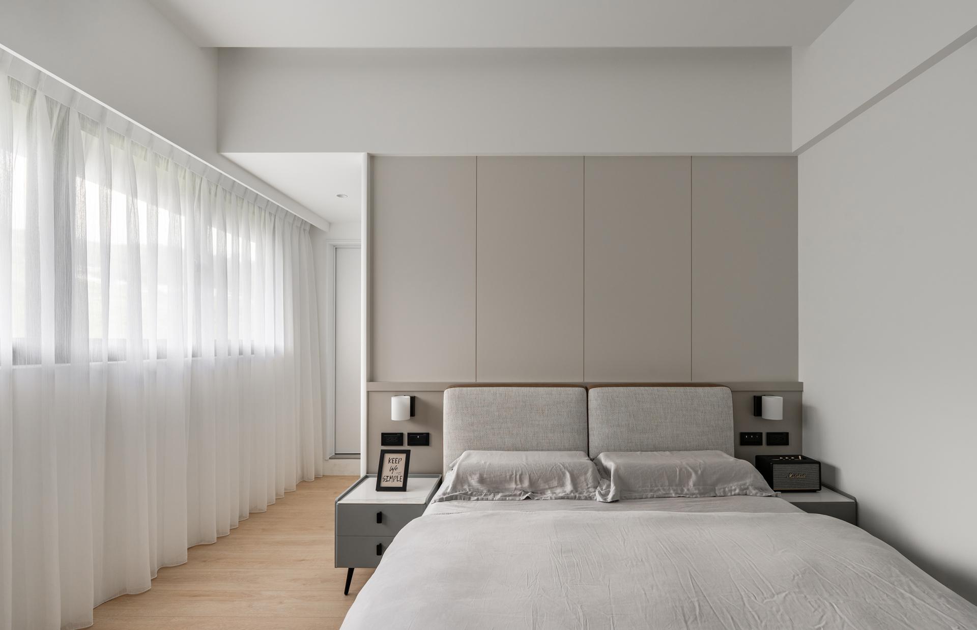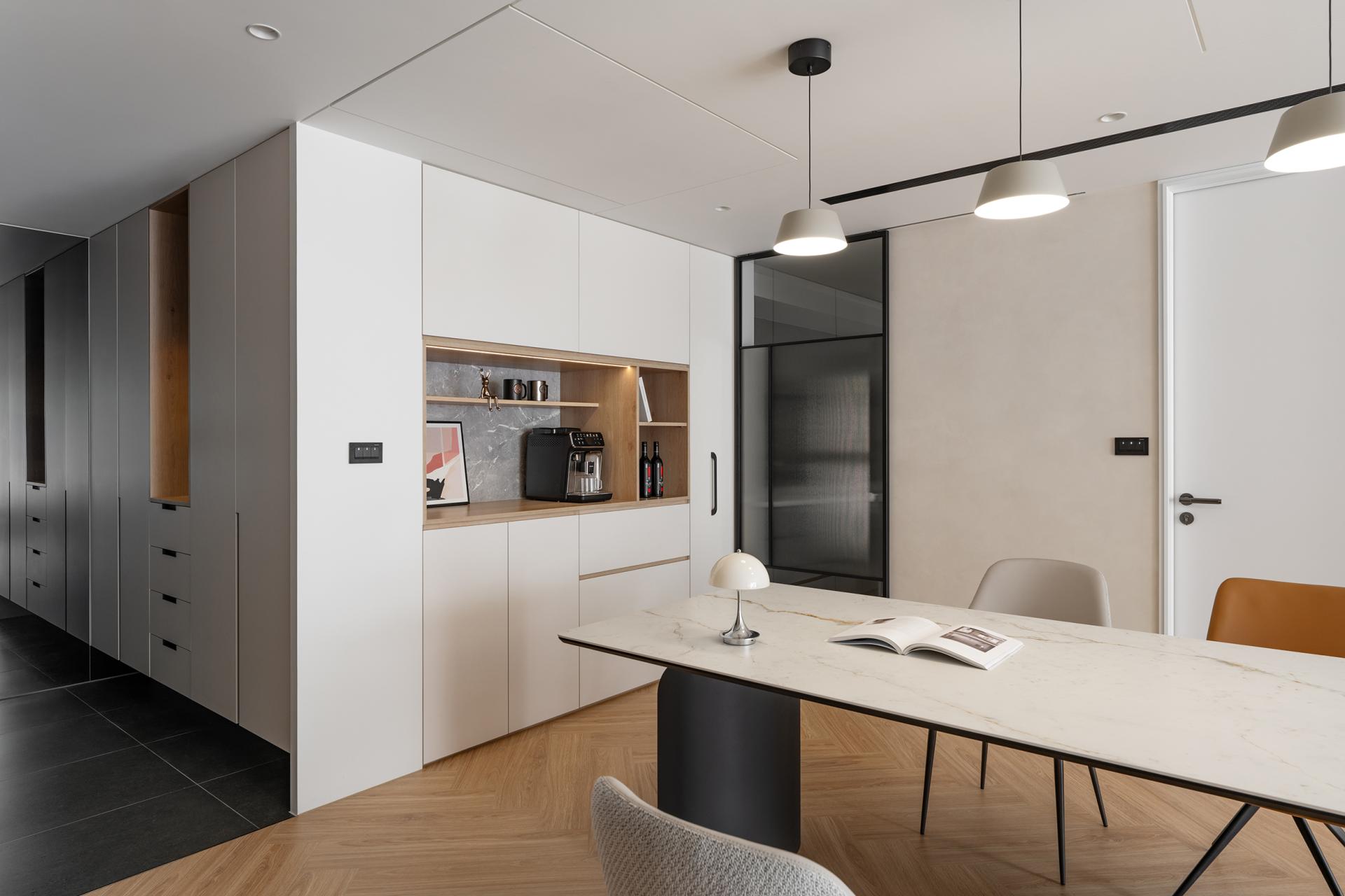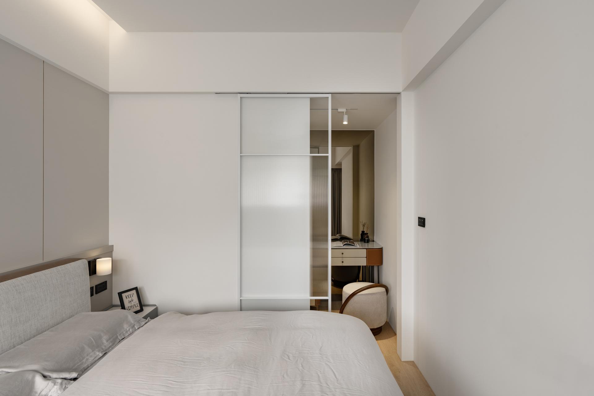 Minimalism serves as the design language, allowing scenery and light to become the true protagonists. Behind the bedroom, the dressing area is enclosed with fluted glass, creating a semi-transparent boundary. With sheer white curtains gently cascading, the refracted light dances across the floor, natural daylight is filtered, scattered, and pushed inward like a faint mist quietly settling into the space.
