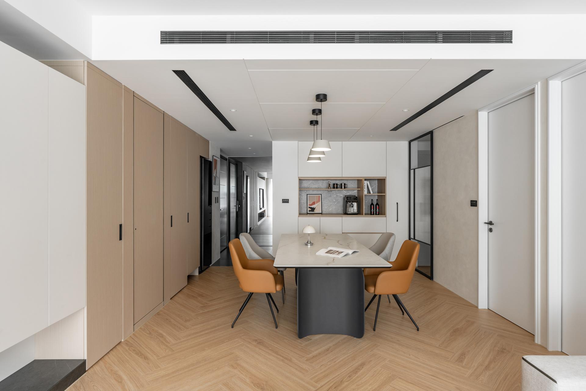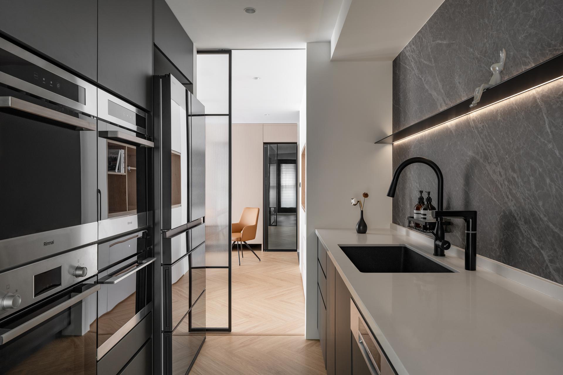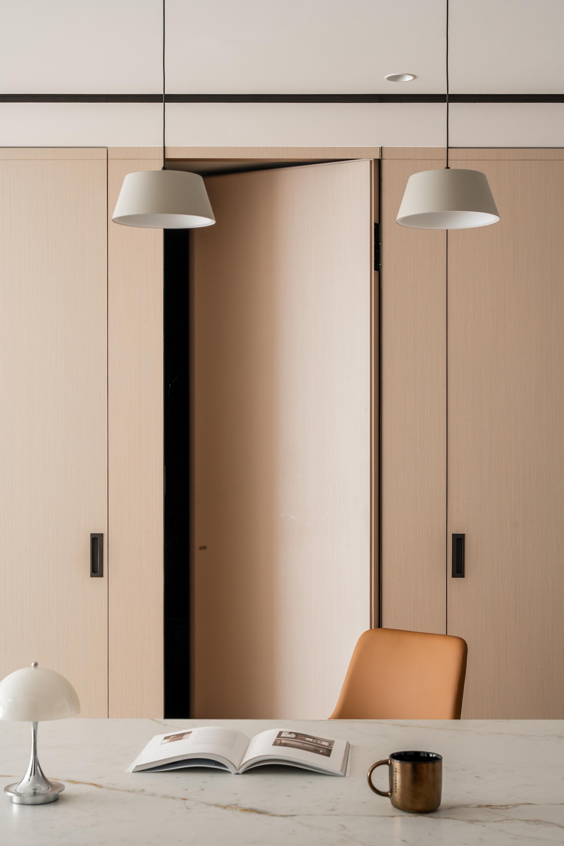 Minimalism serves as the design language, allowing scenery and light to become the true protagonists. Behind the bedroom, the dressing area is enclosed with fluted glass, creating a semi-transparent boundary. With sheer white curtains gently cascading, the refracted light dances across the floor, natural daylight is filtered, scattered, and pushed inward like a faint mist quietly settling into the space.