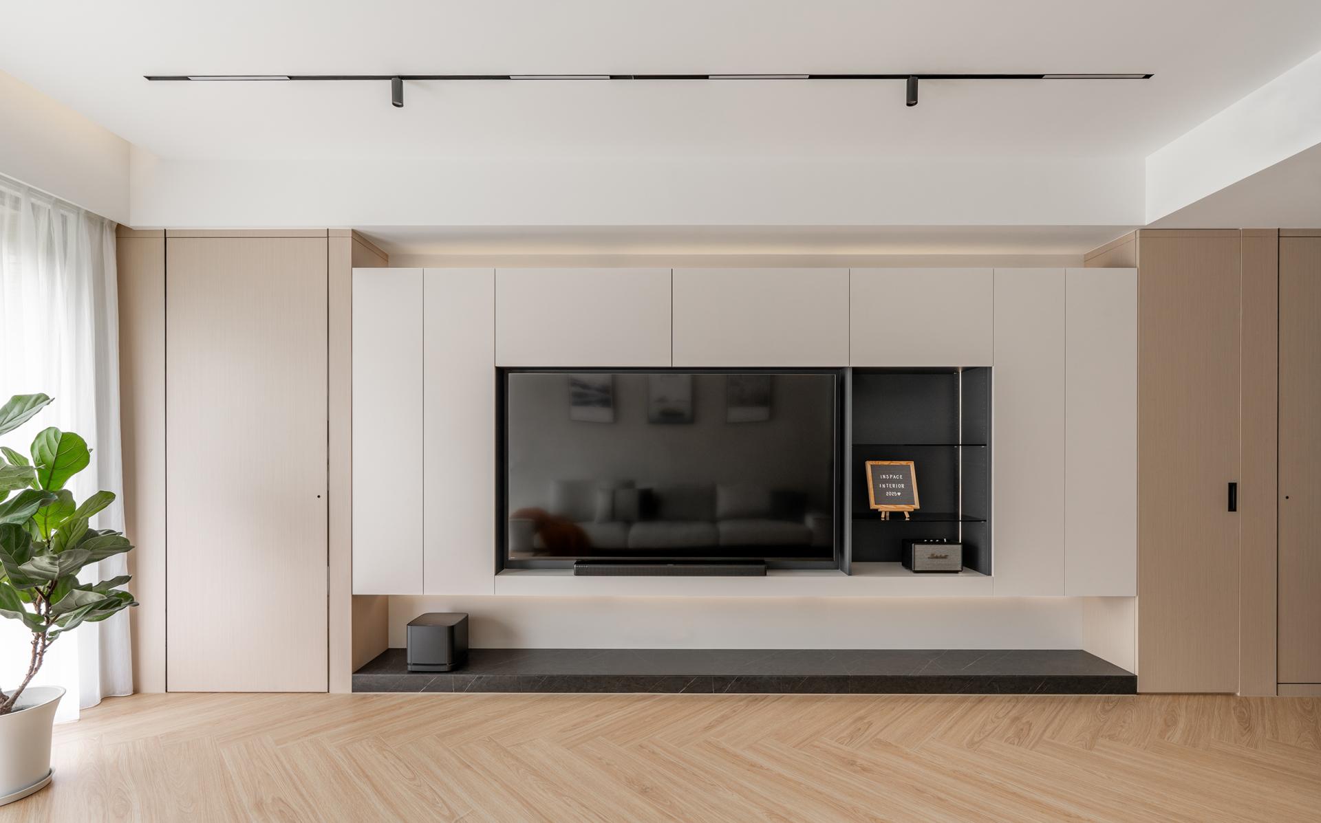 Upon entering, the eye is immediately drawn to the TV wall, where a mix of custom woodwork and system cabinetry forms clean, refined cuts, avoiding the visual heaviness typical of large volumes. Upper and lower lighting strips shape a soft glow, while a black display cabinet on the side anchors the composition, balancing the interplay of white and wood.