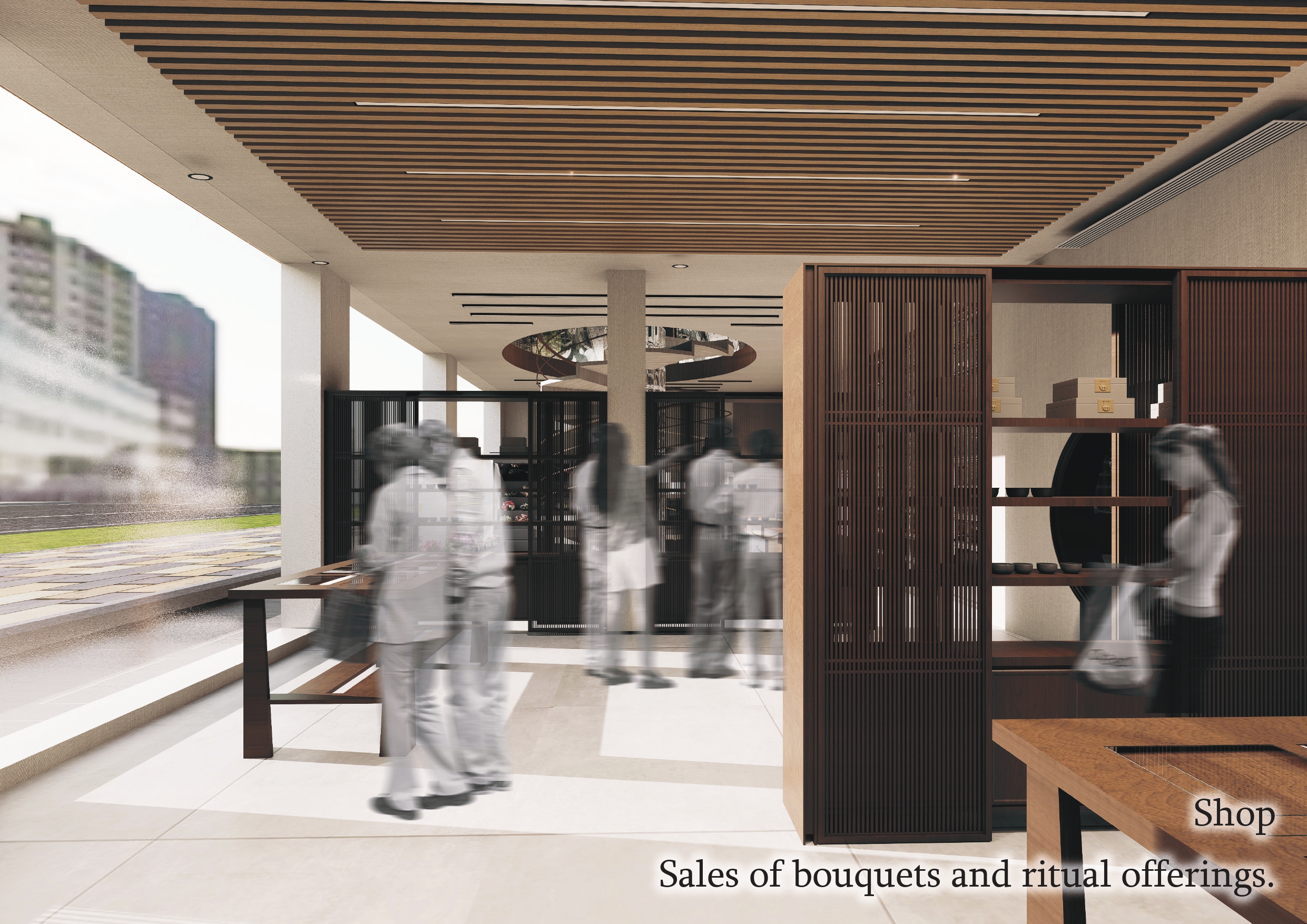 Urban Integration: To foster daily interaction, the program includes a restaurant and a shop selling ritual offerings and bouquets, catering to both association members and the general public.