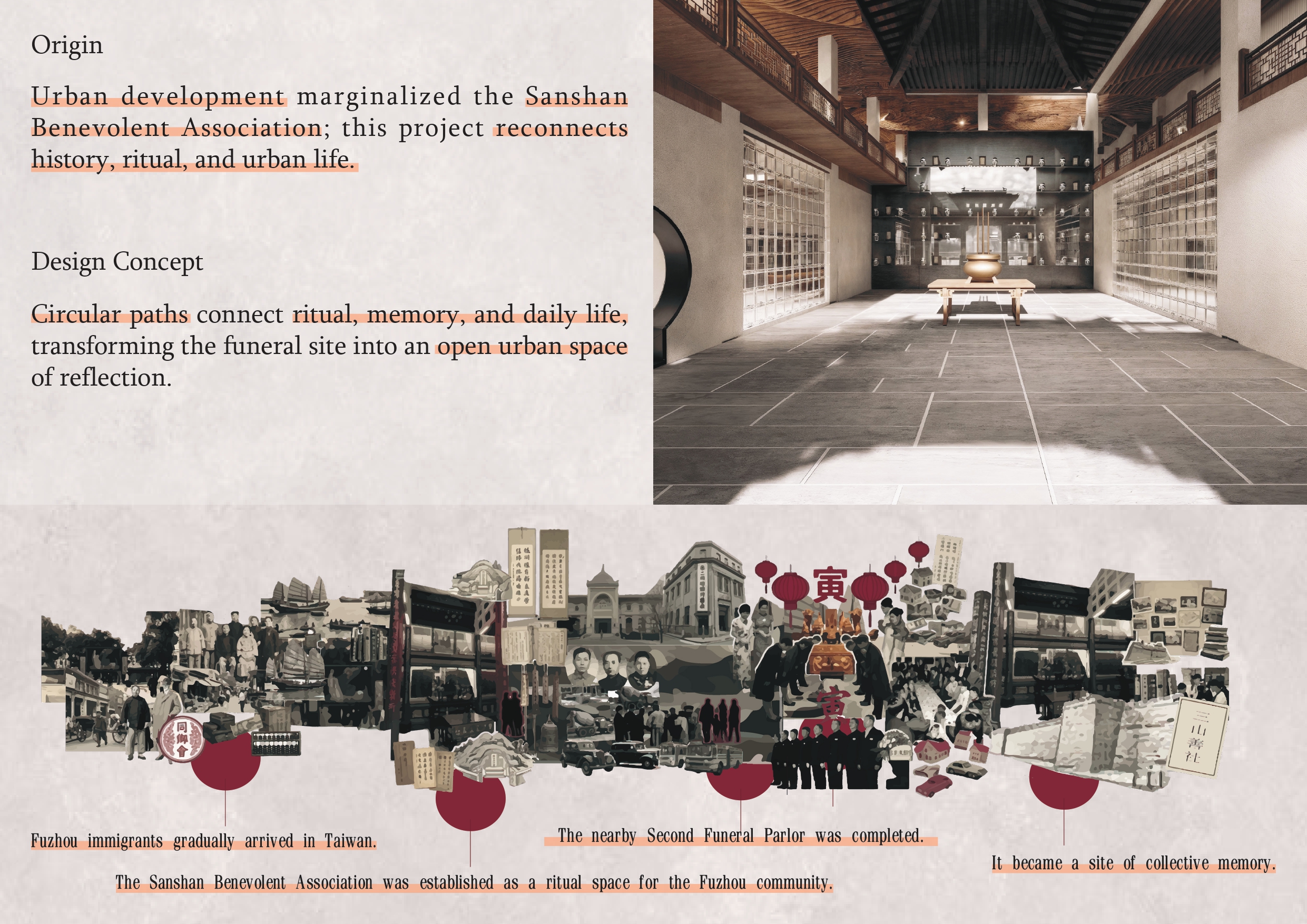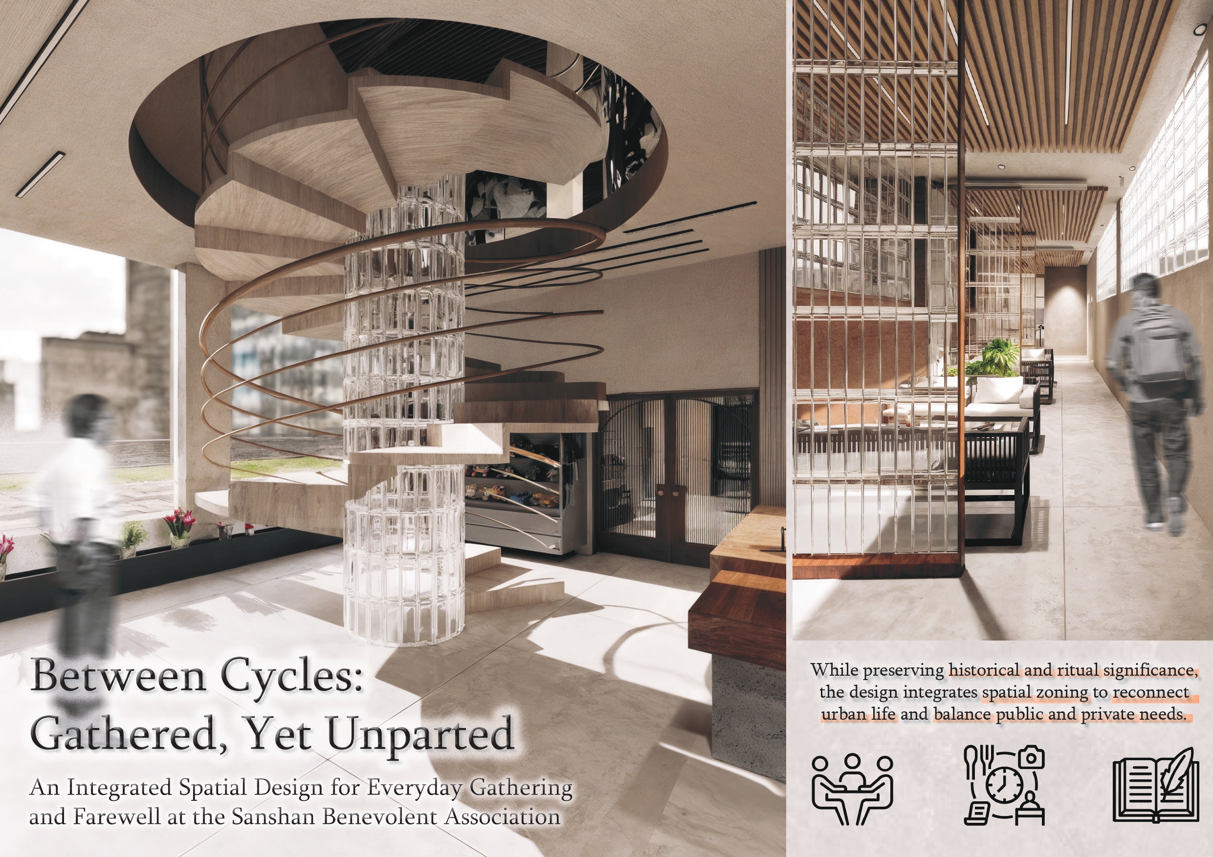 "Between Cycles" is an integrated spatial design for the Sanshan Benevolent Association, a historic institution established by Fuzhou immigrants in Taiwan. Located adjacent to the city’s Second Funeral Parlor, the site has long been marginalized by modern urban development. This project seeks to reconnect history, ritual, and contemporary urban life by transforming a traditionally closed funeral site into an open, reflective cultural space that balances public engagement with private sanctity.