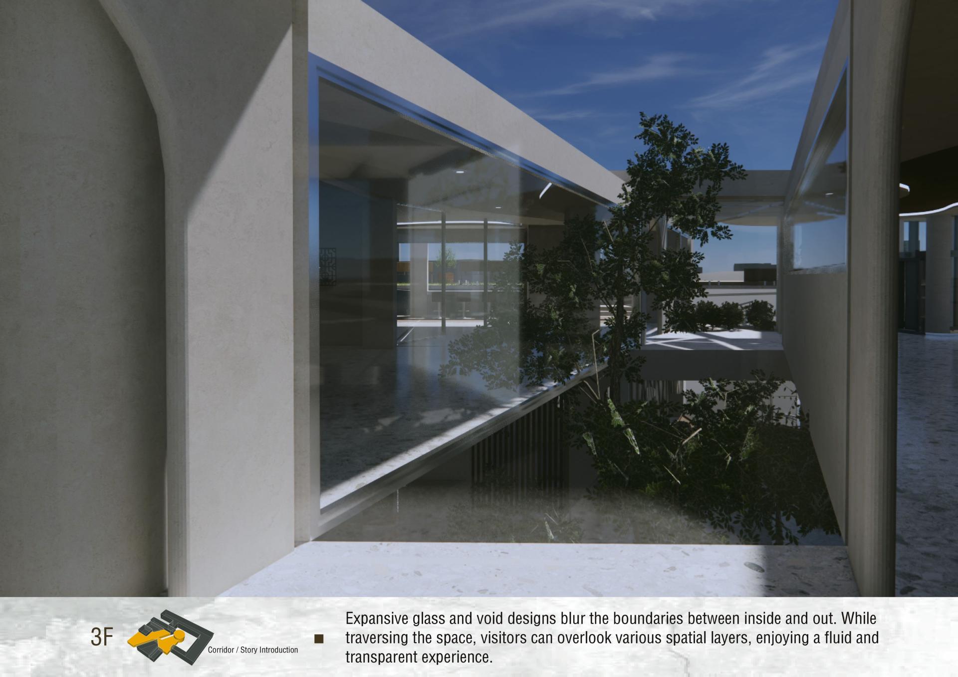 The spatial layout employs expansive glass curtains and void designs to effectively blur the boundaries between interior and exterior, allowing visitors to overlook rich spatial layers while traversing the story introduction area, enjoying a fluid and transparent experience. Simultaneously, the ceiling features flowing geometric panels and integrated linear lighting, which not only define functional zones but also serve as visual guides to enhance the overall narrative. This project is more than a static exhibition space; it is a catalyst for cultural revival, inviting observers to rediscover the warmth of the land within a pure modern structure and allowing traditional culture to flourish anew in contemporary life.