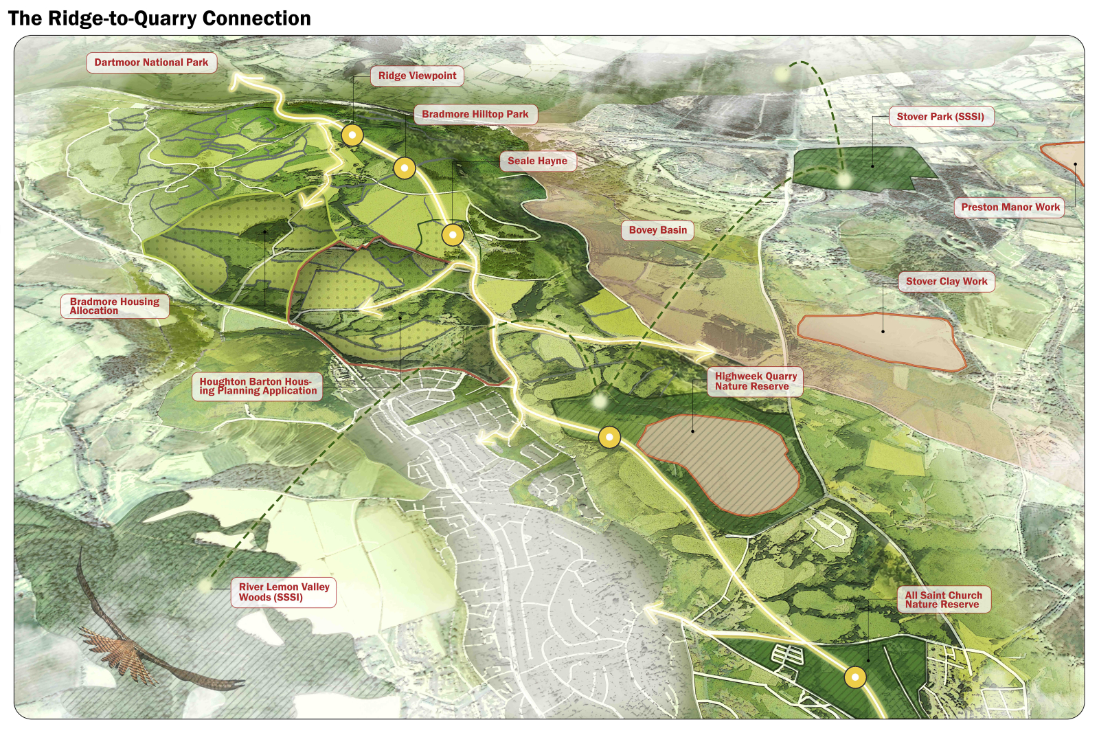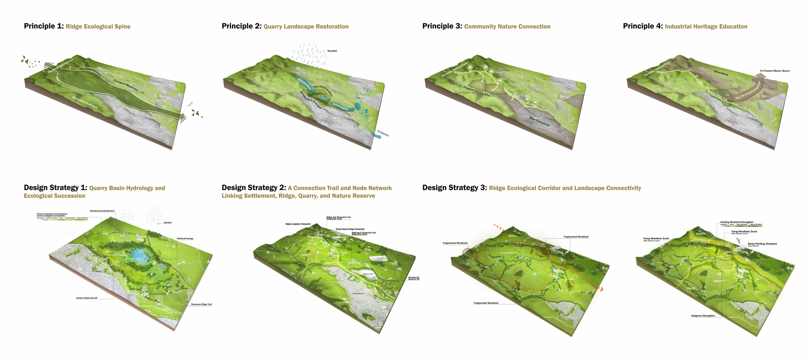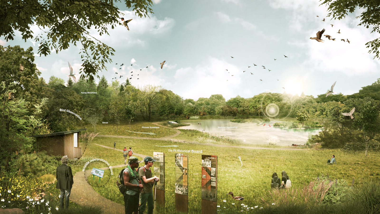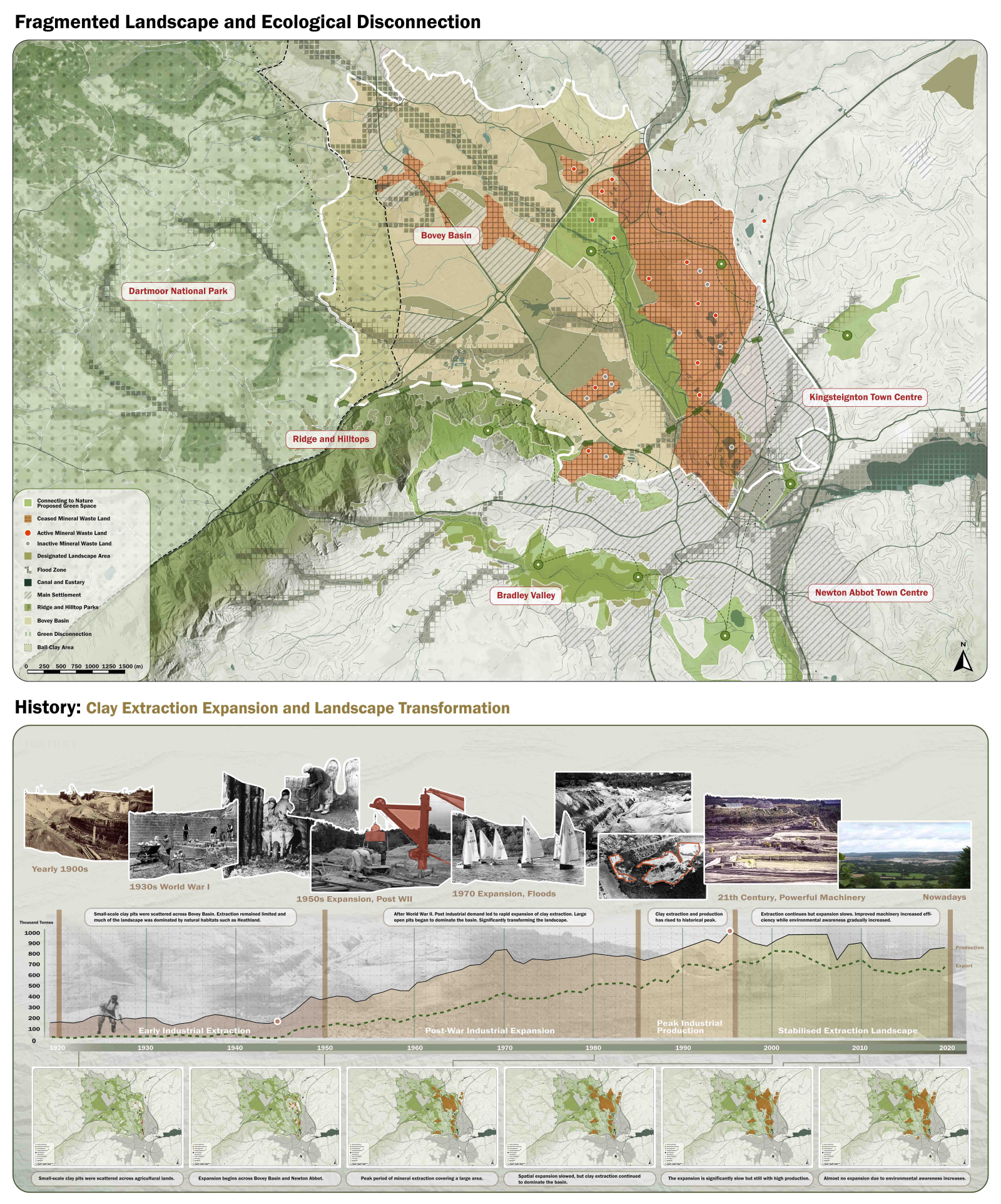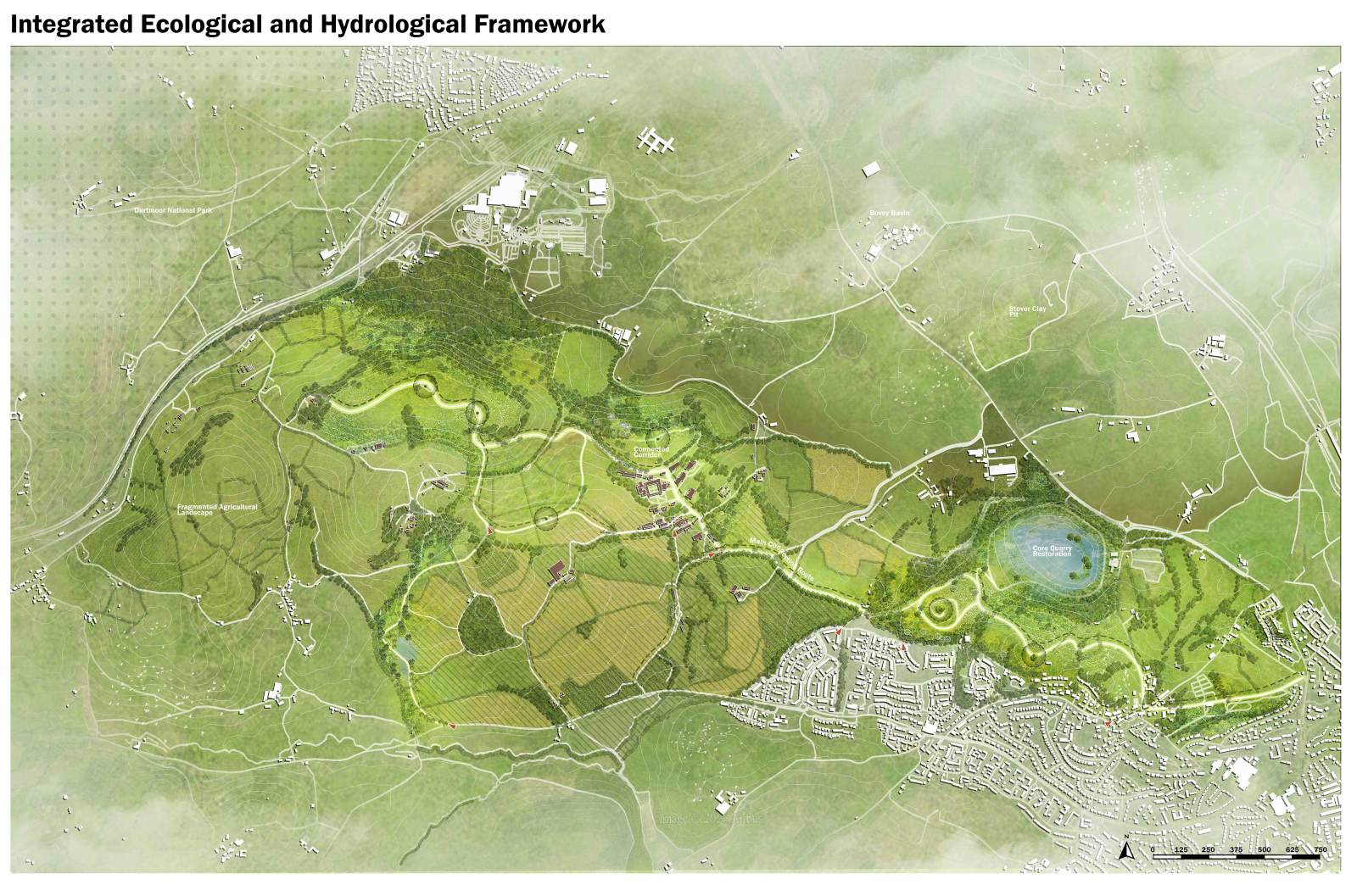 This project reclaims a former clay extraction landscape in the Bovey Basin, transforming a fragmented and degraded terrain into a cohesive ecological and public environment. Decades of industrial activity have altered hydrological systems, reduced biodiversity, and severed connections between surrounding communities and their landscape. The proposal reimagines the site as a designed system where water, ecology, and movement are integrated into a clear spatial framework that supports long-term environmental and social regeneration.