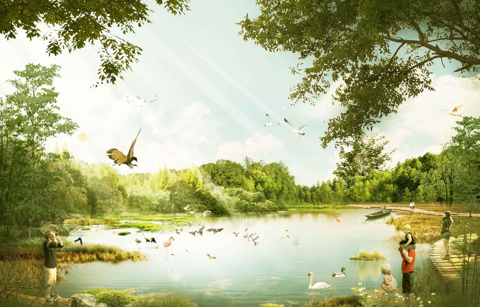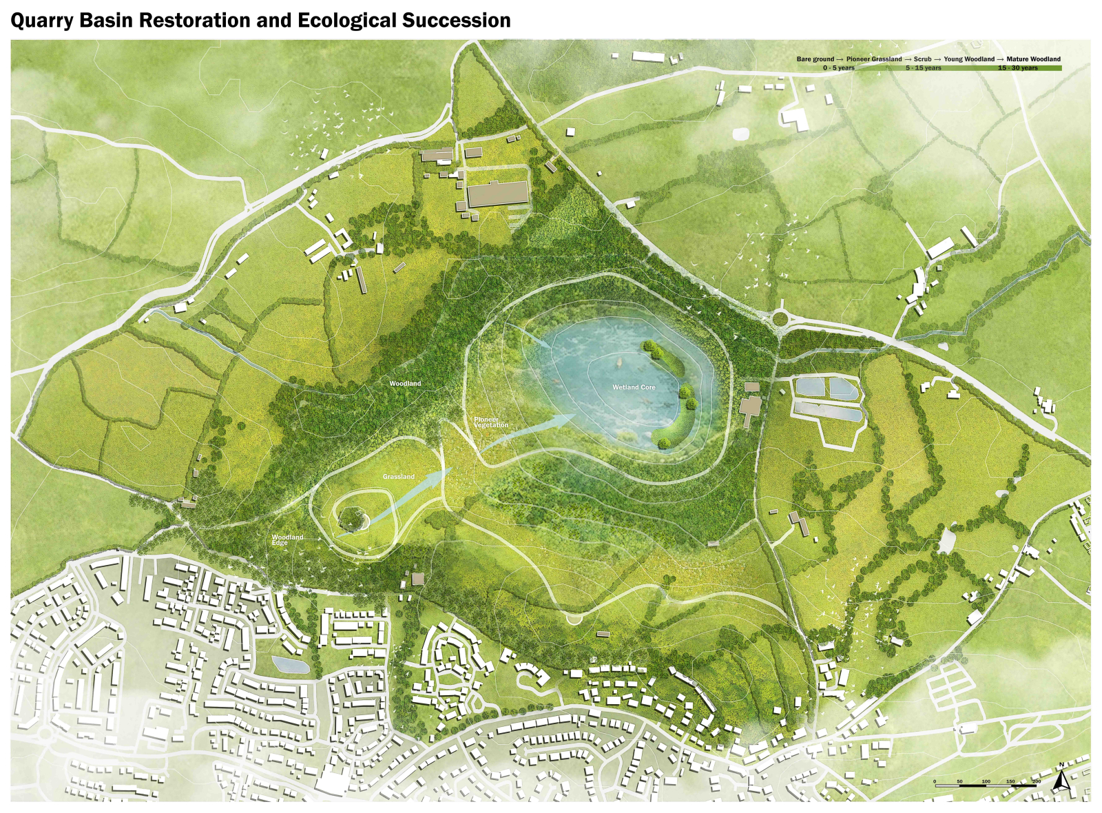 At the core of the project is the transformation of the quarry basin into a dynamic wetland landscape. Former extraction voids are reshaped into interconnected water bodies that restore natural hydrological processes while initiating ecological succession. These water systems are designed to evolve over time, supporting a gradual transition from pioneer species to more complex ecological communities. As succession progresses, a diverse mosaic of wetland, grassland, and woodland habitats emerges, forming a resilient ecological structure that adapts to changing environmental conditions.