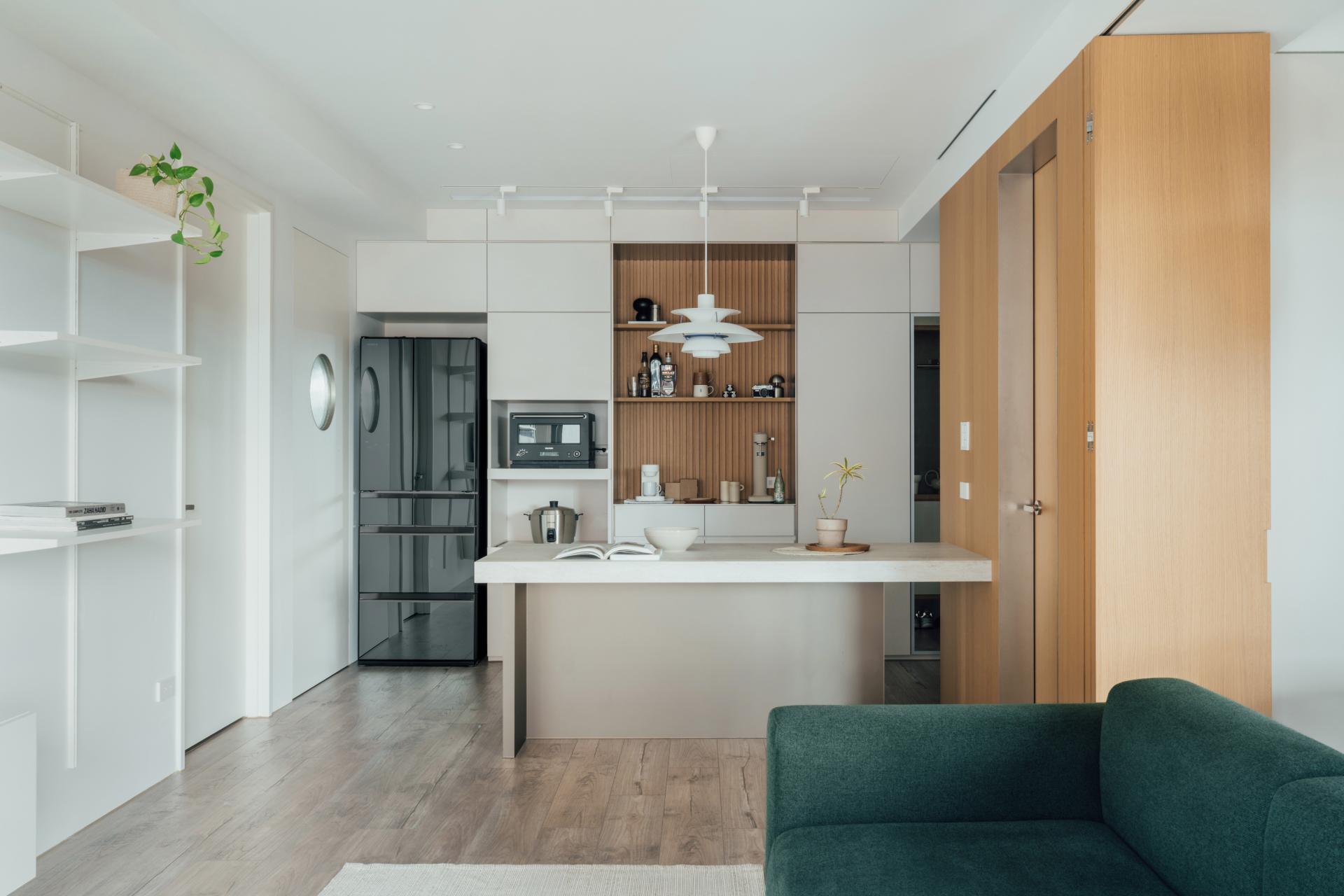 The kitchen is kept more compact and contained, while the refrigerator, appliance cabinet, and coffee station are pulled outward into the open layout. This redistribution shifts part of the domestic program into the shared space, enlarging the living area while maintaining a clear distinction between cooking and living.