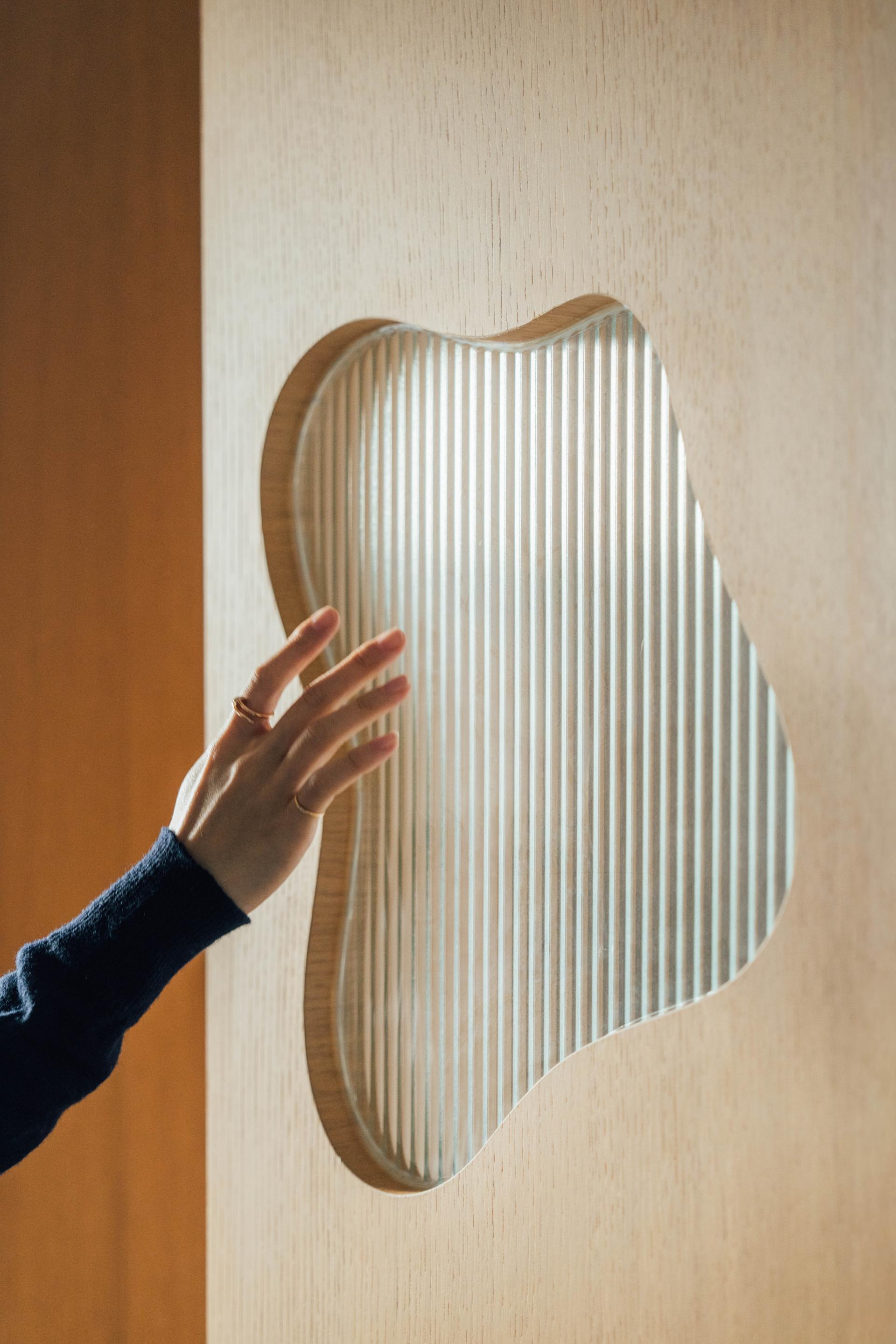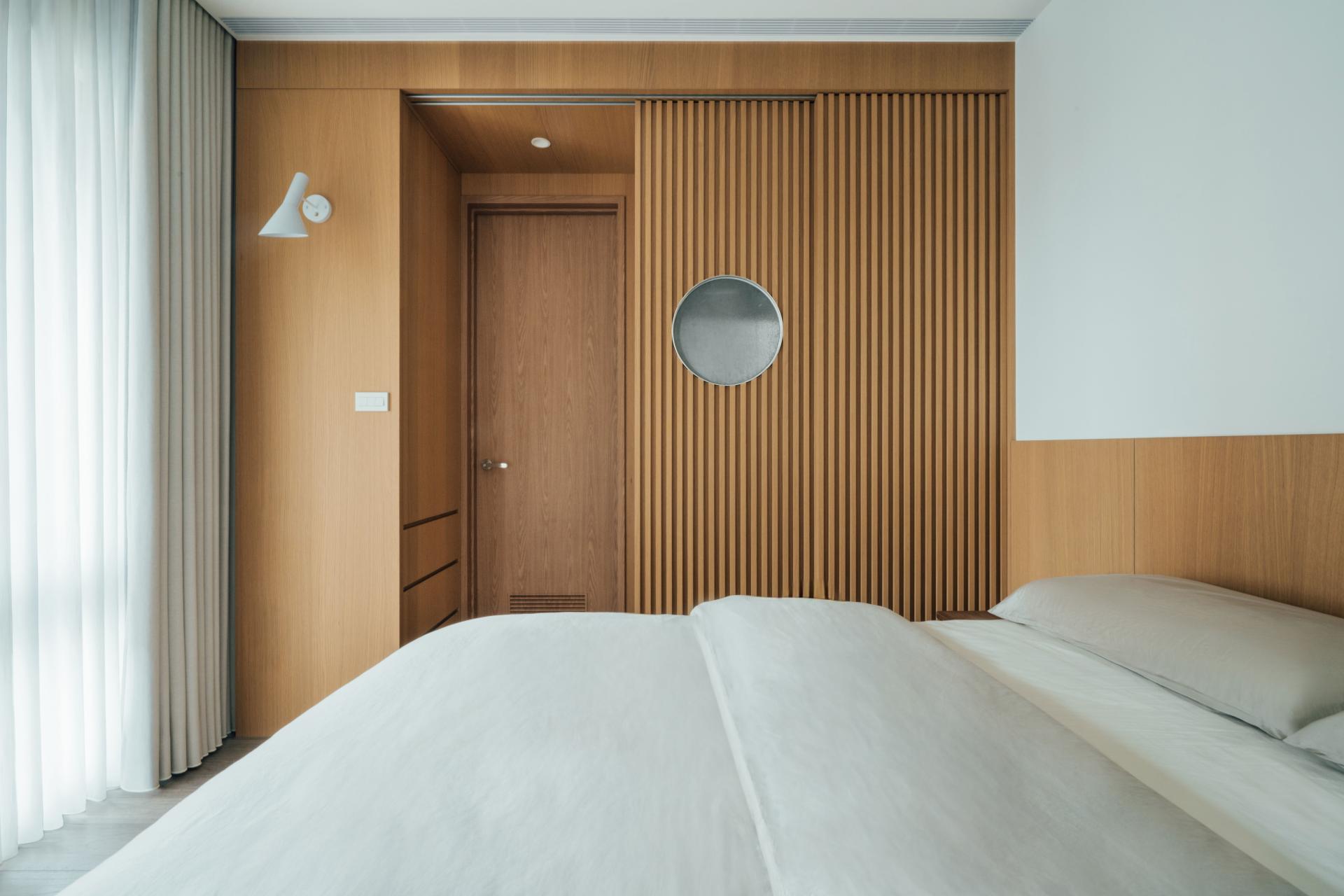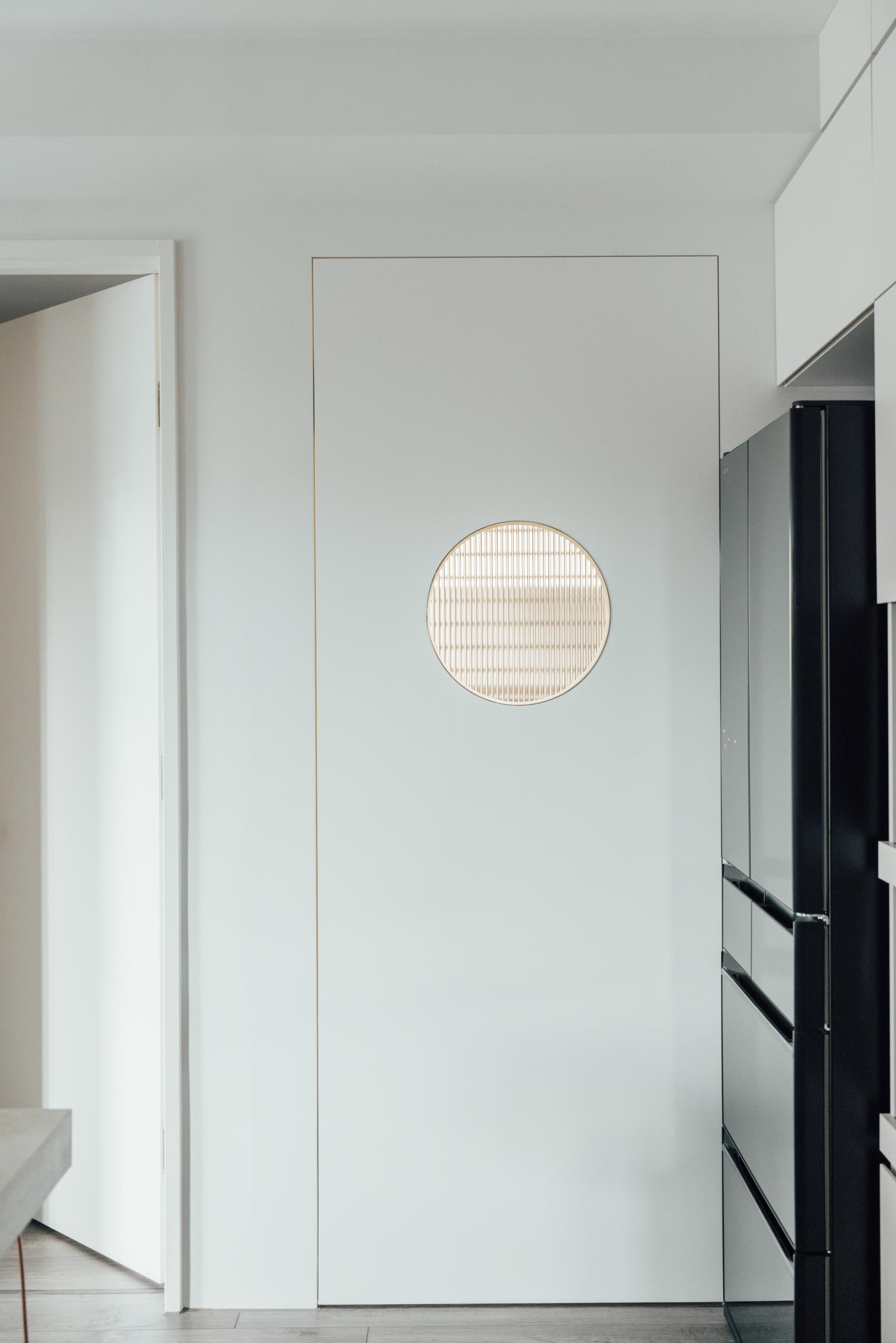 A small opening is carved into the partition, allowing light to pass through while maintaining a visual connection between spaces. Its irregular form introduces a subtle sense of play within an otherwise restrained framework.