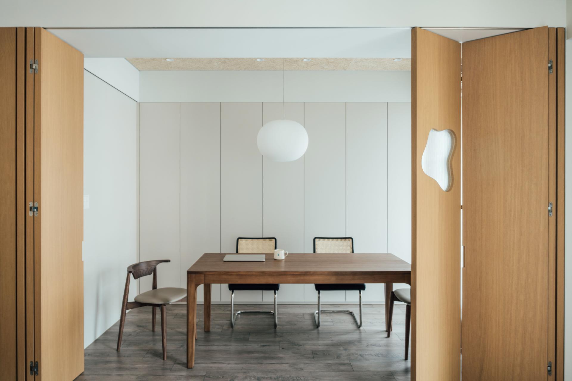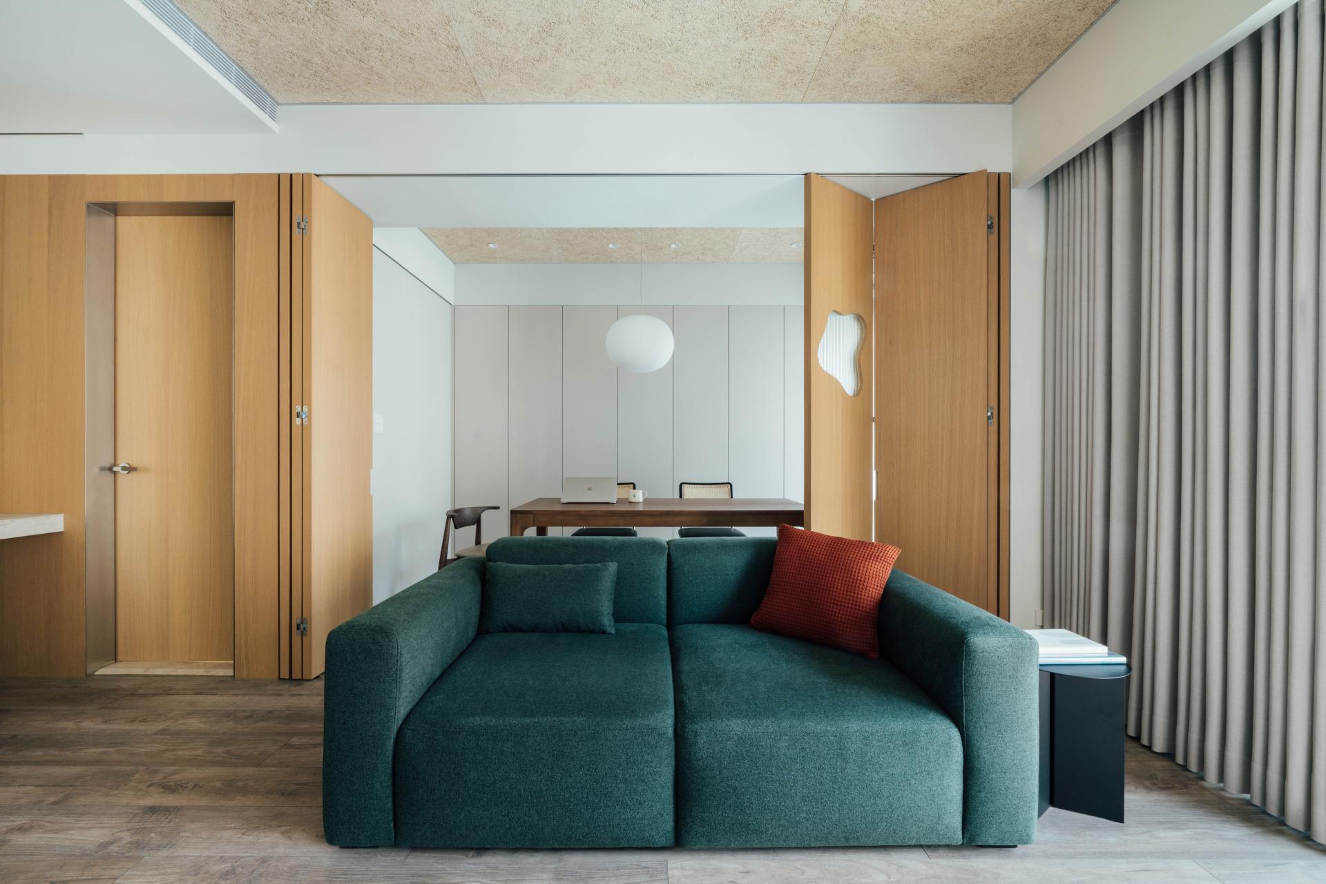 A folding partition is introduced between the living and dining areas, allowing the two spaces to remain visually connected while enabling moments of separation.