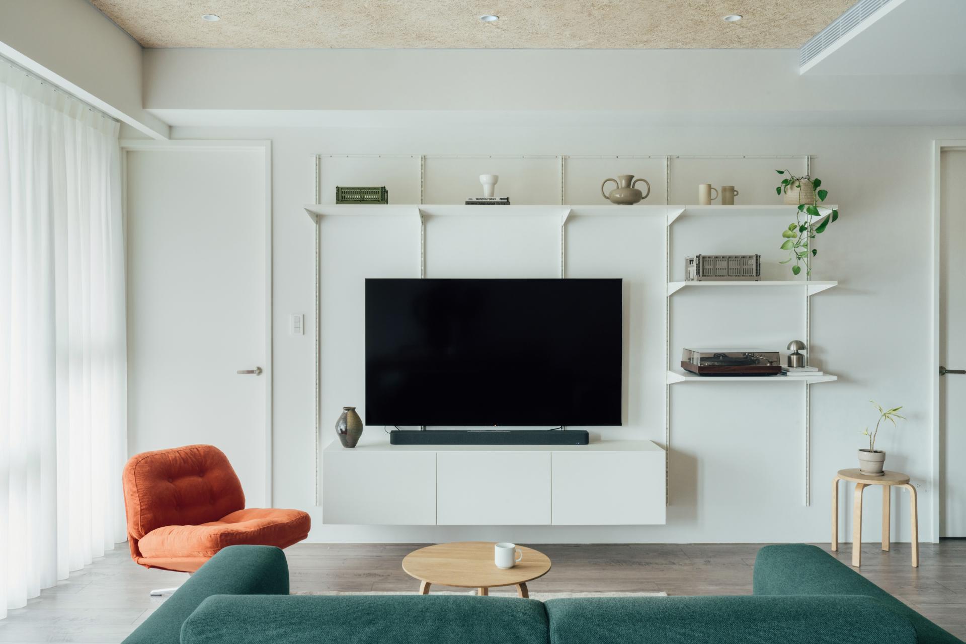This apartment in Yangbei, Xindian is reconfigured from a three-bedroom layout into a two-bedroom setup. The removal of an existing wall expands the main living area, allowing a shared space for dining and casual working to take shape.