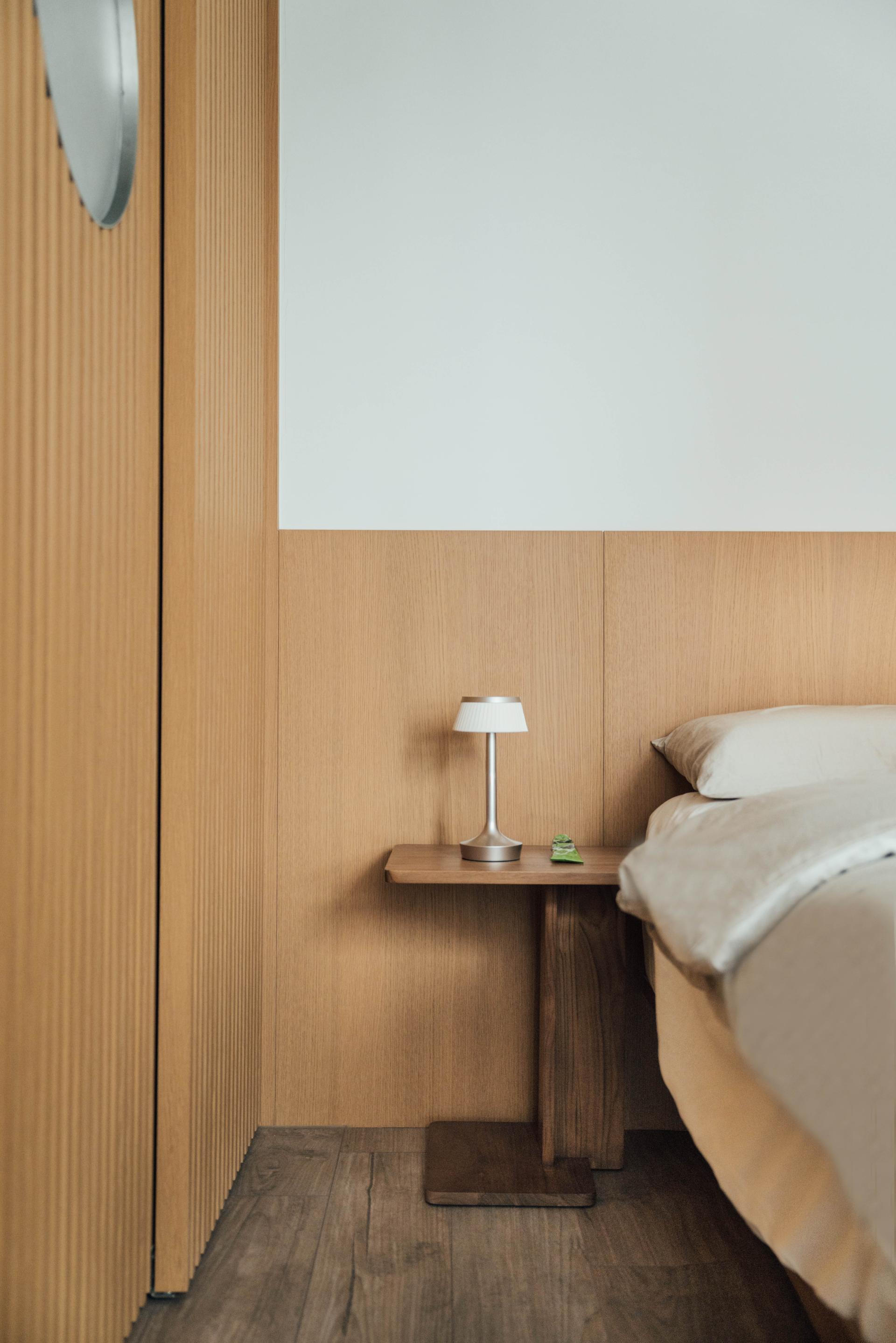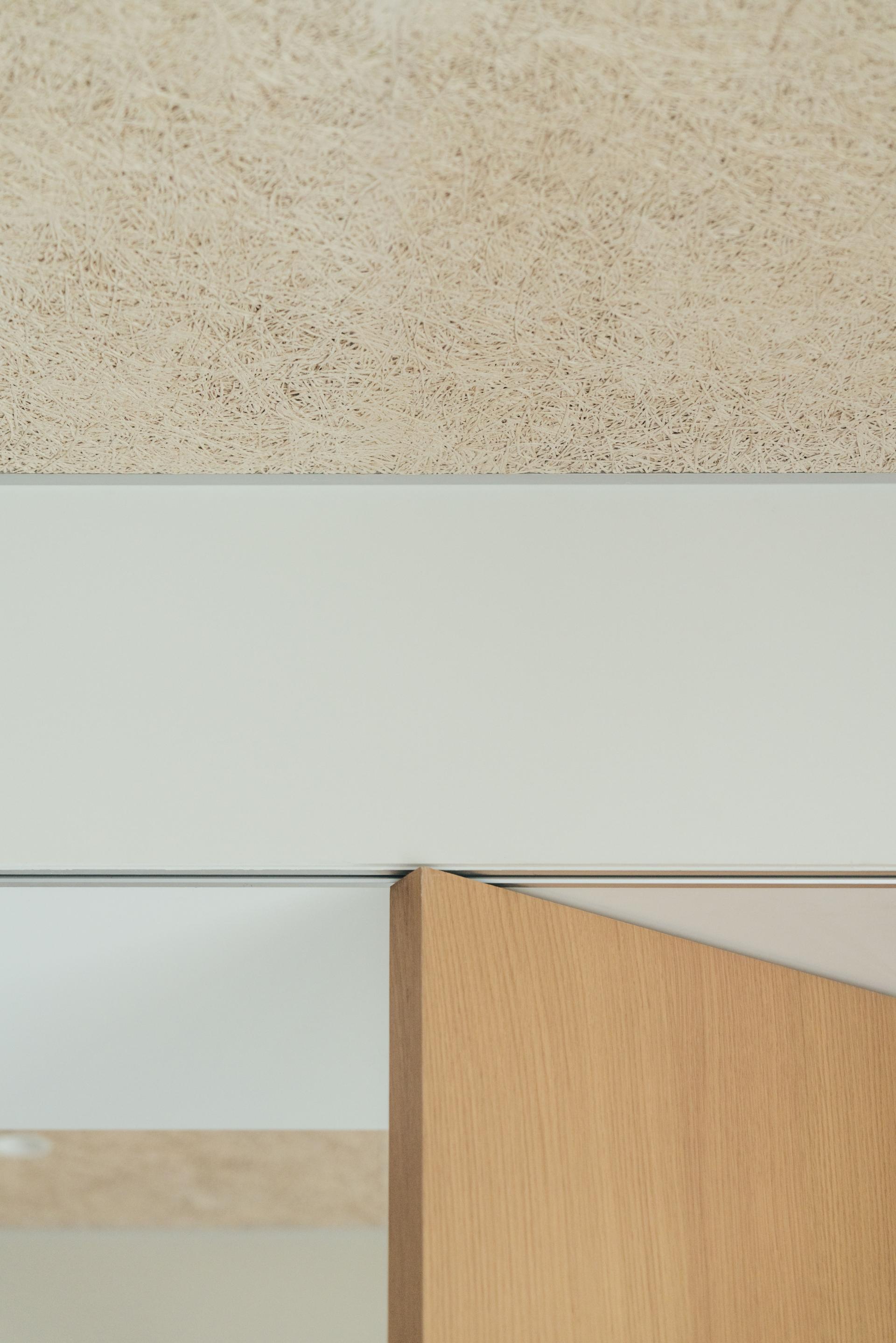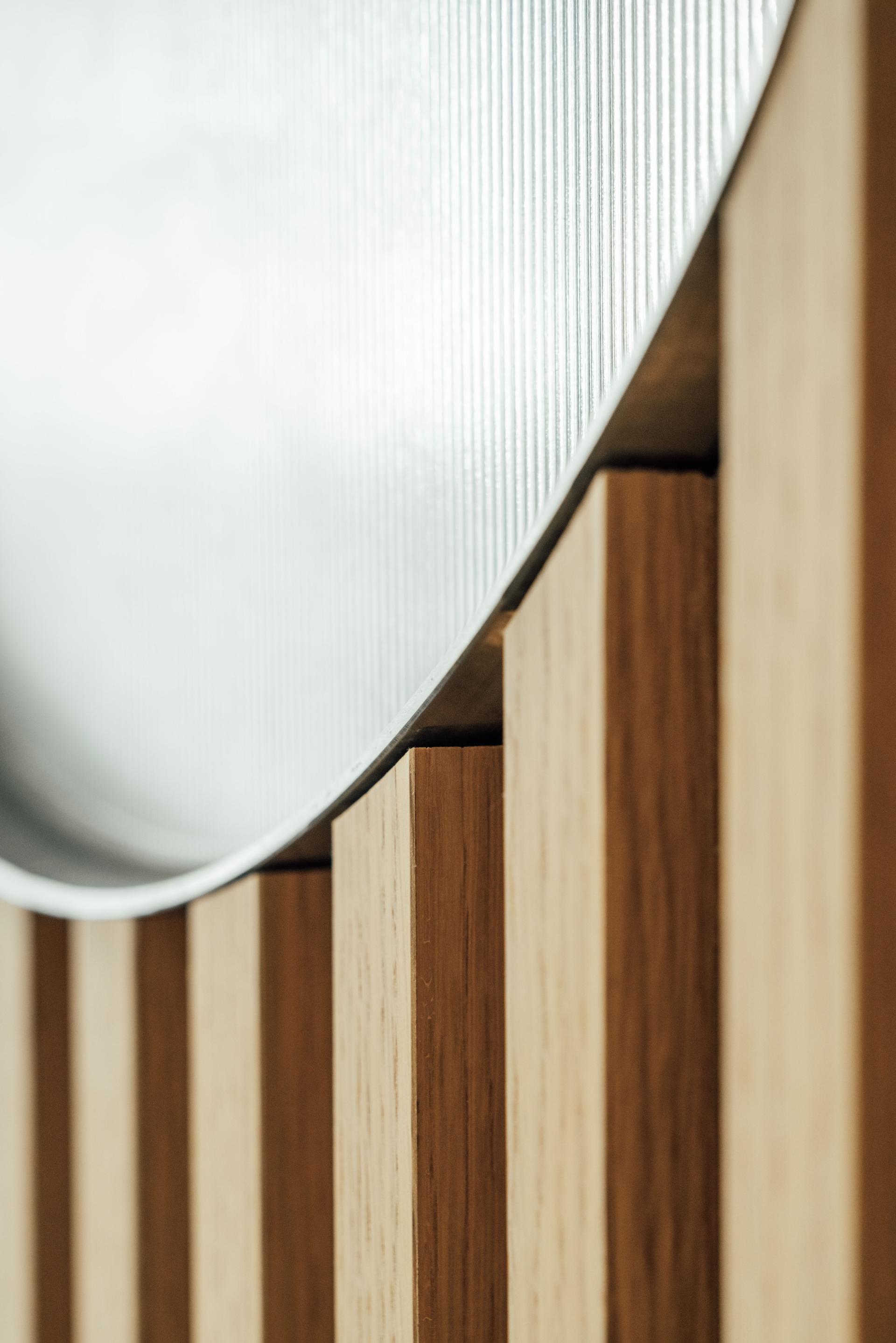 Warm wood tones run throughout the interior, creating a continuous material presence. Fluted surfaces add texture, while stainless steel accents introduce a subtle contrast. A ceiling finish in recycled wood wool panels introduces a softer acoustic layer. The material palette prioritizes accessible, cost-effective materials, complemented by a deliberate spatial approach that defines the overall character of the interior.