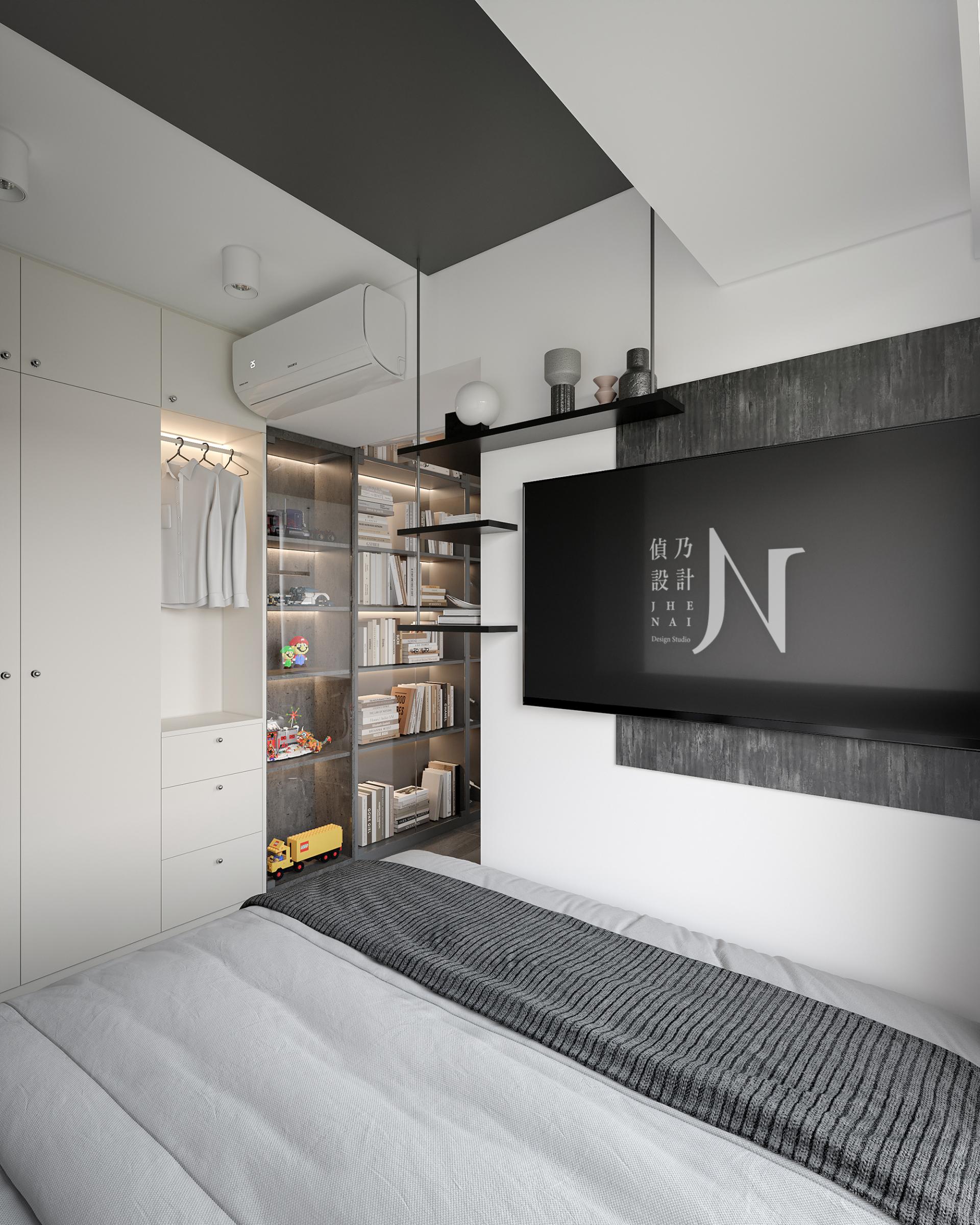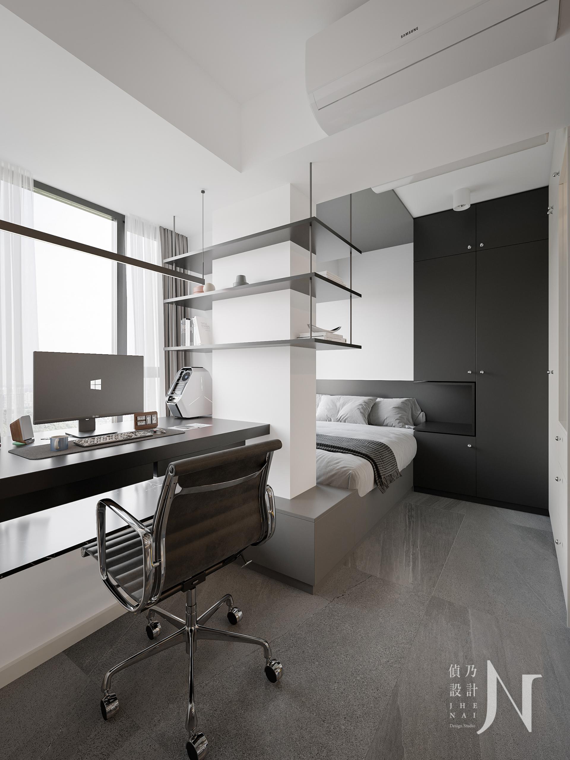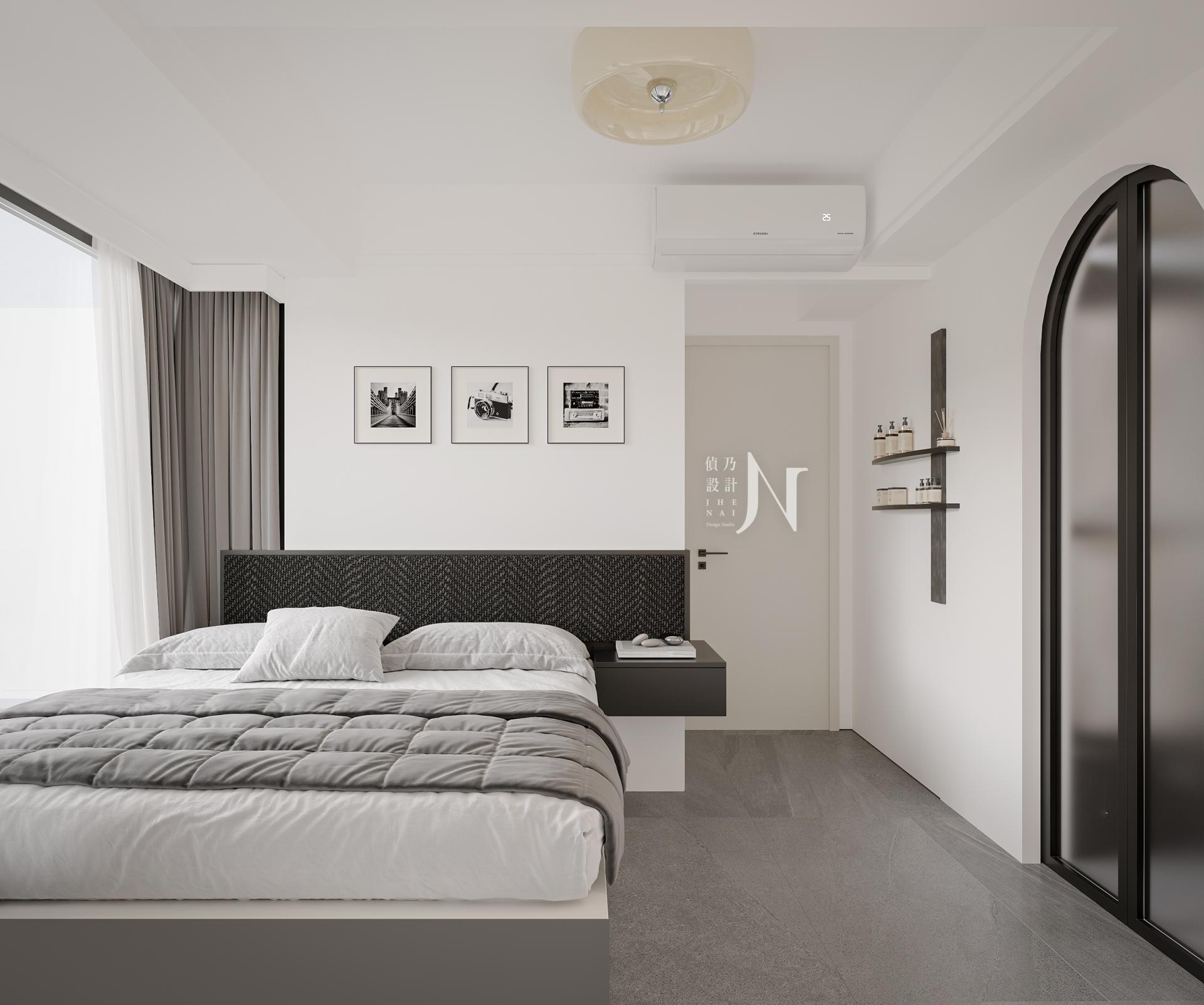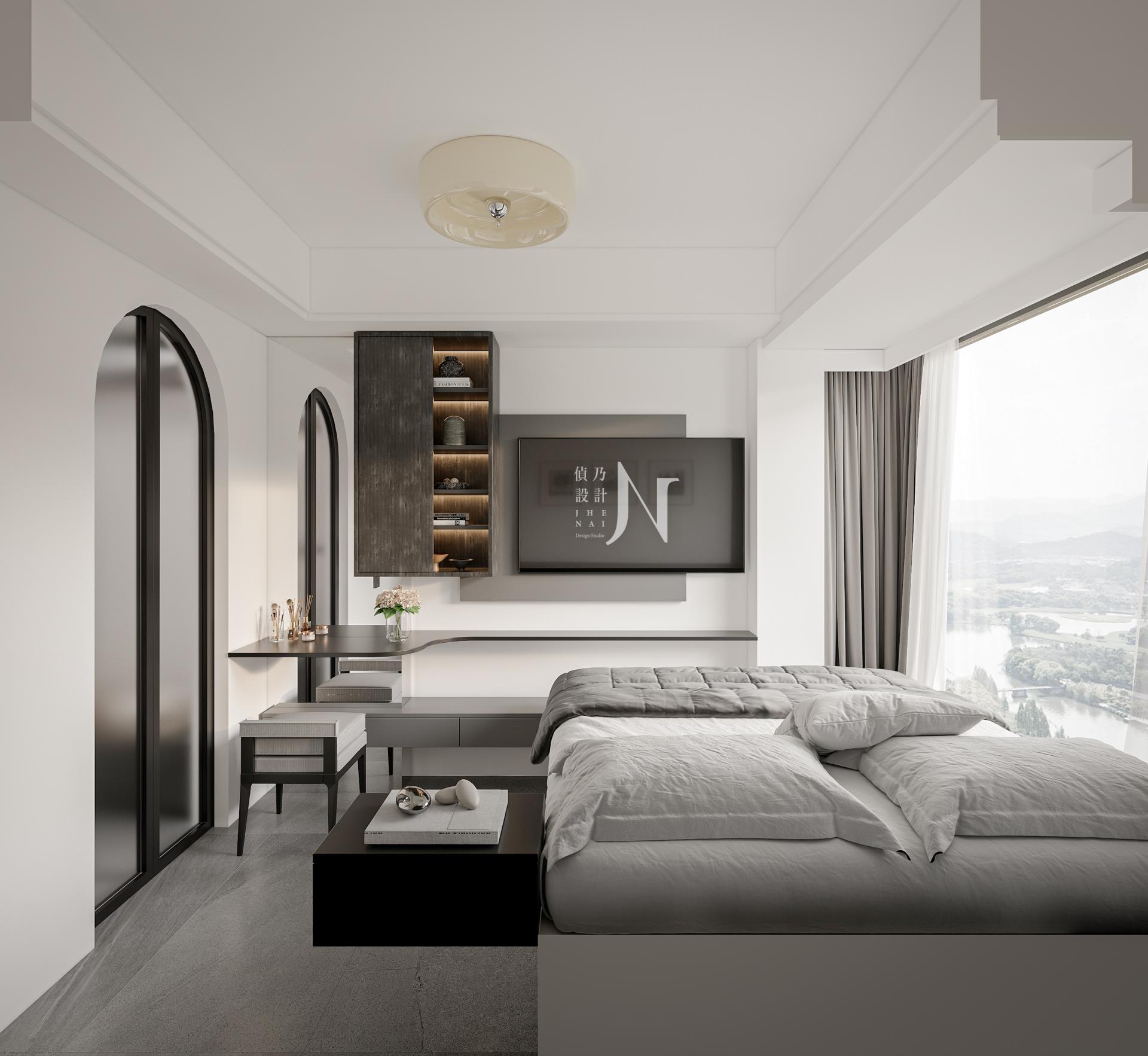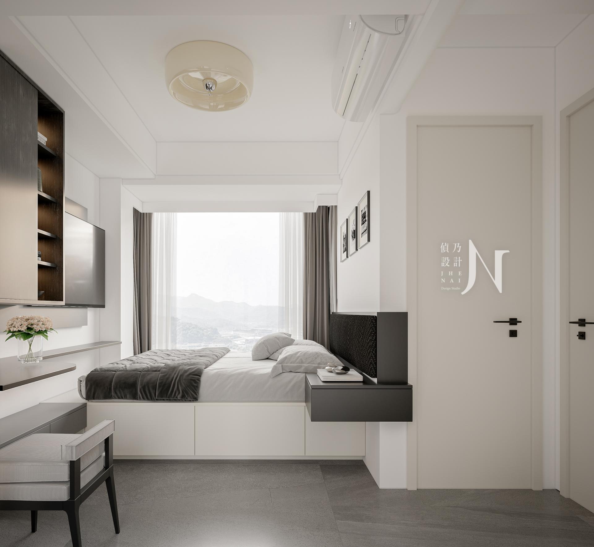 The bedroom continues this minimalist language—simple, clean forms and muted tones—creating a quiet rhythm that supports both body and mind. A compact desk and shelving nook naturally became a retreat for focus and reflection.