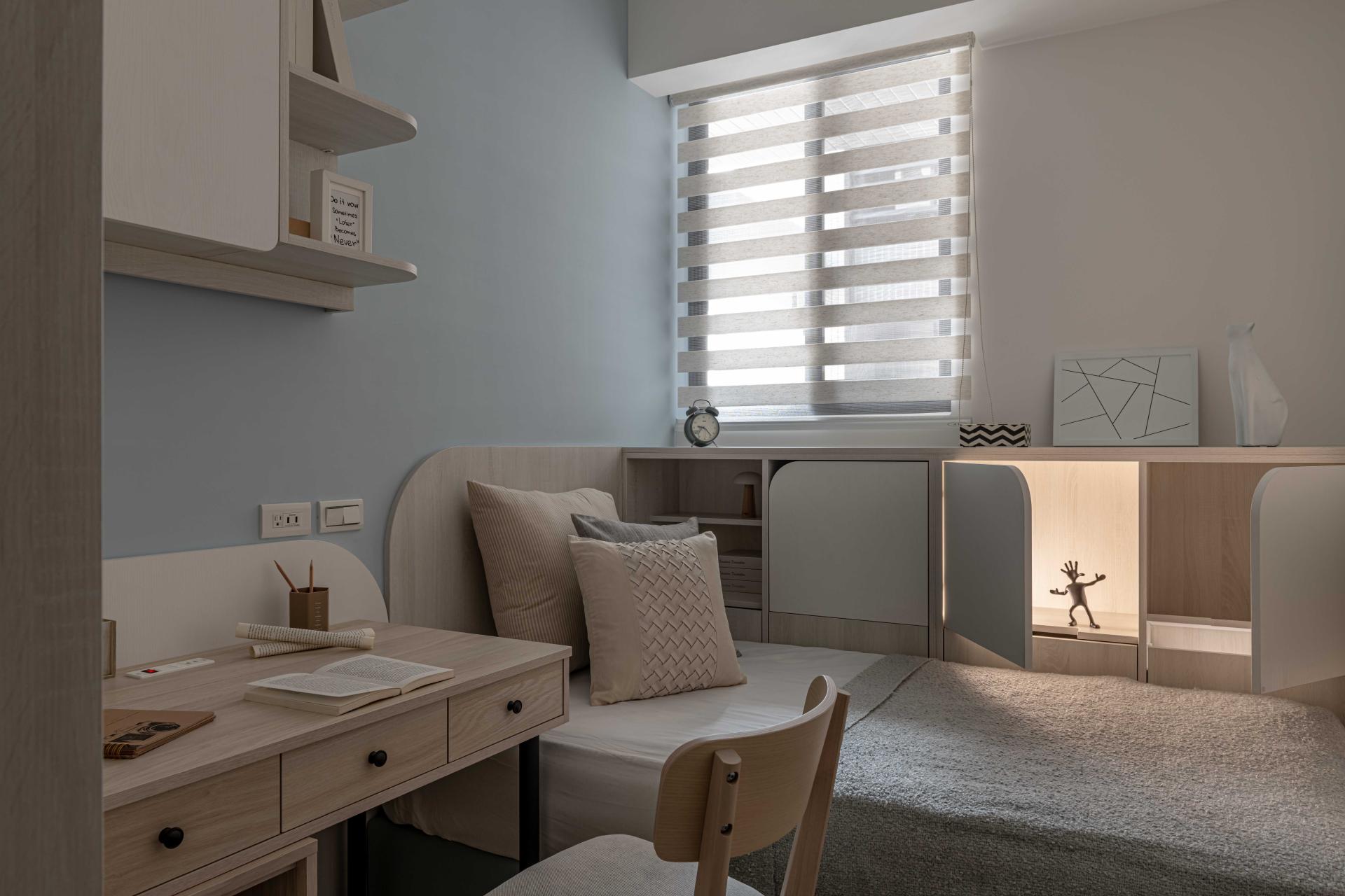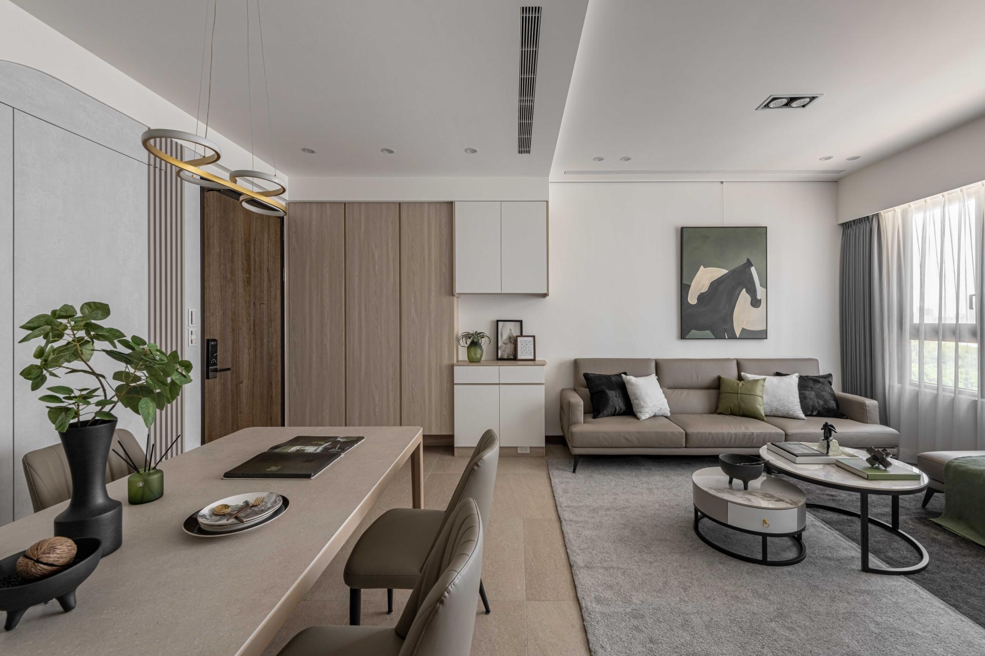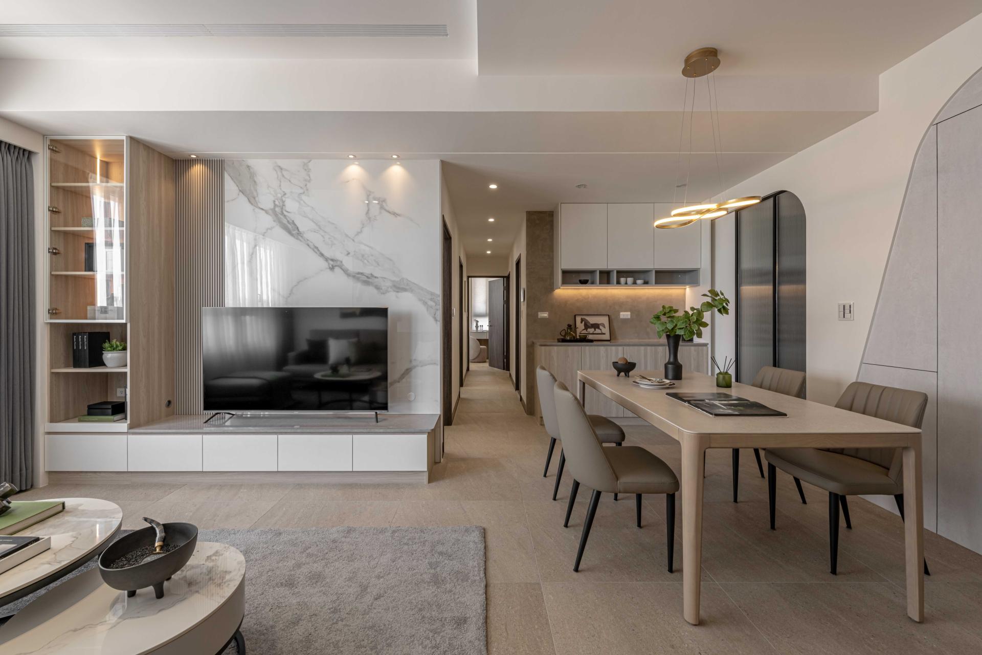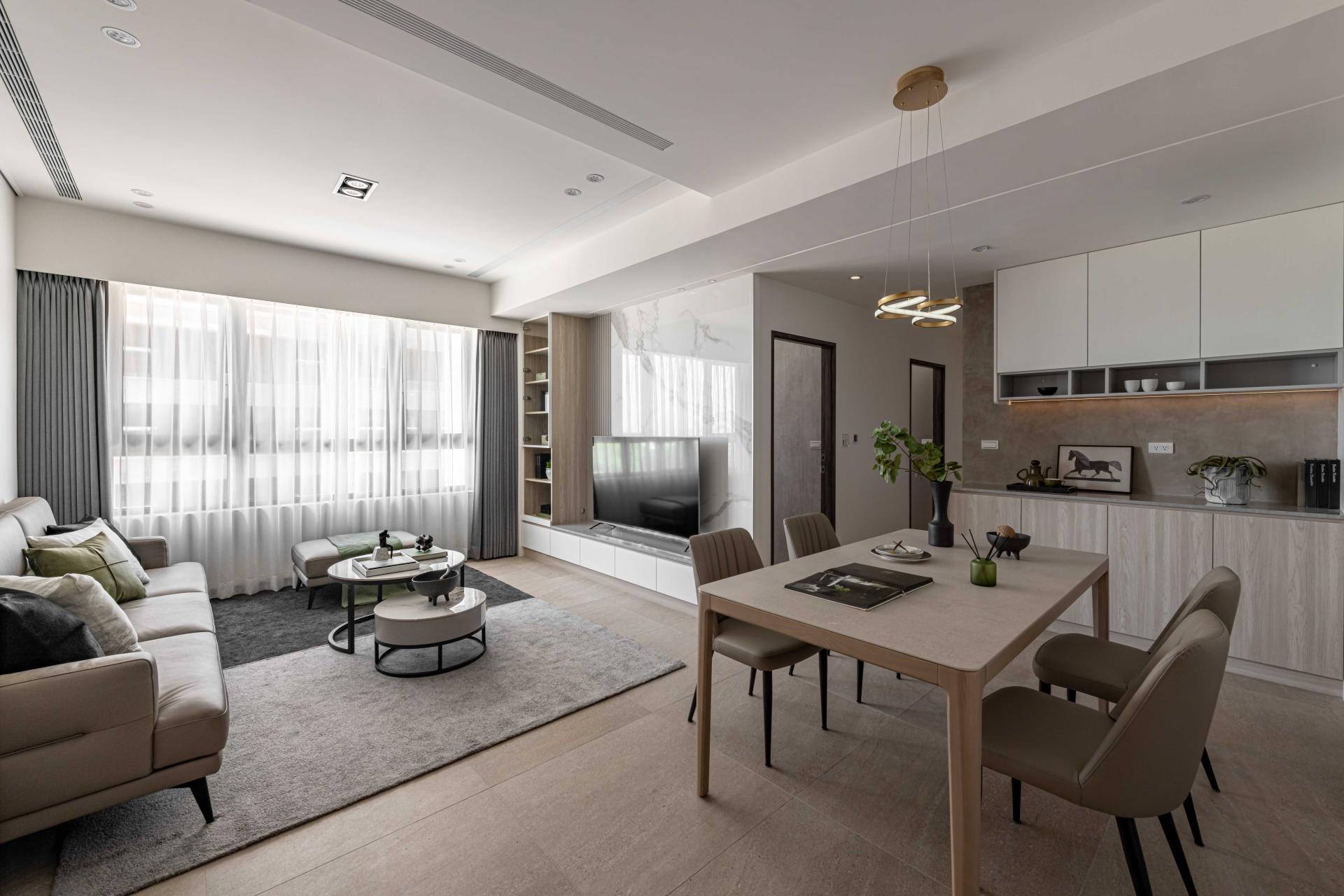 The main public space is bright and welcoming, featuring a three-tiered ceiling that conceals mechanical systems while enhancing the room’s vertical depth. Sand-beige matte floor tiles span the space, echoing the stone-patterned TV wall and warm wood cabinetry, cultivating a tranquil ambience with Nordic and Muji-style influences.