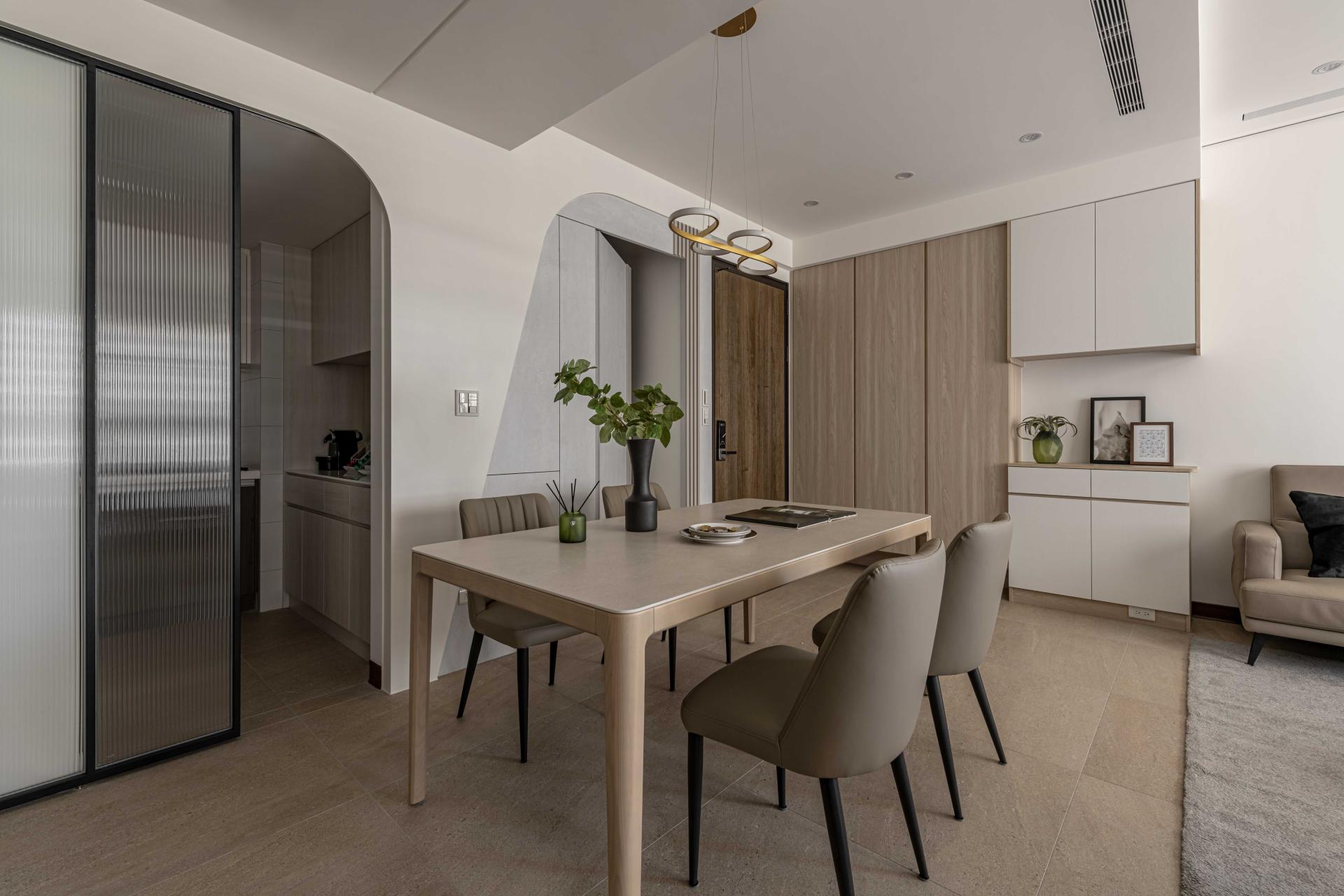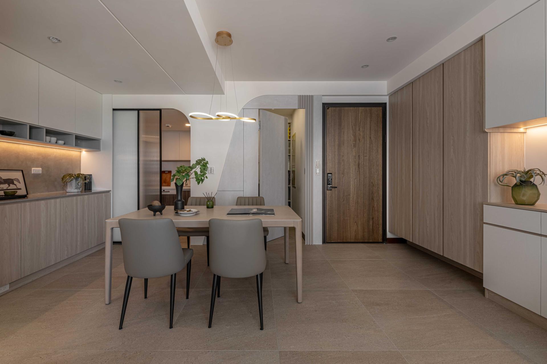 The entry foyer blends naturally into the interior, flanked by a tall shoe cabinet and an independent storage room. The entrance to the storage room and the adjacent sliding kitchen door perfectly align with an asymmetrical V-curve in the ceiling. This motif, enhanced with contrasting colors and dimensional shifts, not only integrates the dining area’s focal wall into a cohesive plane, but also suggests a metaphor for uplift: outstretched wings, thriving trees, and victorious ascent.