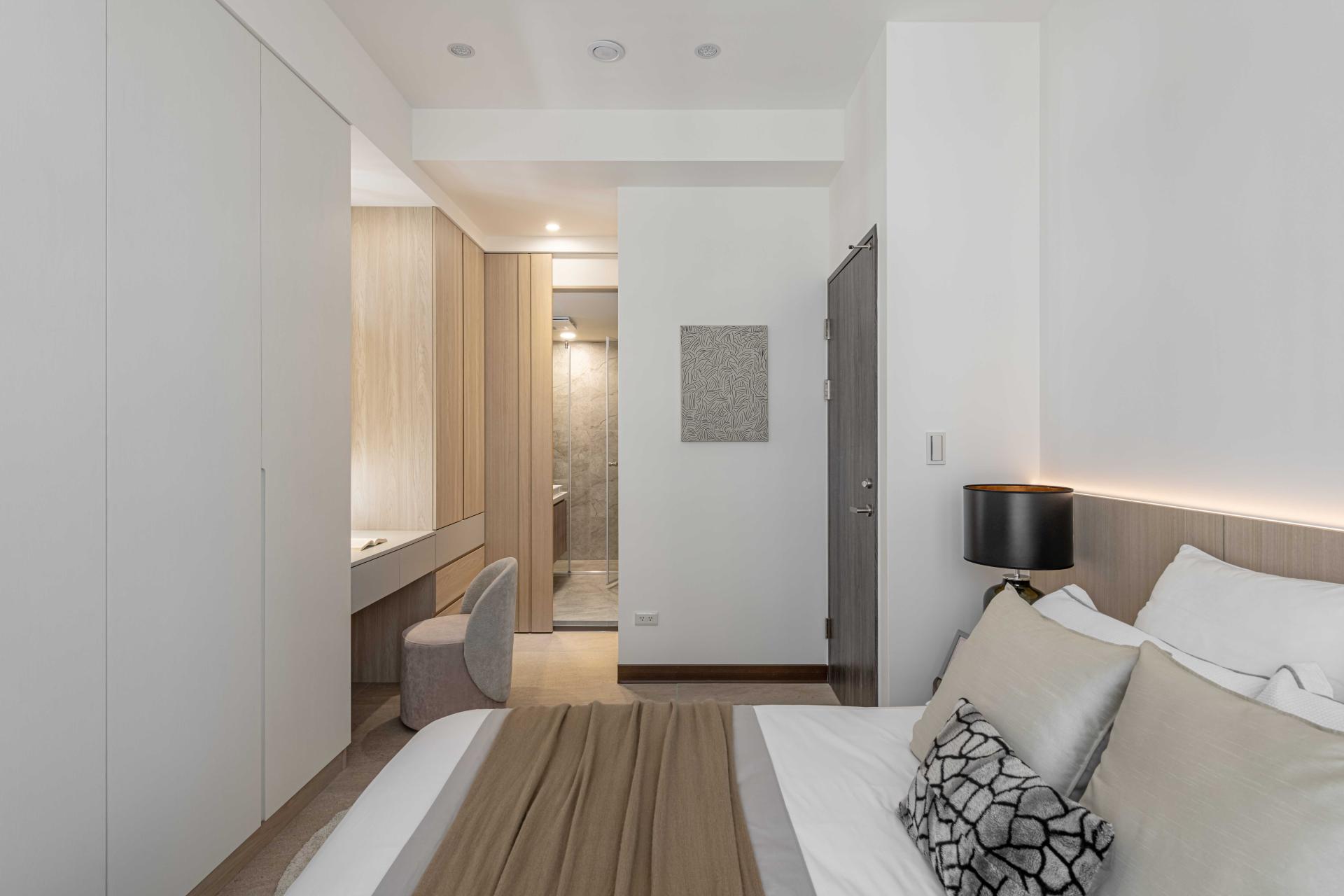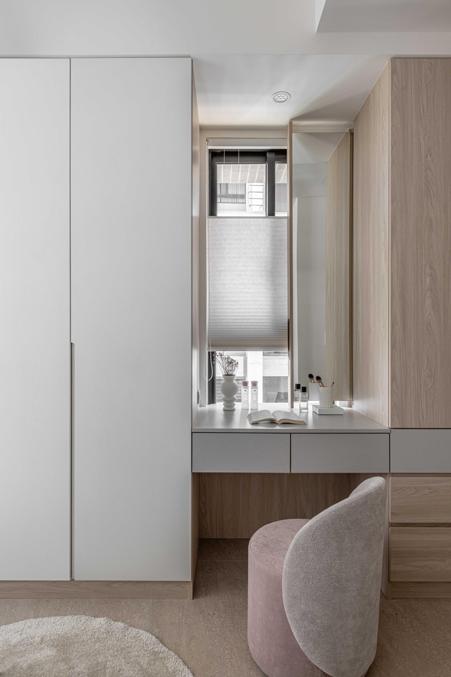 A refined wood sliding door leads into the bathroom, forming a seamless visual continuation of the wardrobe wall—a quiet triumph in aesthetic beauty and utility!