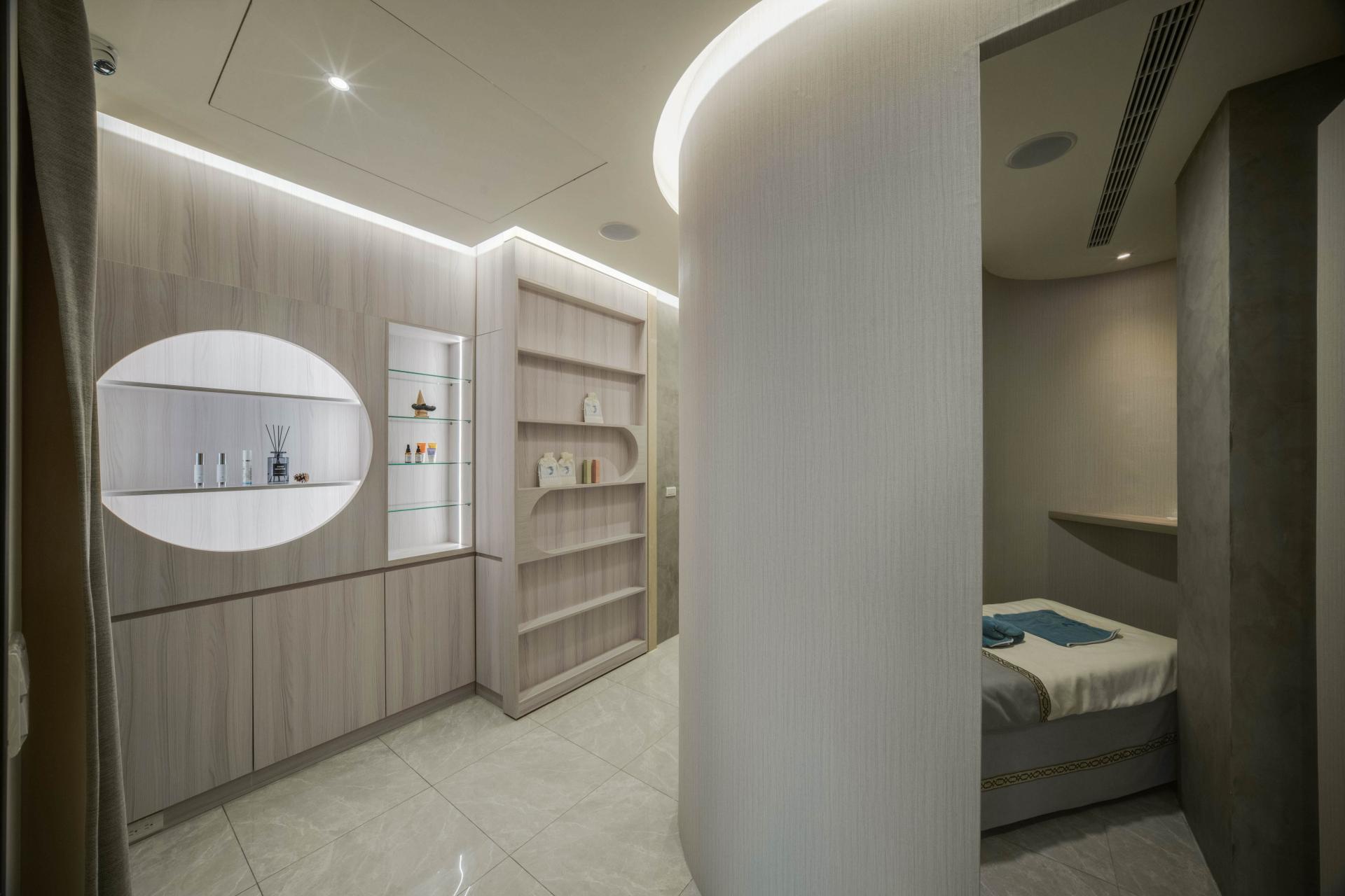 The first-floor reception area boasts an inviting blend of light blue, white, and natural wood elements, carefully curated to cultivate a fresh and professional brand image. As you enter, the gracefully curved ceilings and low walls, complemented by soft, indirect lighting, immediately soften the overall appearance, creating a light and comfortable atmosphere. Nestled within this inviting space, the treatment area is thoughtfully enclosed by elegant curved partitions that not only enhance privacy but also elevate customer comfort. Transitioning to the upper residential area, one will notice that the design language continues seamlessly; the gentle curves are paired with natural elements and earthy color tones, fostering a warm and cozy living environment that beckons relaxation. Moreover, the kitchen is accentuated by sophisticated glass sliding doors, strategically designed to minimize the spread of cooking odors, ensuring a pleasant ambiance throughout the home. Overall, this thoughtfully designed space harmoniously balances aesthetics and functionality, creating a truly welcoming experience.