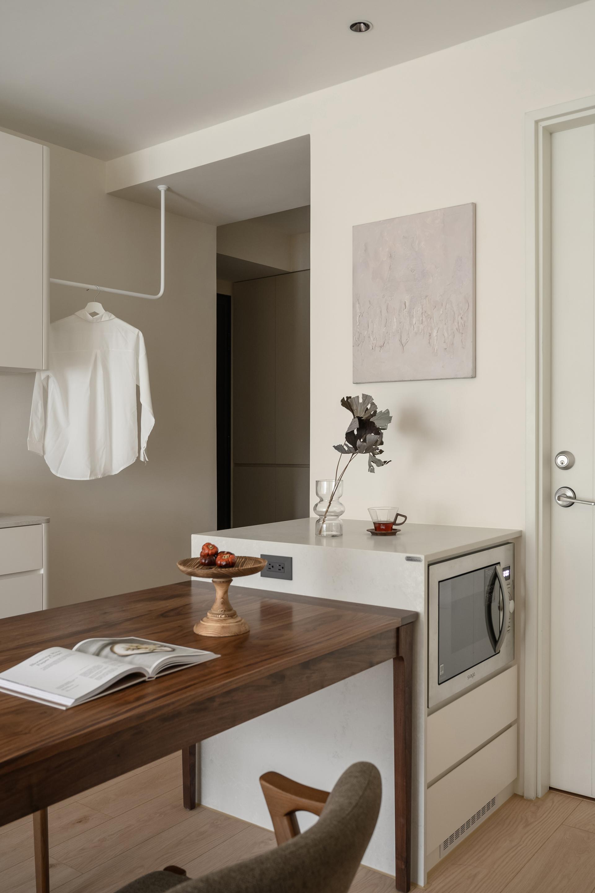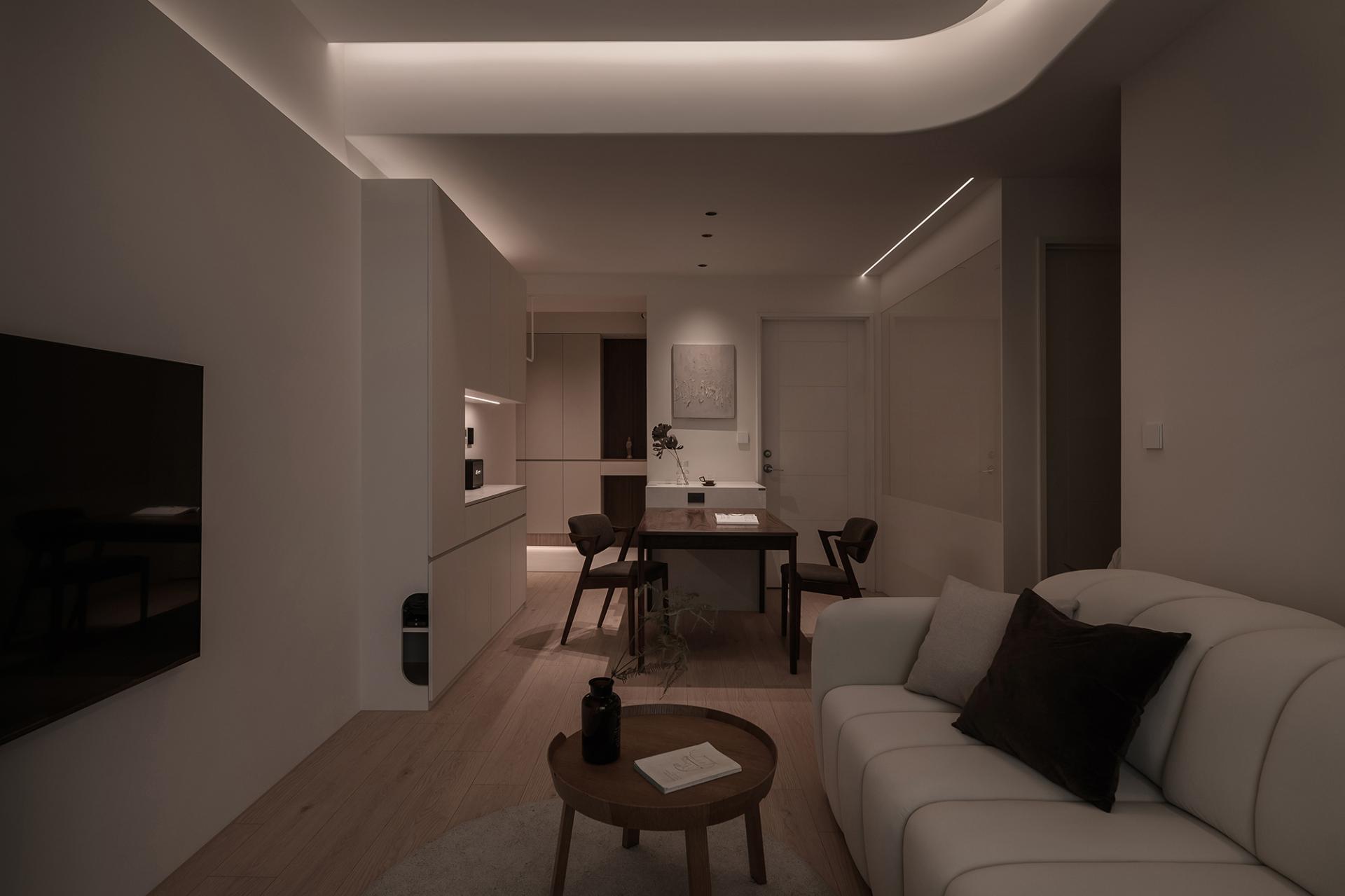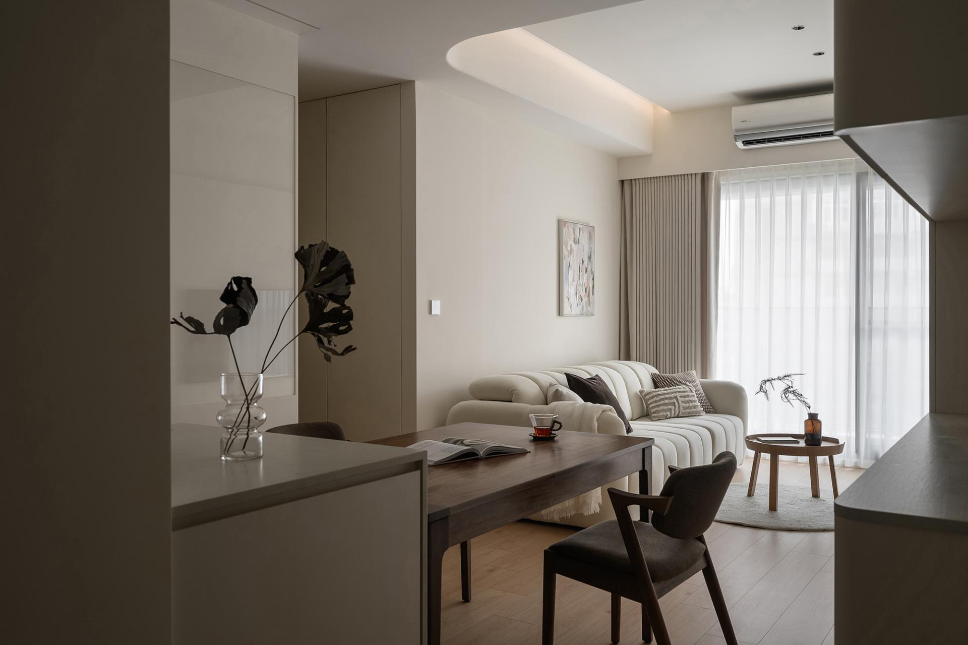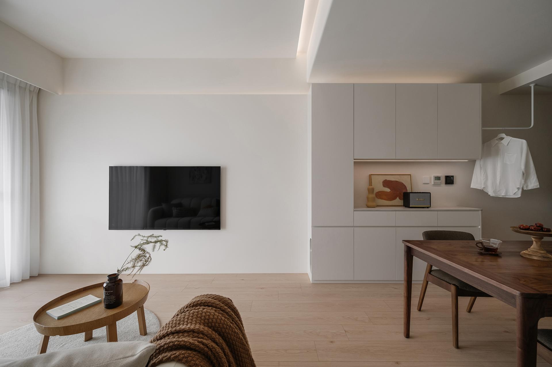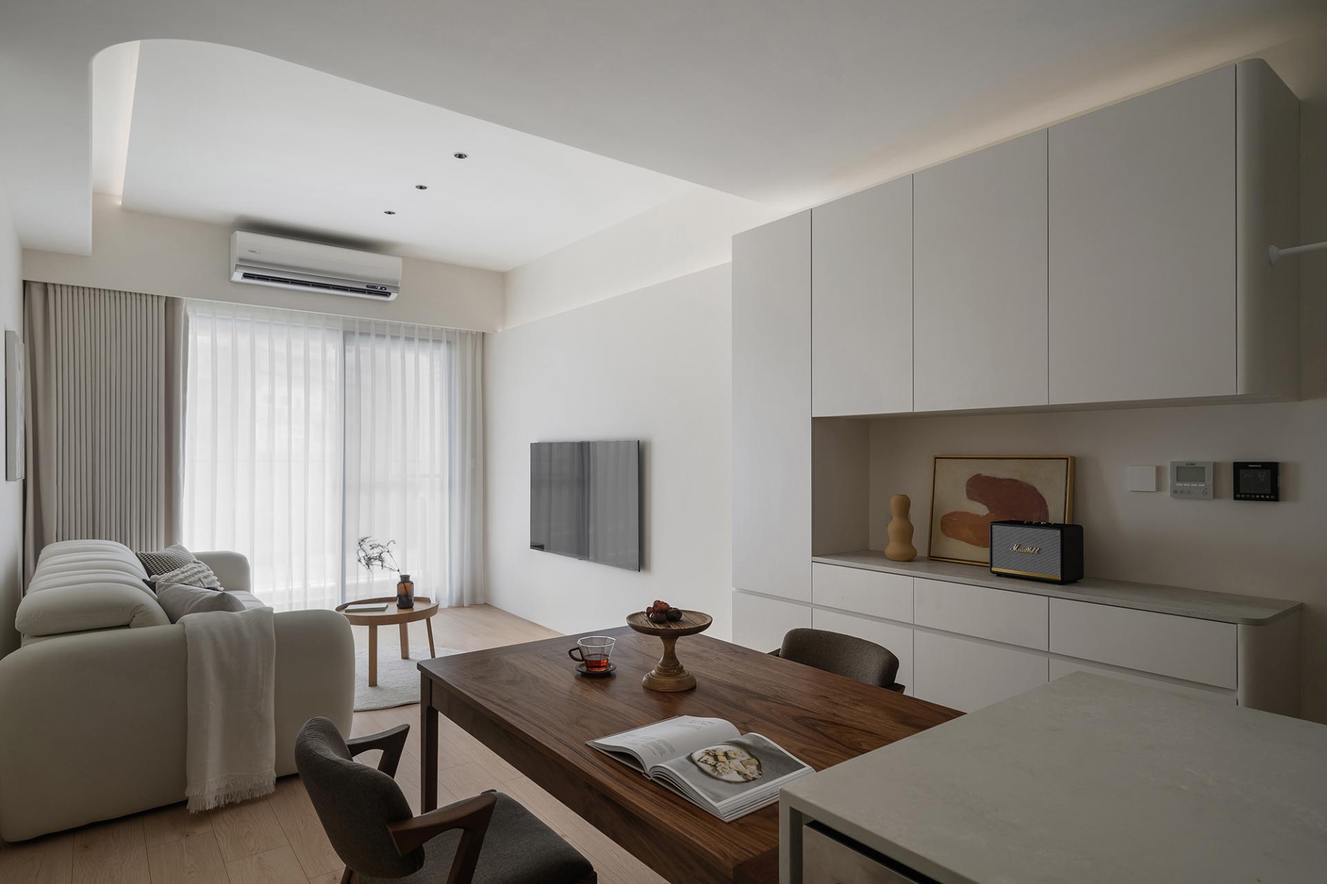 In the shared living area, the design team has innovatively moved away from the conventional TV wall concept, opting instead to seamlessly integrate audiovisual equipment into the base of the cabinet on the right. This thoughtful approach, paired with a curved openwork design, not only facilitates effective heat dissipation but also enhances the overall aesthetic with a softer visual appeal. As one enters the space, one will be greeted by a sideboard that includes an extra coat rack. This addition thoughtfully maintains the openness of the area while serving as a convenient temporary storage solution for dirty clothes. Furthermore, the carefully planned lighting configuration stretches horizontally across the living and dining areas, offering a warm glow that softens the structural volume and naturally guides the flow of movement.