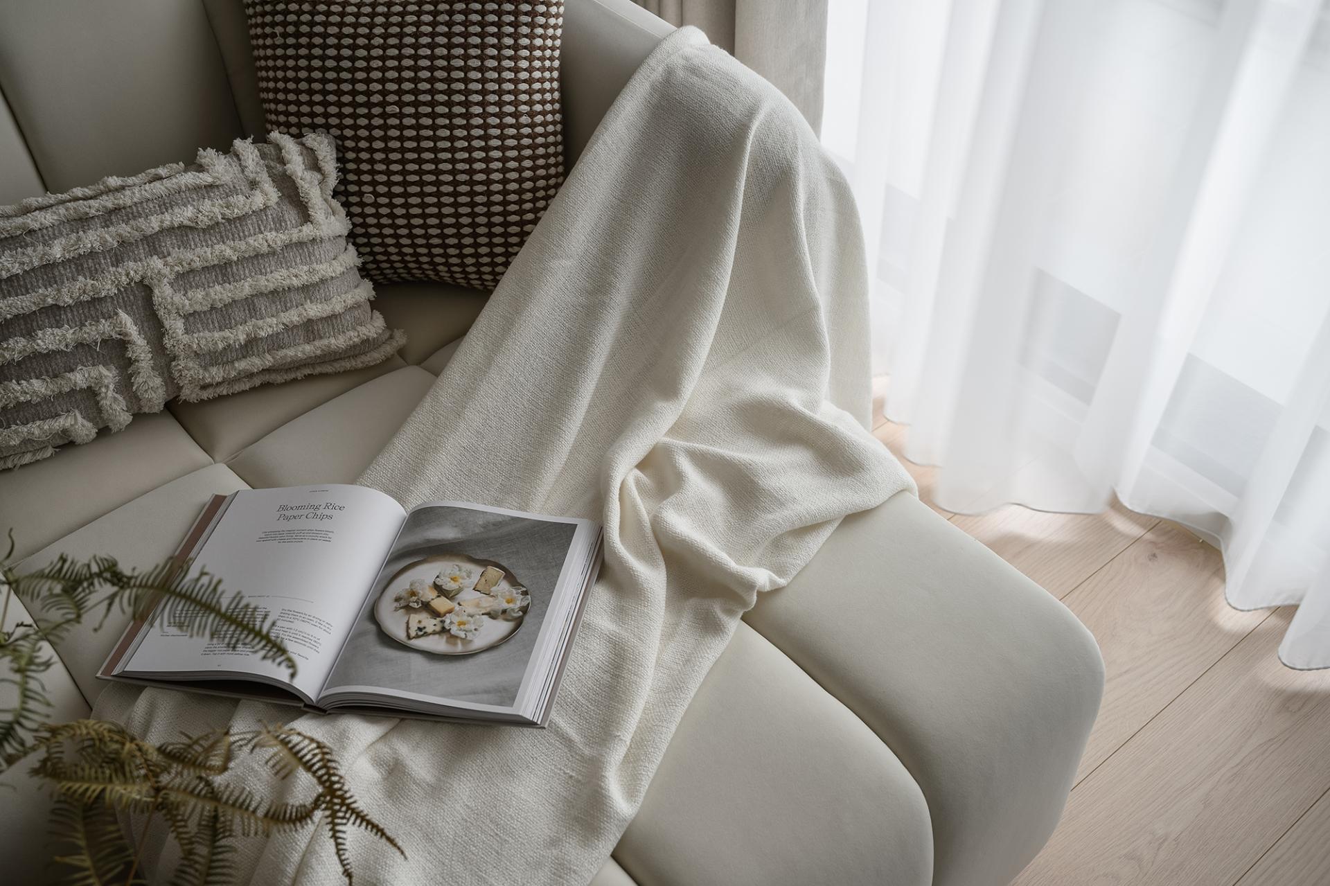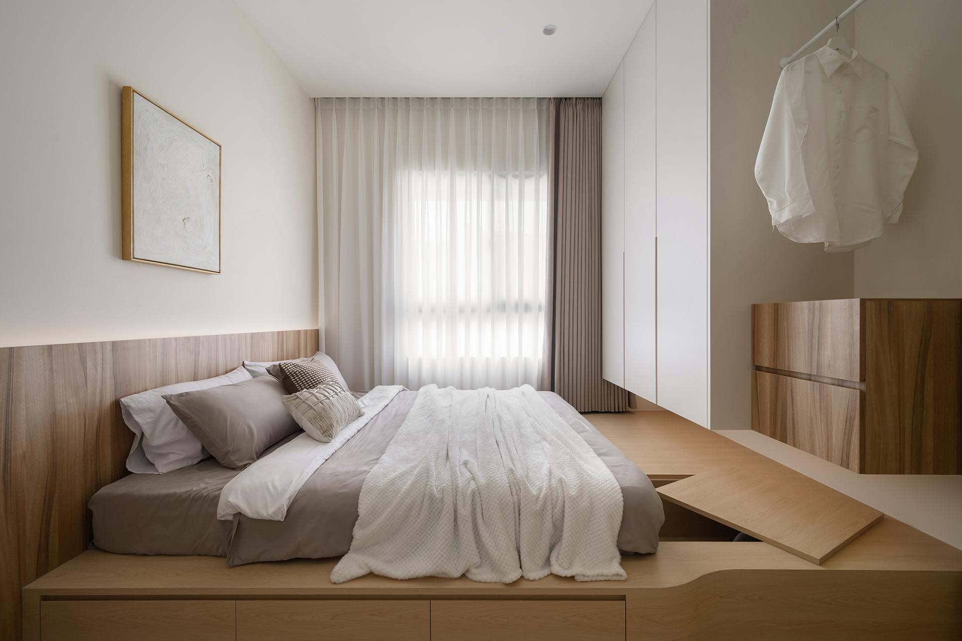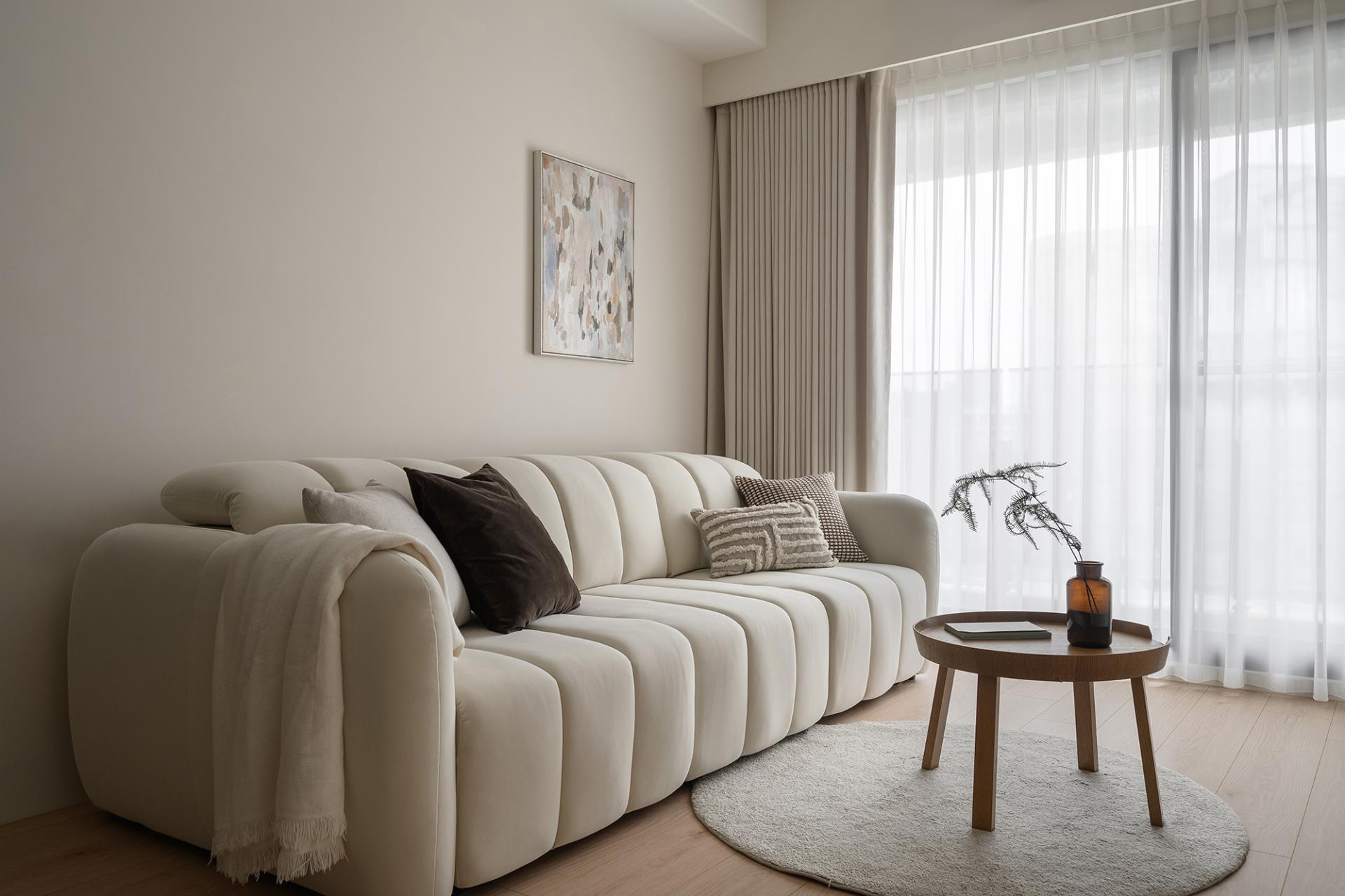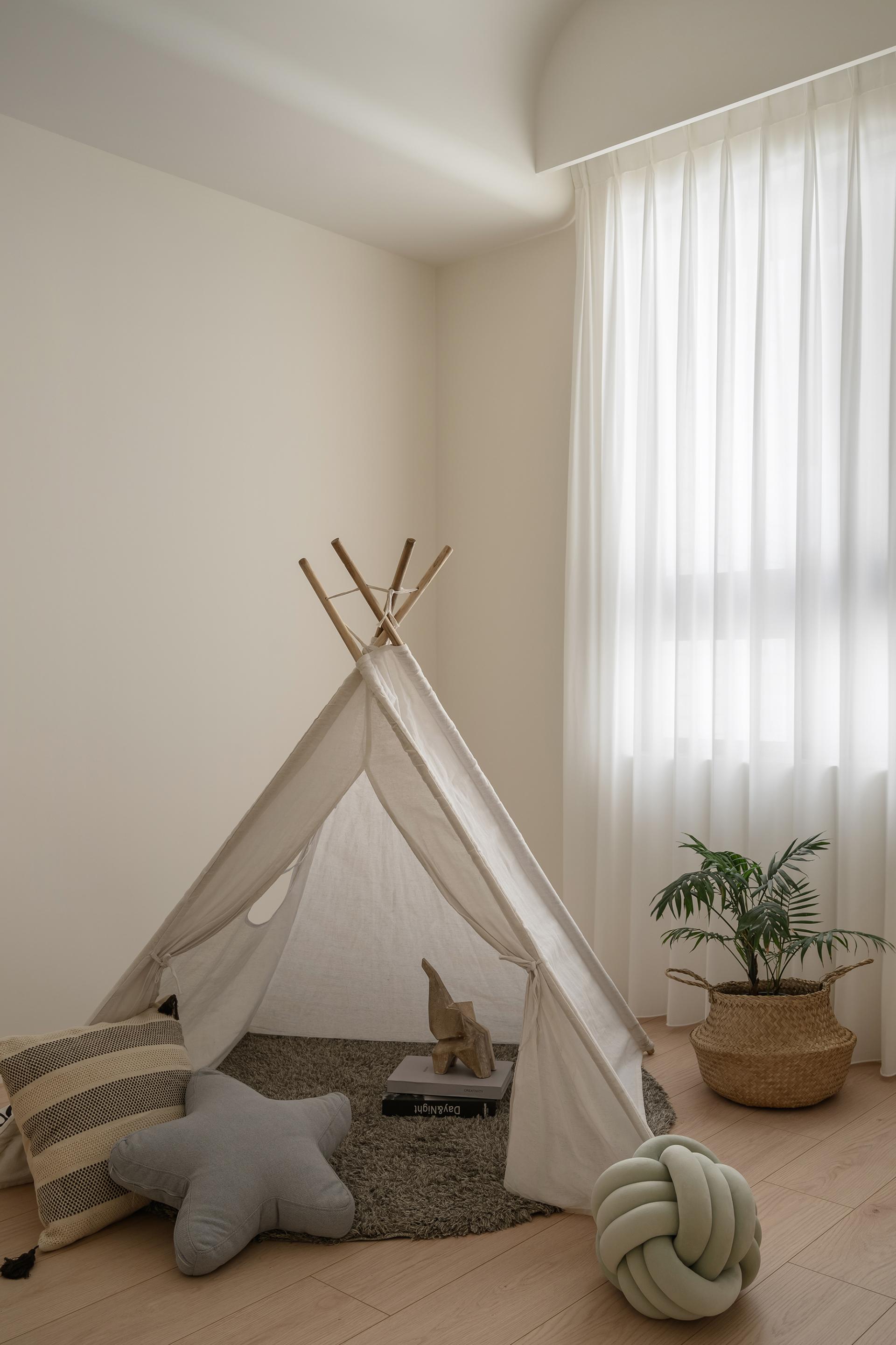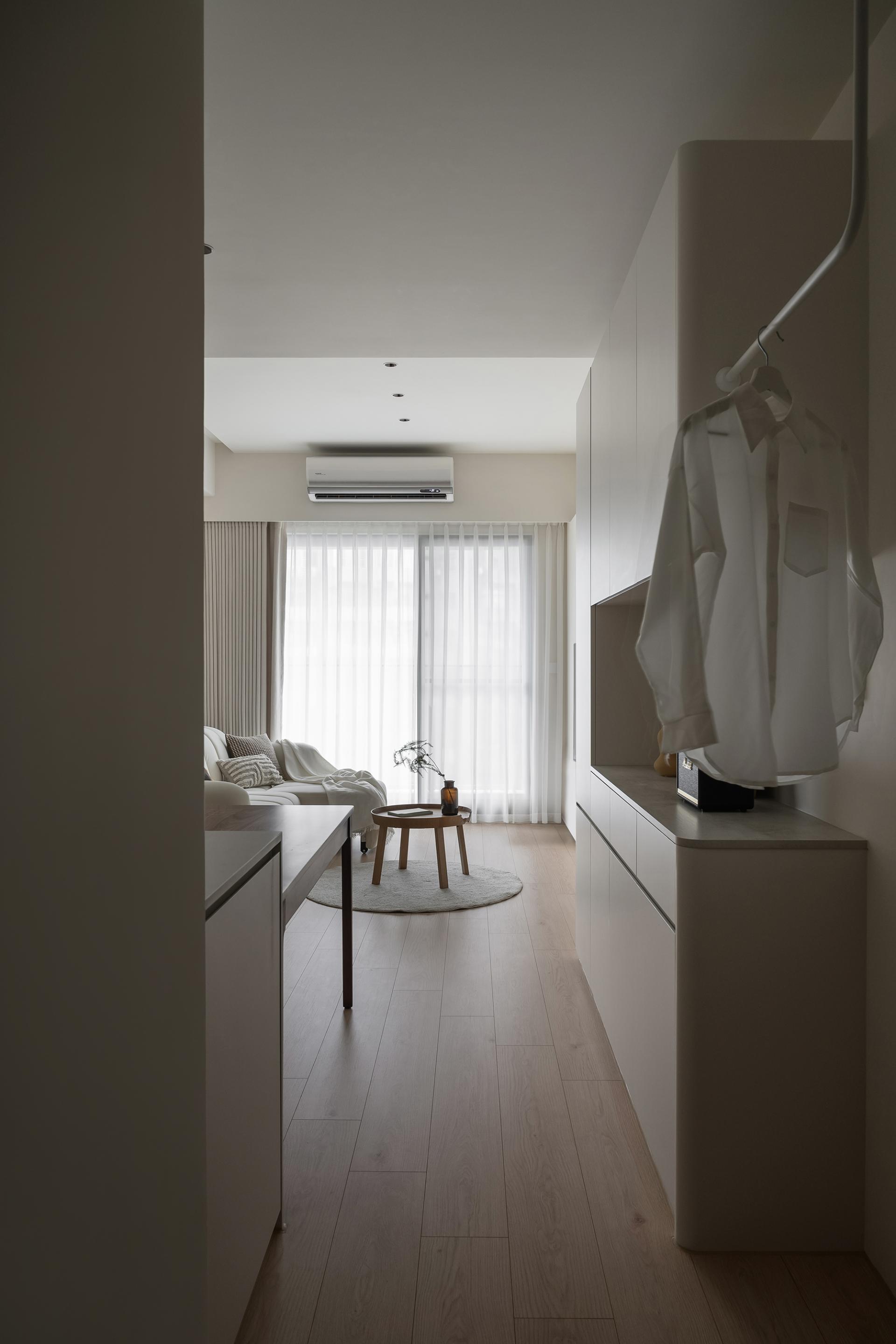 In the shared living area, the design team has innovatively moved away from the conventional TV wall concept, opting instead to seamlessly integrate audiovisual equipment into the base of the cabinet on the right. This thoughtful approach, paired with a curved openwork design, not only facilitates effective heat dissipation but also enhances the overall aesthetic with a softer visual appeal. As one enters the space, one will be greeted by a sideboard that includes an extra coat rack. This addition thoughtfully maintains the openness of the area while serving as a convenient temporary storage solution for dirty clothes. Furthermore, the carefully planned lighting configuration stretches horizontally across the living and dining areas, offering a warm glow that softens the structural volume and naturally guides the flow of movement.
