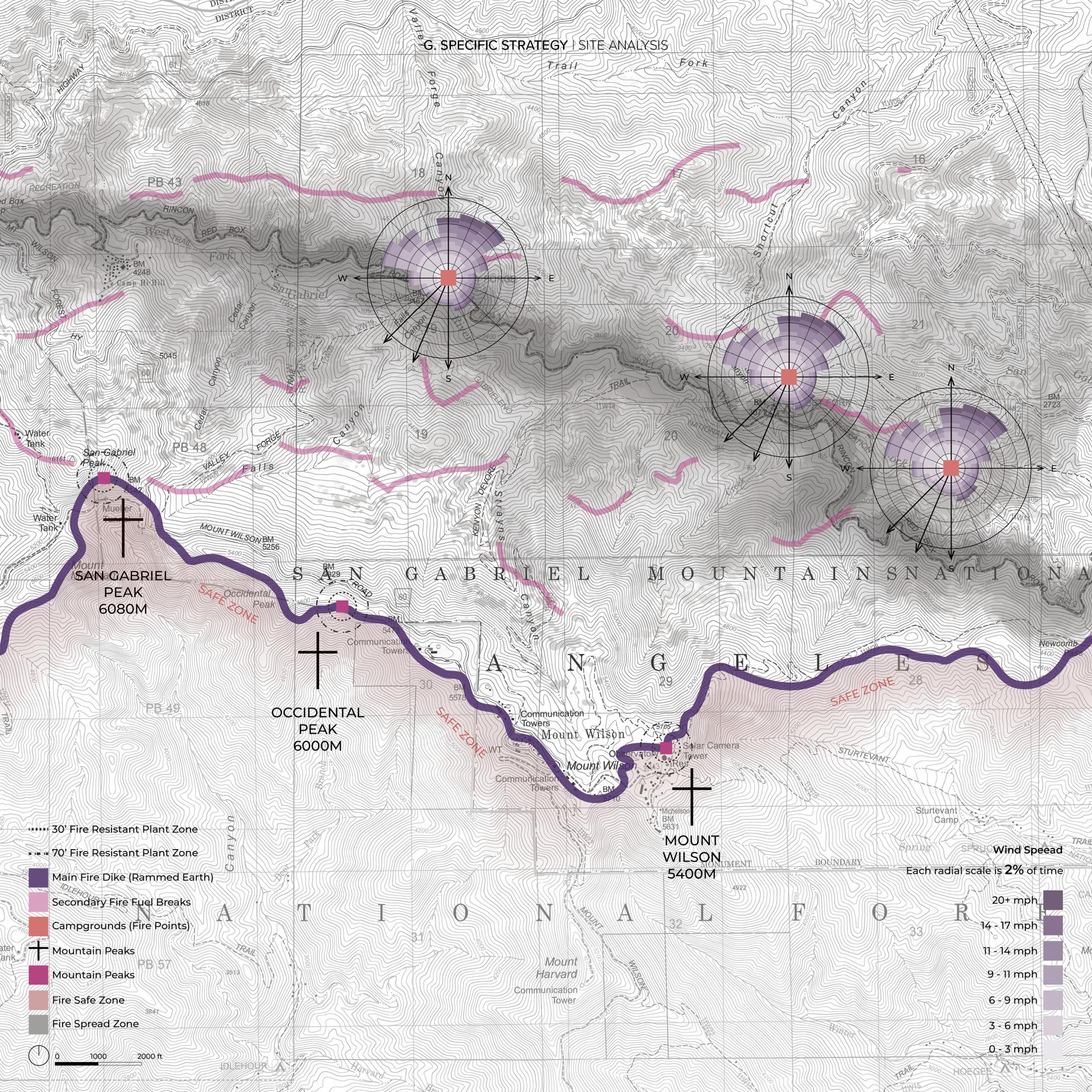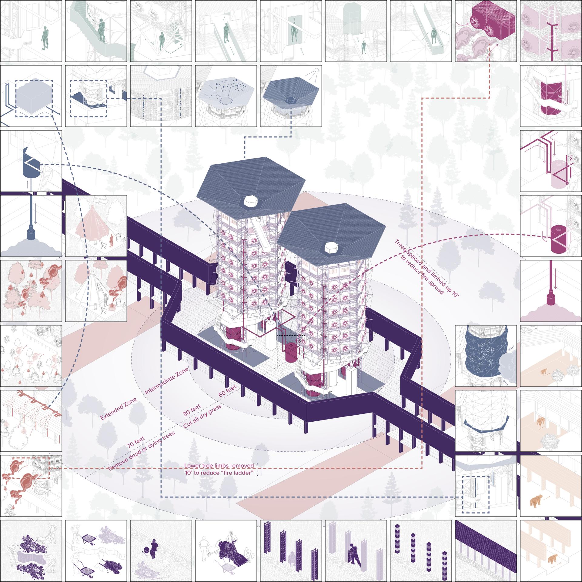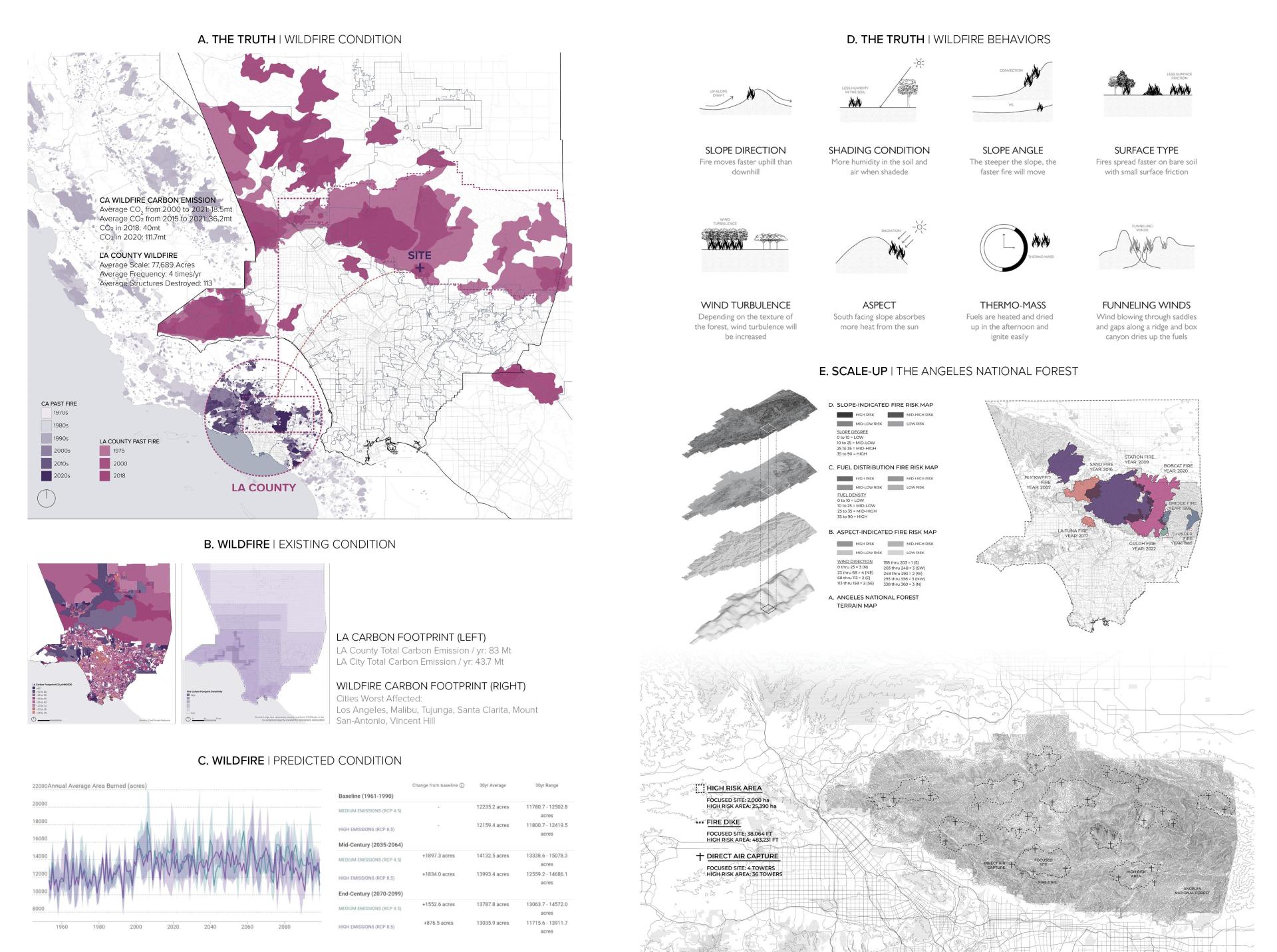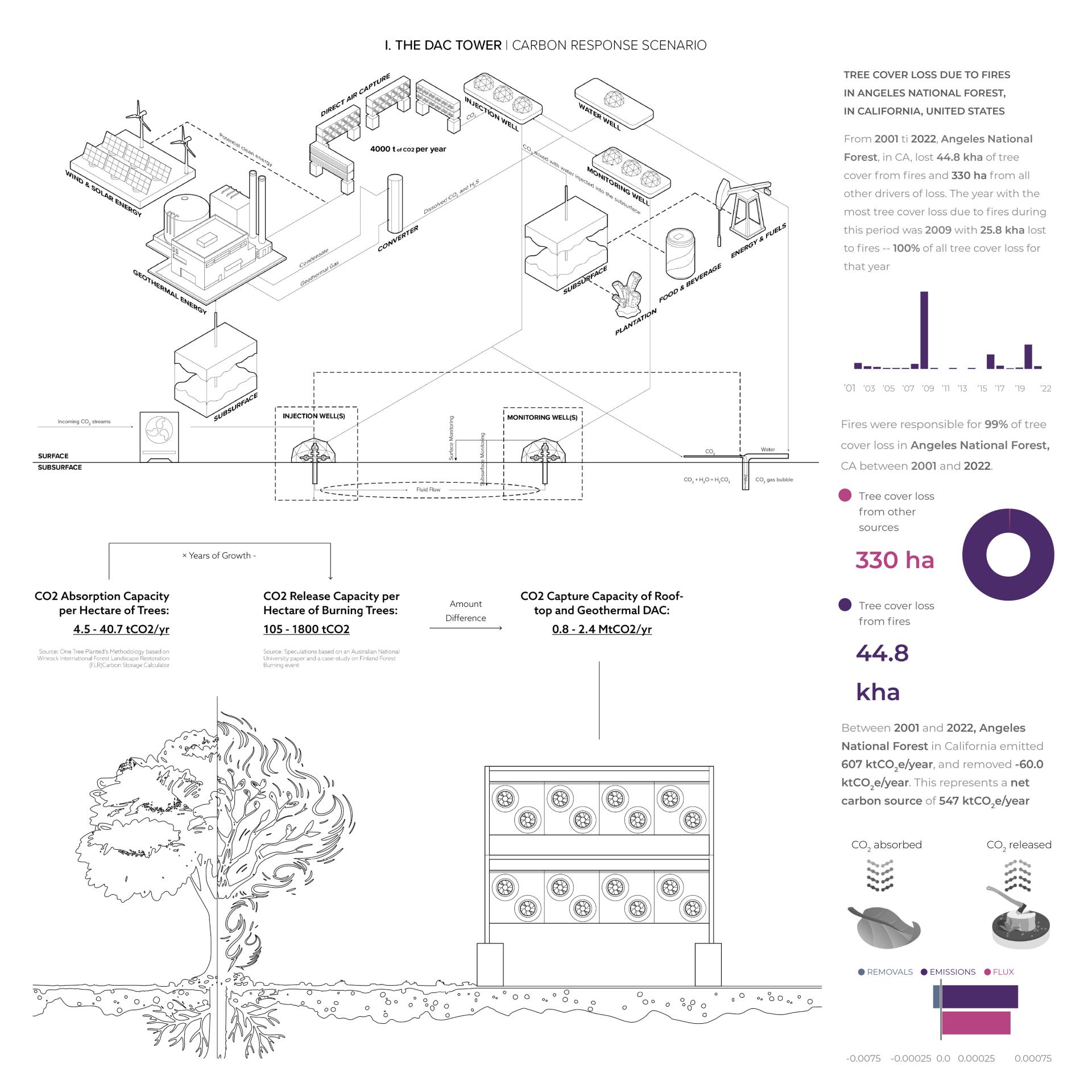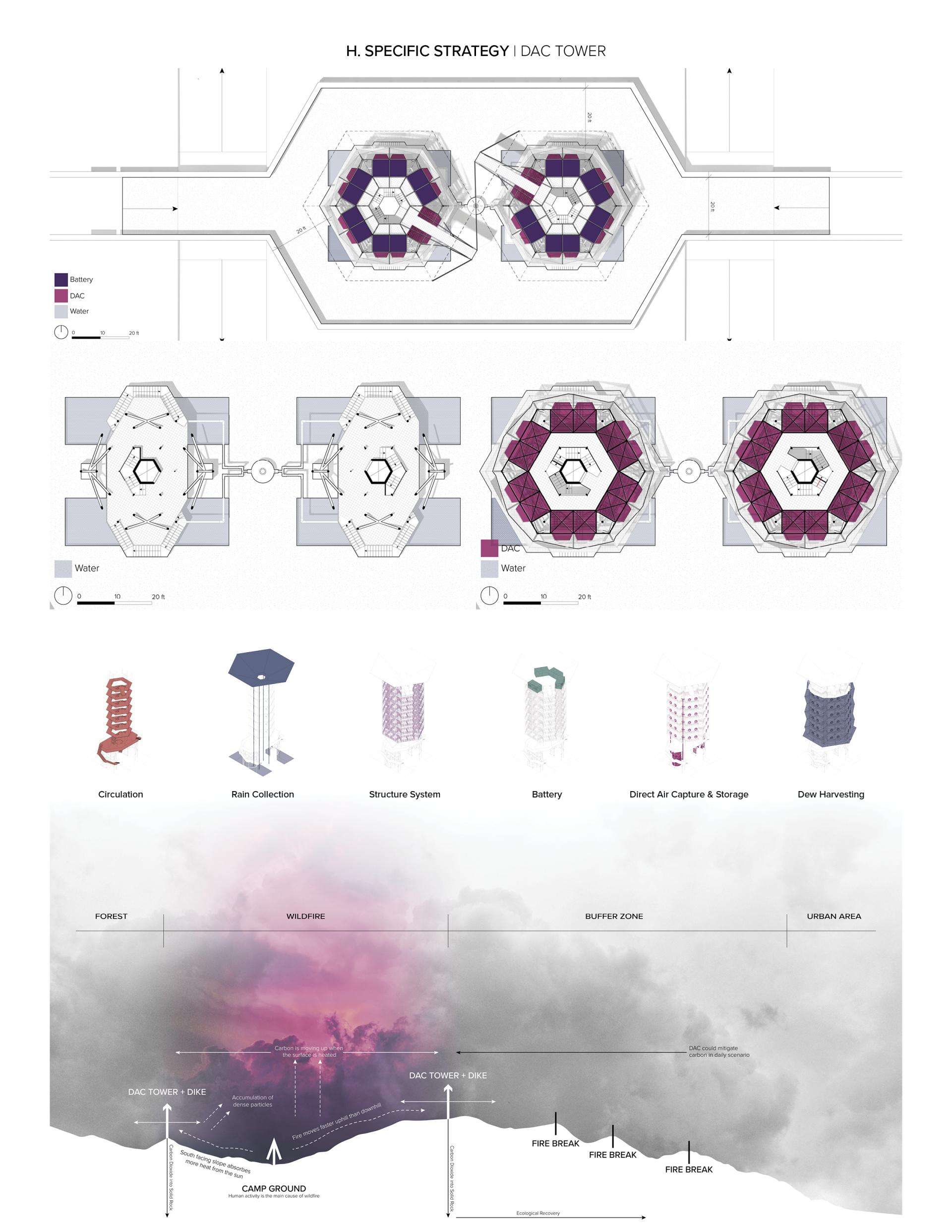 The project introduces an integrated ecological infrastructure composed of fire breaks, a rammed-earth fire dike, and a pair of Direct Air Capture (DAC) towers in the wildfire-prone Angeles National Forest, California. Beyond fire containment, the towers serve as multifunctional climate infrastructures: they capture atmospheric CO₂, harvest fog and rainwater, generate solar energy, and inject CO₂-water mixtures into subsurface storage. Public engagement is central—visitors can access elevated watchtowers and educational platforms, while ecological corridors ensure safe animal migration. These hybrid systems combine fire resilience, carbon mitigation, water management, and community participation into one replicable typology.