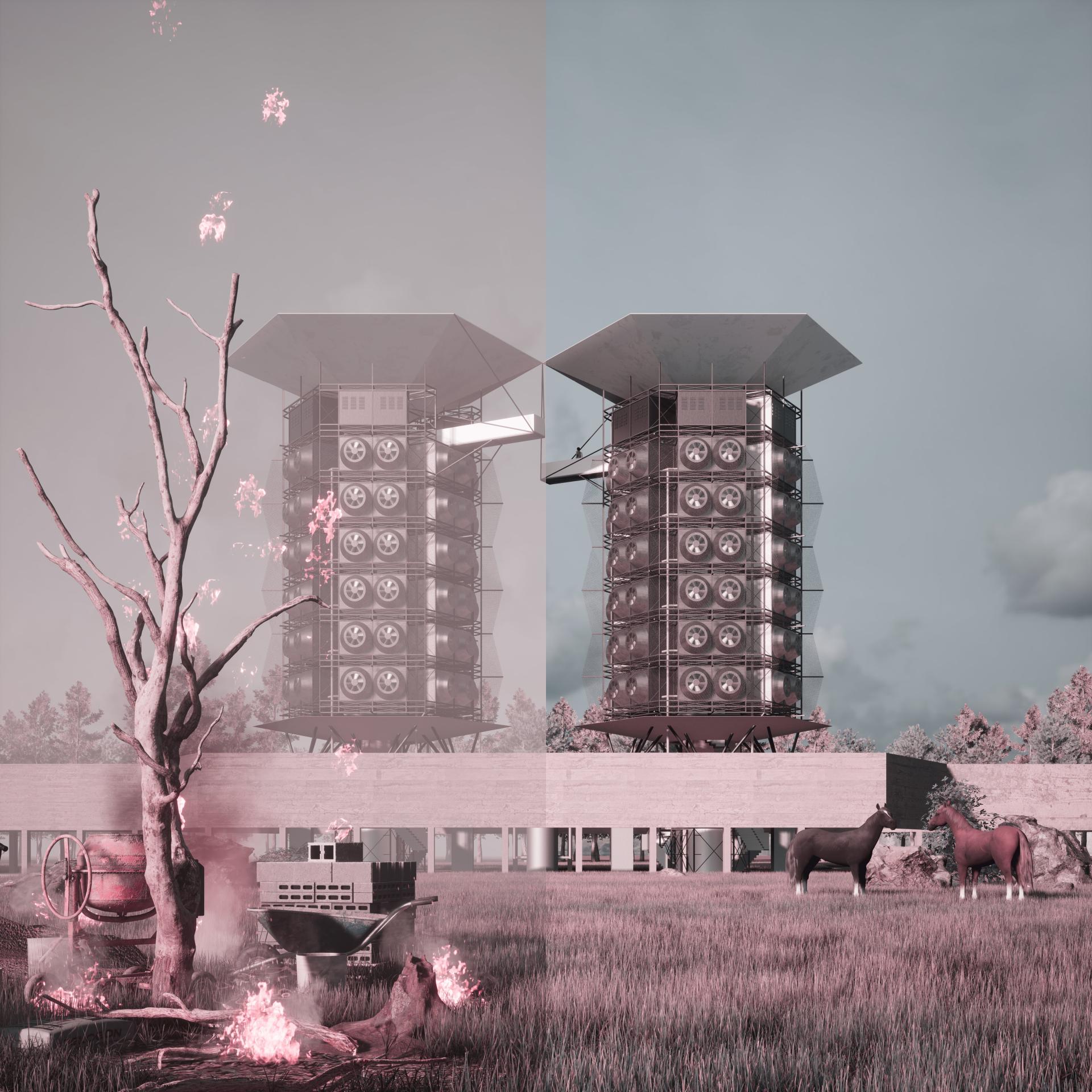 The project introduces an integrated ecological infrastructure composed of fire breaks, a rammed-earth fire dike, and a pair of Direct Air Capture (DAC) towers in the wildfire-prone Angeles National Forest, California. Beyond fire containment, the towers serve as multifunctional climate infrastructures: they capture atmospheric CO₂, harvest fog and rainwater, generate solar energy, and inject CO₂-water mixtures into subsurface storage. Public engagement is central—visitors can access elevated watchtowers and educational platforms, while ecological corridors ensure safe animal migration. These hybrid systems combine fire resilience, carbon mitigation, water management, and community participation into one replicable typology.