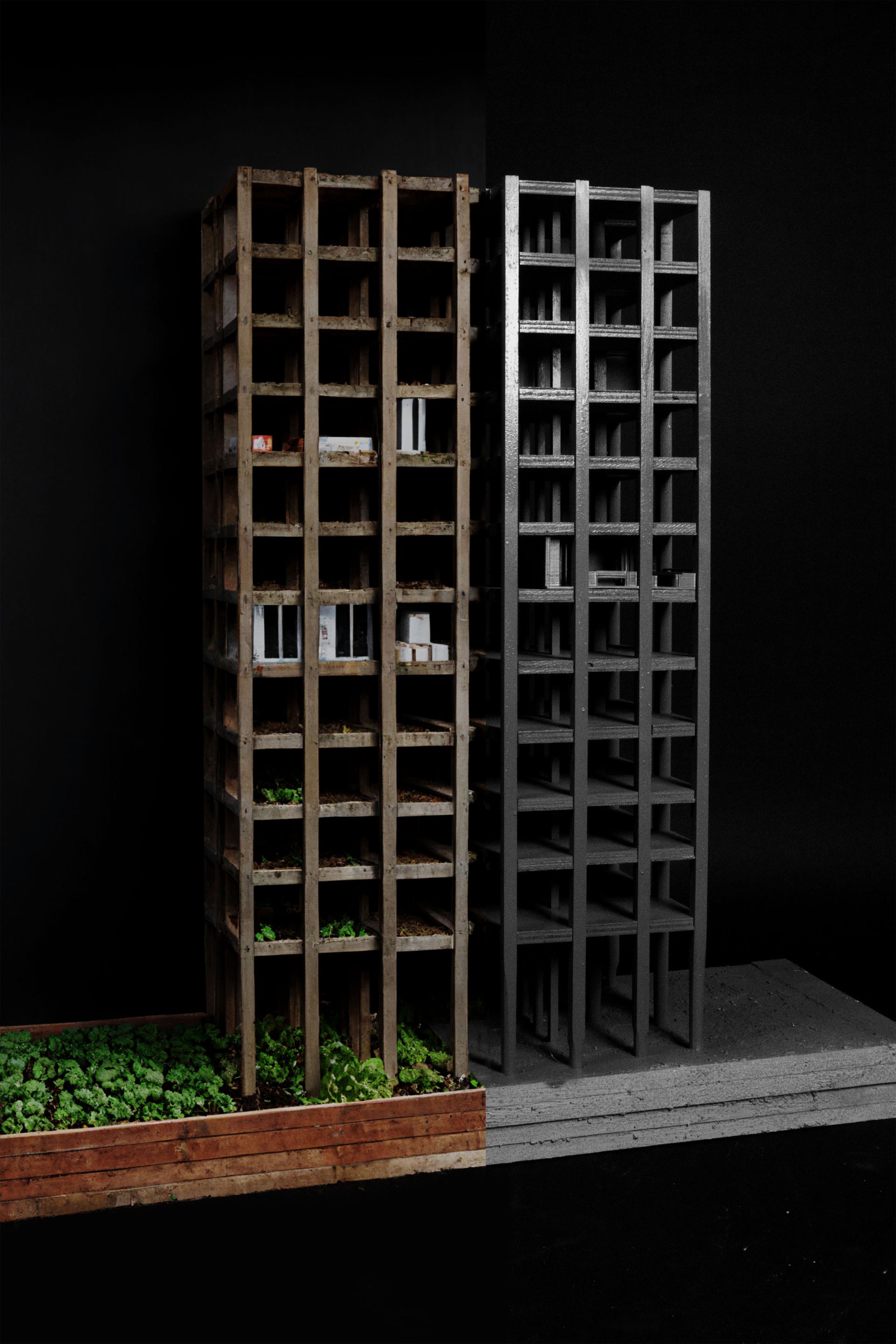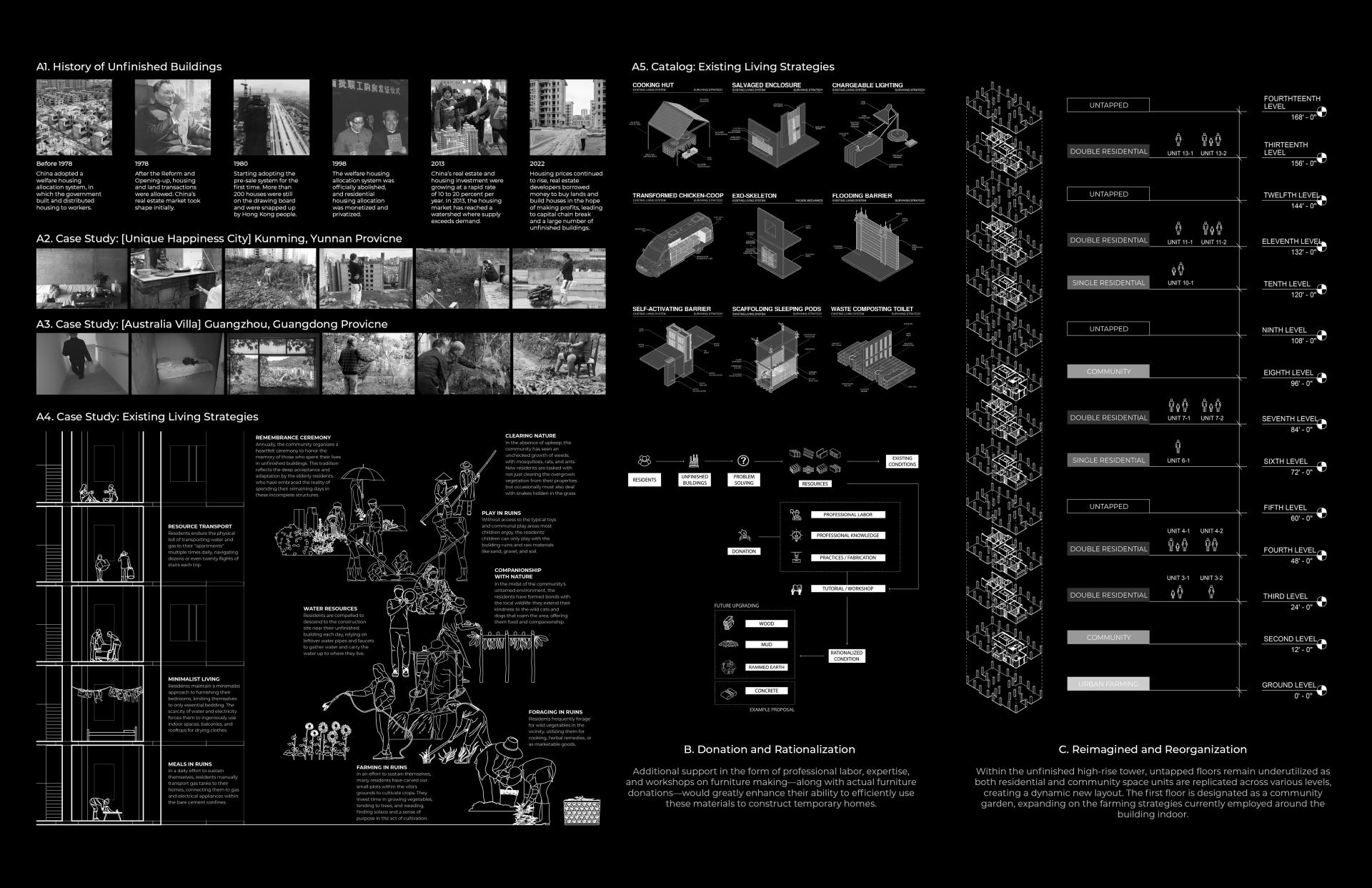 This project proposes an architectural and social strategy to reframe the unfinished not as failure, but as opportunity. Using a case study in Chongqing, it reimagines an abandoned tower as a testbed for adaptive reuse—where spatial dignity can be rebuilt from within. The proposal emphasizes the use of materials readily available on-site—such as soil, timber scraps, concrete debris—to construct essential domestic infrastructure. Residents shape their environments directly, crafting beds, kitchens, and storage through in-situ concrete and basic tools.