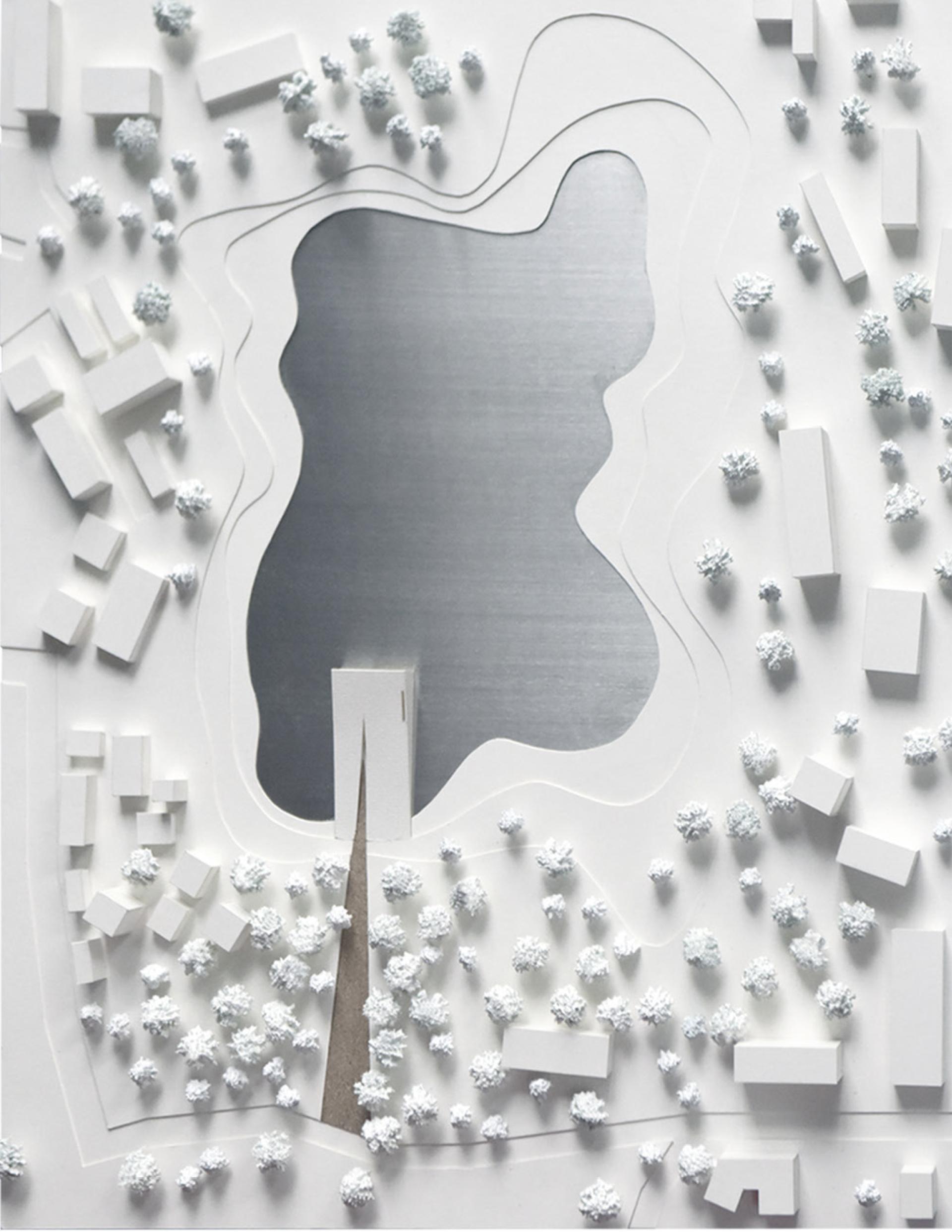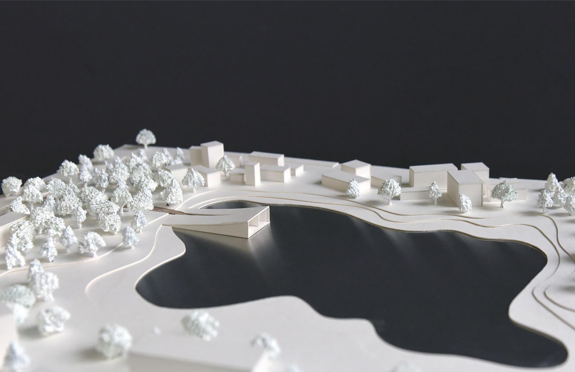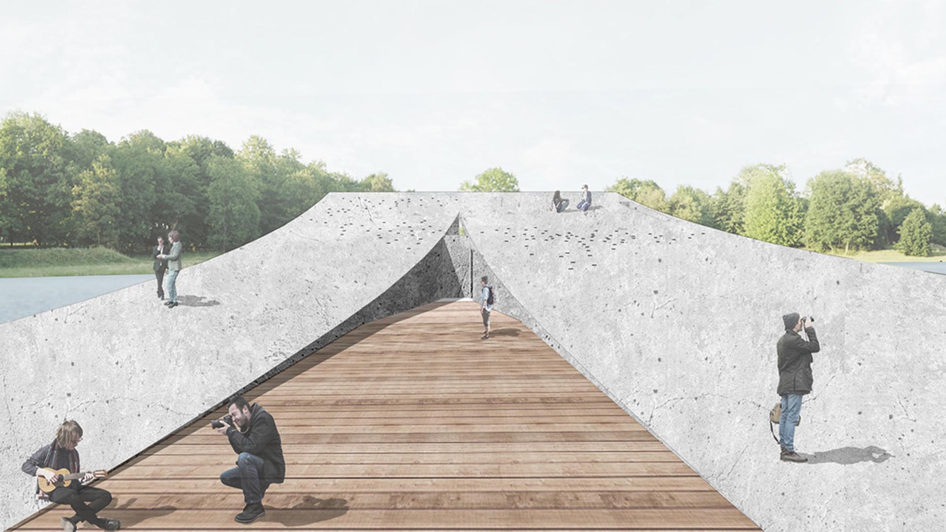 The structure is cast in raw concrete, emphasizing permanence, solemnity, and weight. The central exhibition halls and projection room provide space for remembrance and education, while the folded roof form invites public gathering and contemplation on its upper surface. Walking atop the roof, visitors are offered expansive views of the lake, reinforcing the idea of peace in contrast to the memory of violence beneath.