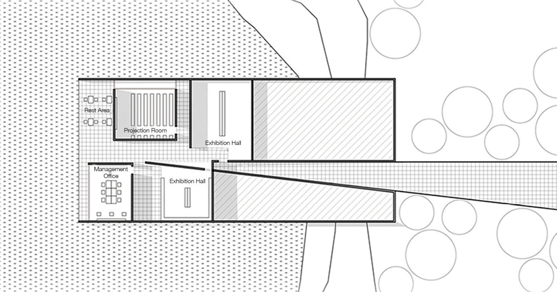 The building emerges as a geometric incision in the landscape: a triangular cut into the earth that extends over the lake. The entry sequence compels visitors to descend into the space, a symbolic descent into history and reflection. The roof is punctured by circular holes, evoking bullet marks, but as sunlight filters through, these perforations transform into symbols of renewal—light emerging from destruction.
